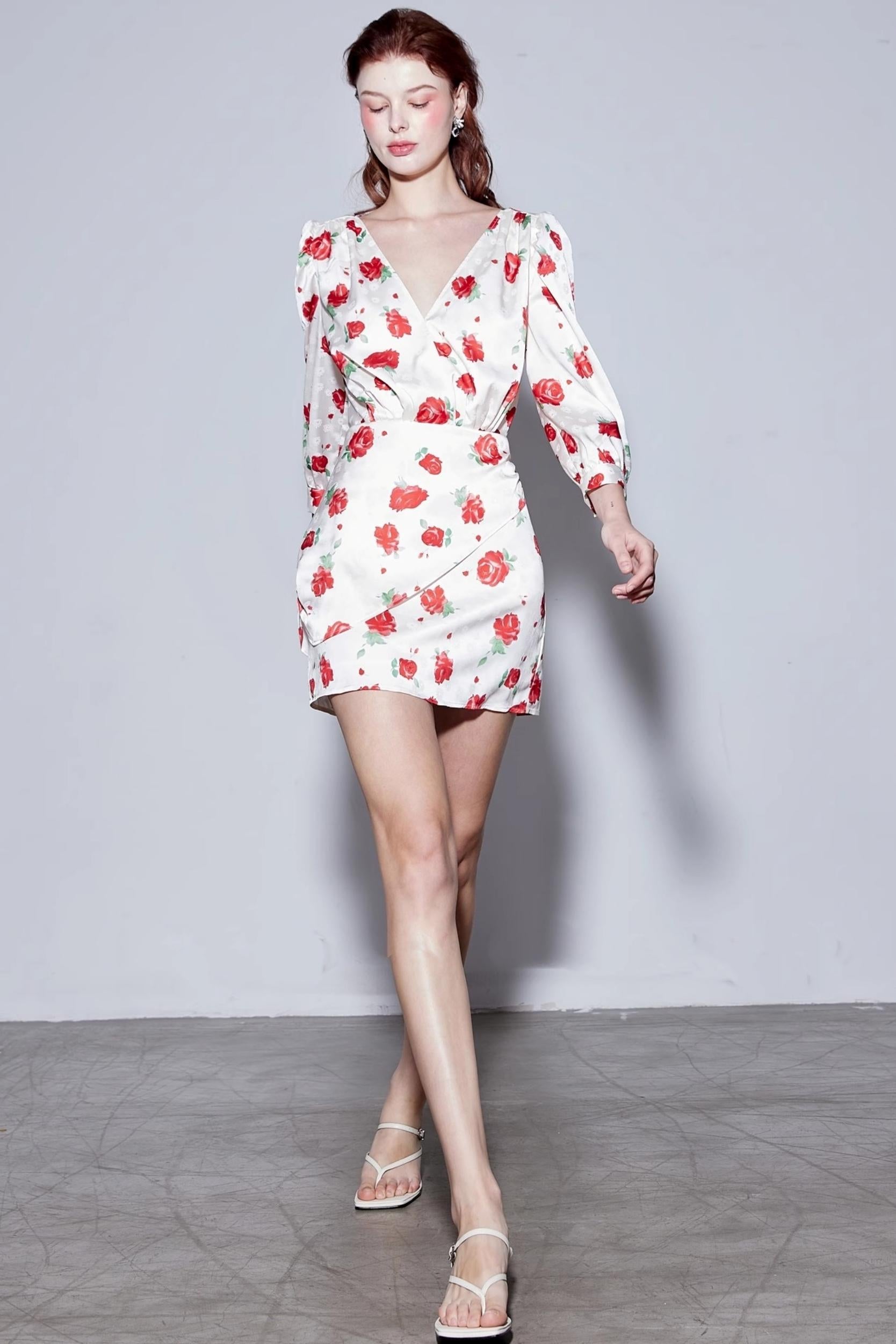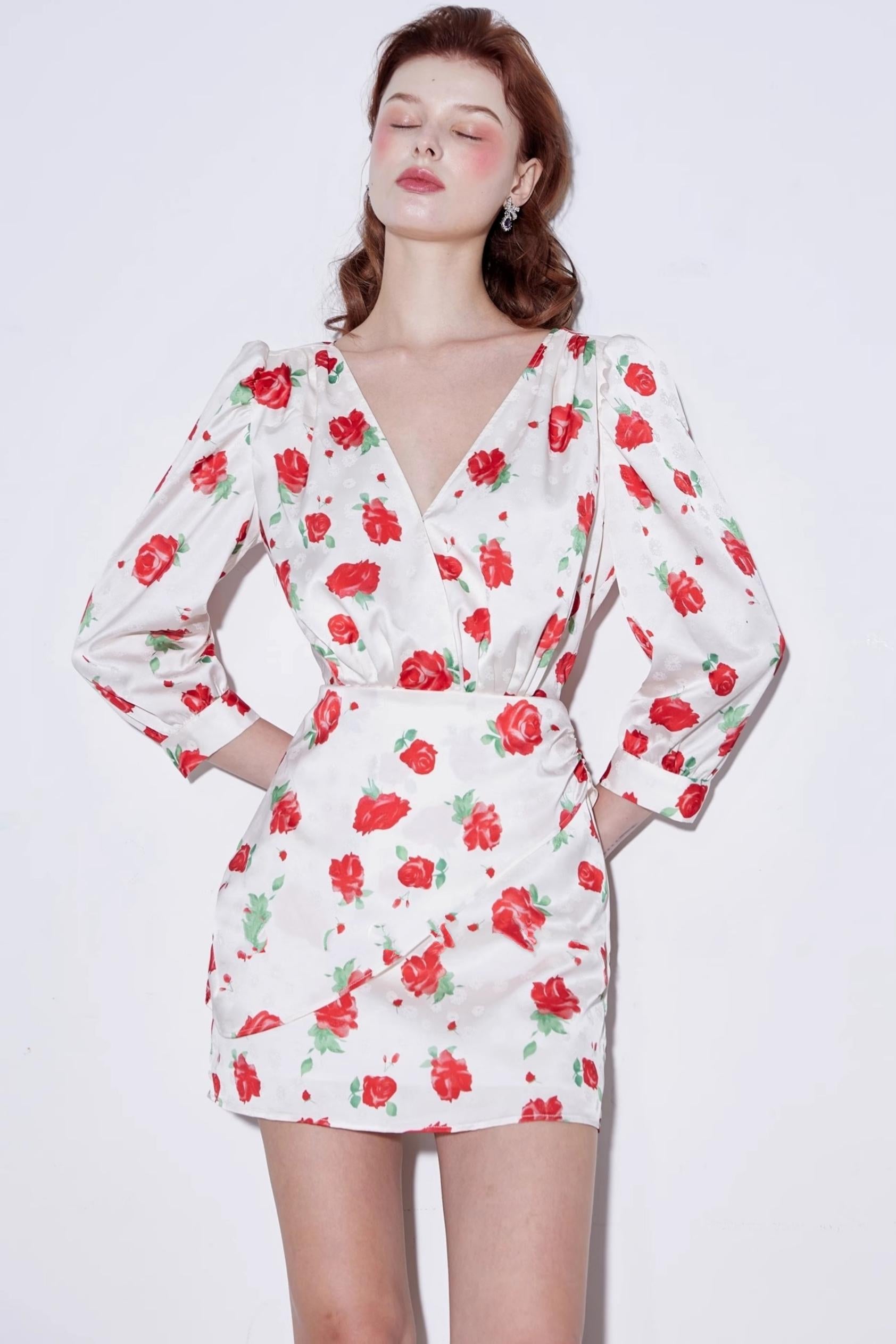 Satin Rose Jacquard V-Neck Dress