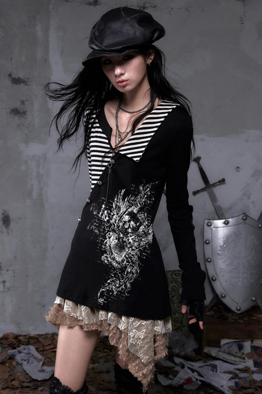 줄무늬 후드 티셔츠, 레이스 반바지, 핫 다이아몬드 탑, 세트, 다재다능, 사계절, 빈티지 아가씨들