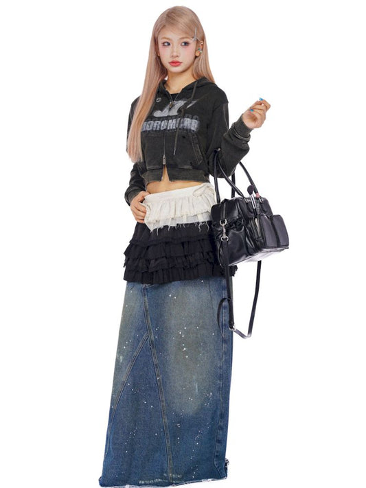 세탁된 스플래시 잉크 튕김 포인트 스프레이 데님 부스티에 스커트