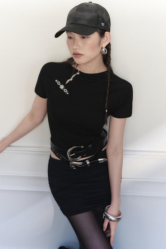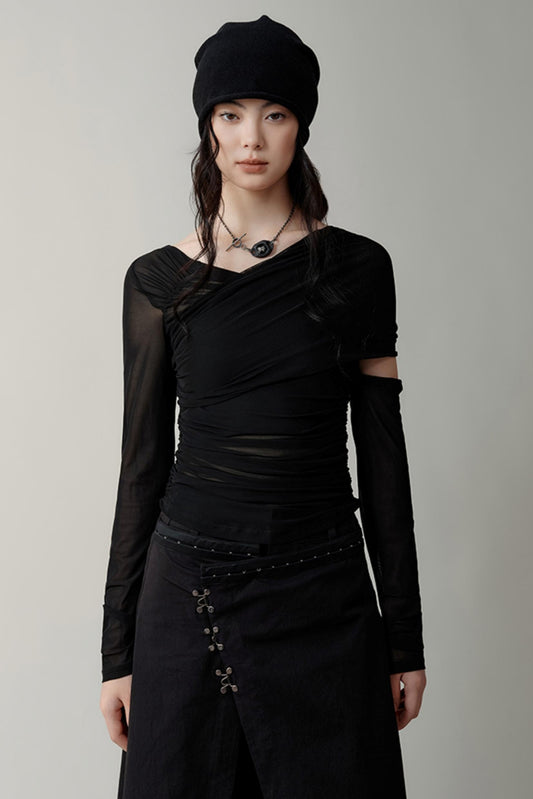 비대칭 시스루 메쉬 플리츠 티셔츠