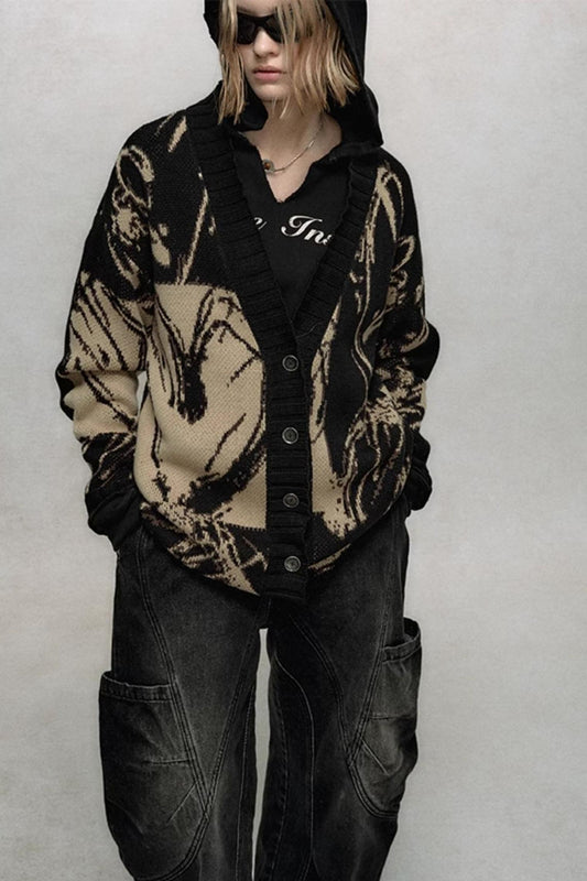 추상적인 그래피티 자카드 V넥 가디건