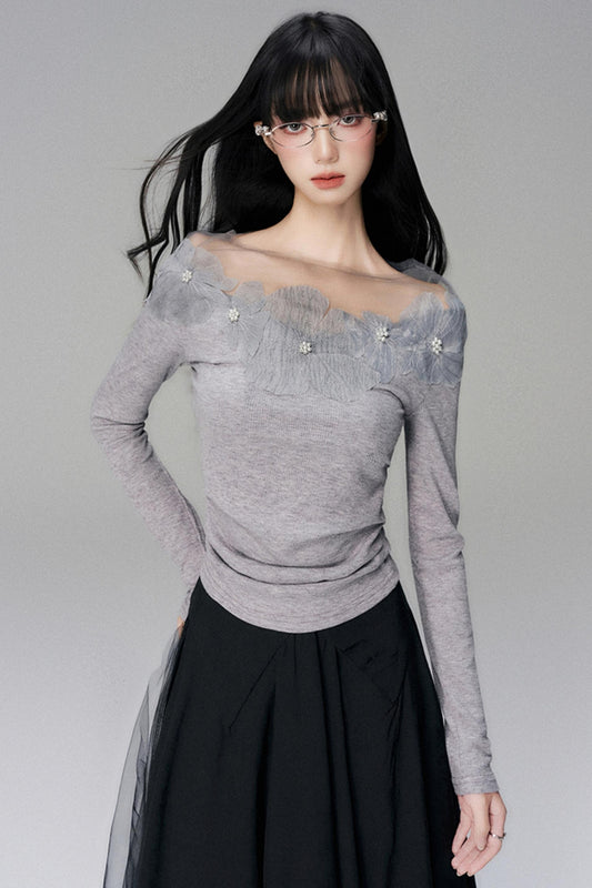 플로럴 레이스 긴소매 니트 탑