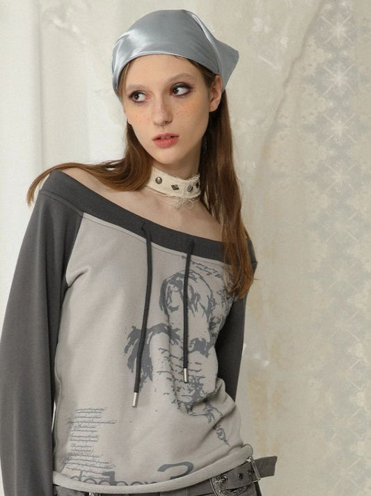 원숄더 스트래플리스 프린트 긴팔 스웨트셔츠