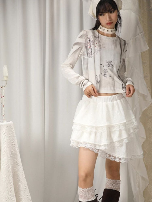 발레 스타일 리본 긴팔 프린트 티