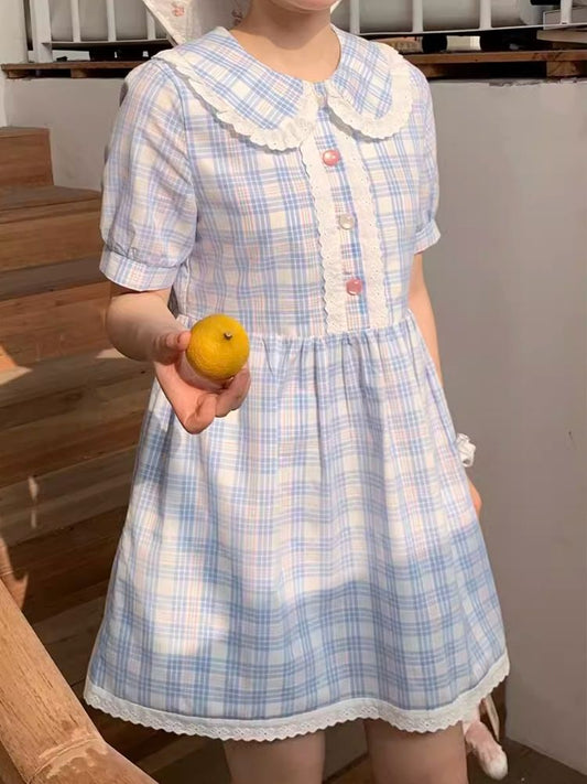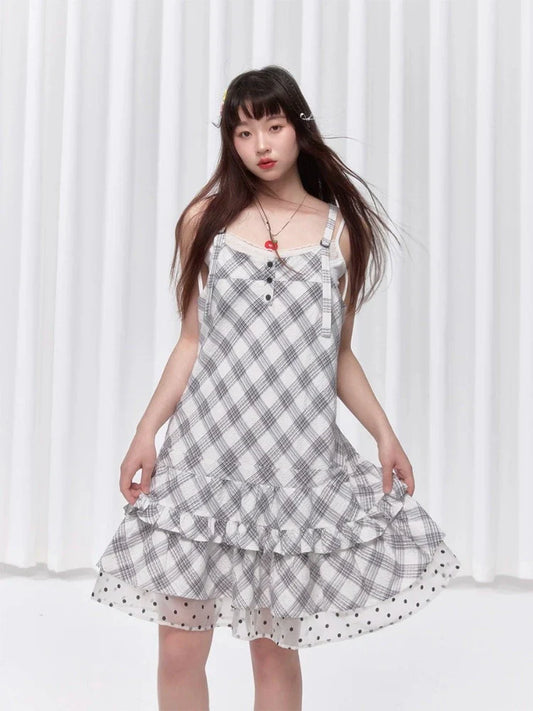 체크 투 컬러 쉘 버튼 드레스