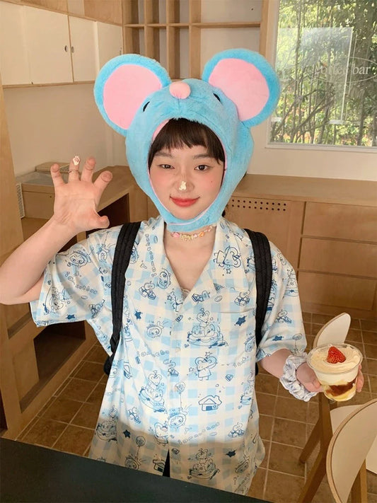 고양이 귀 후드 반소매 크리미 핑크 체크 무늬 니트 팬츠