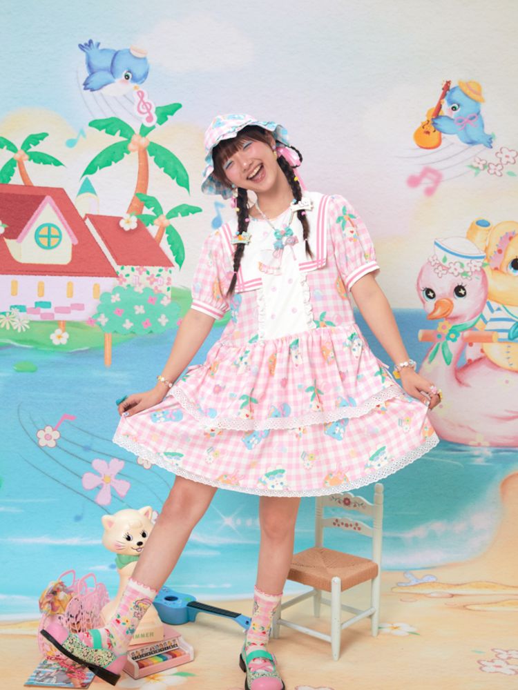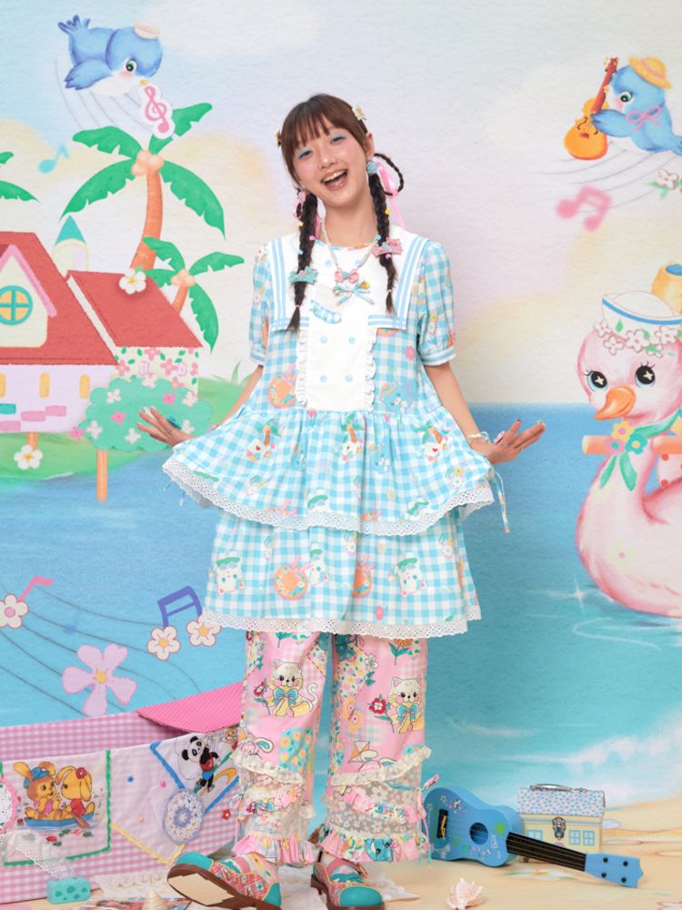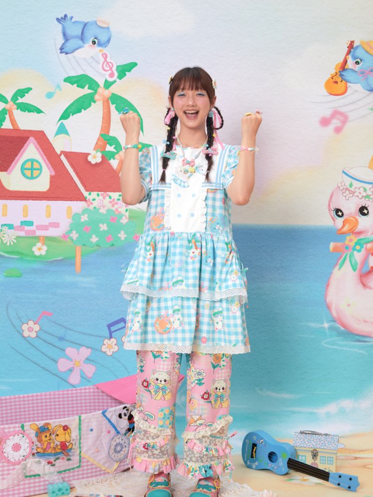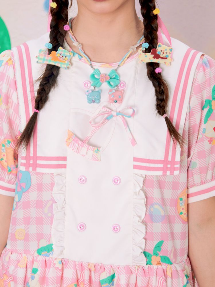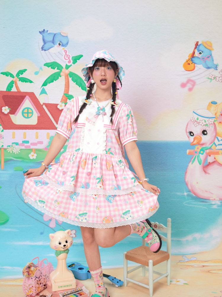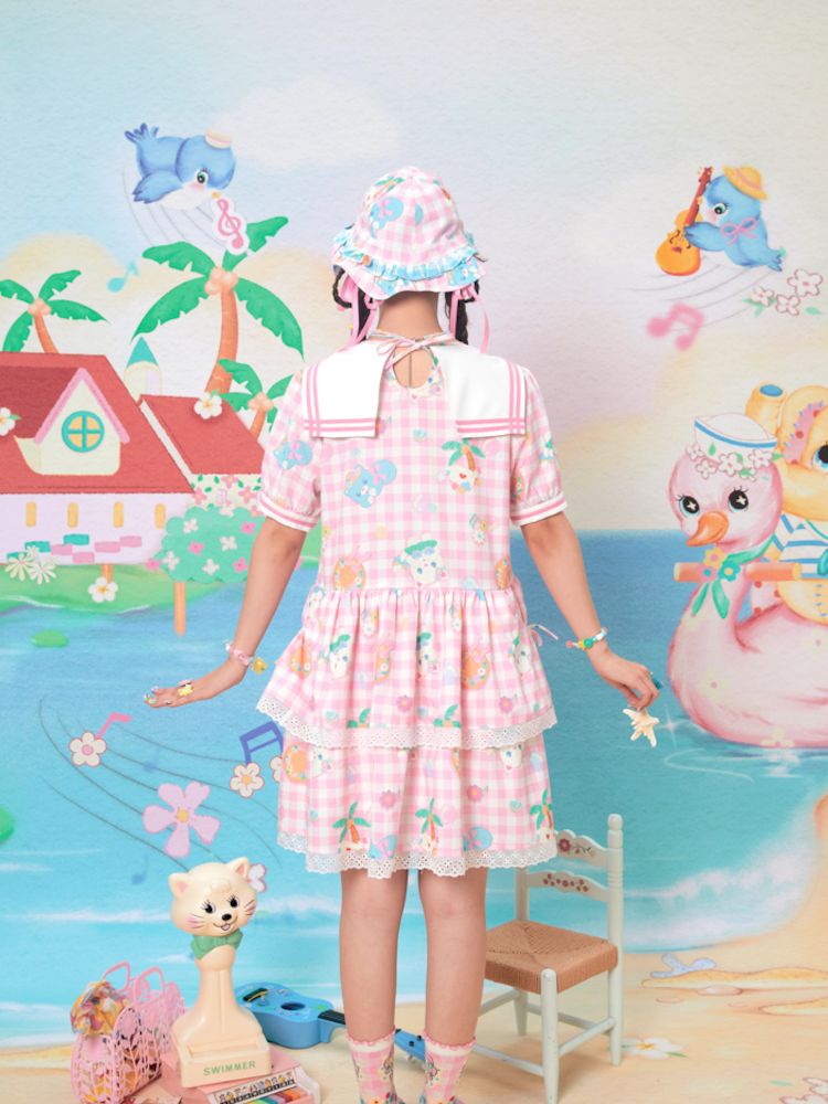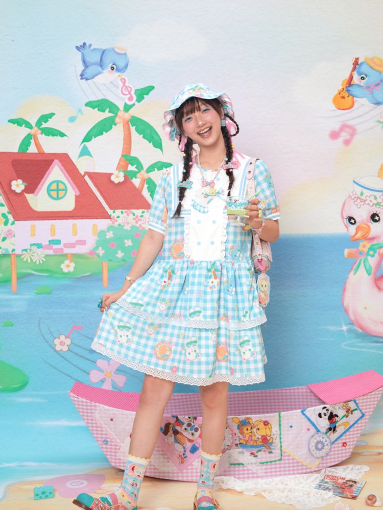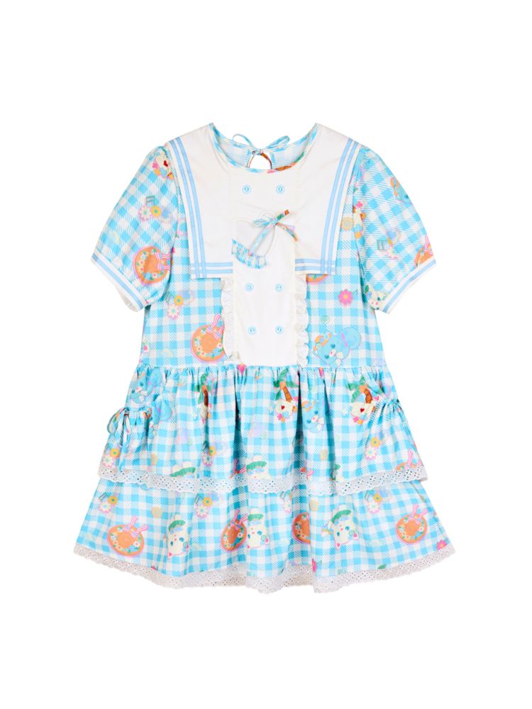 Navy Neck Plaid Cat Print Cake Dress
