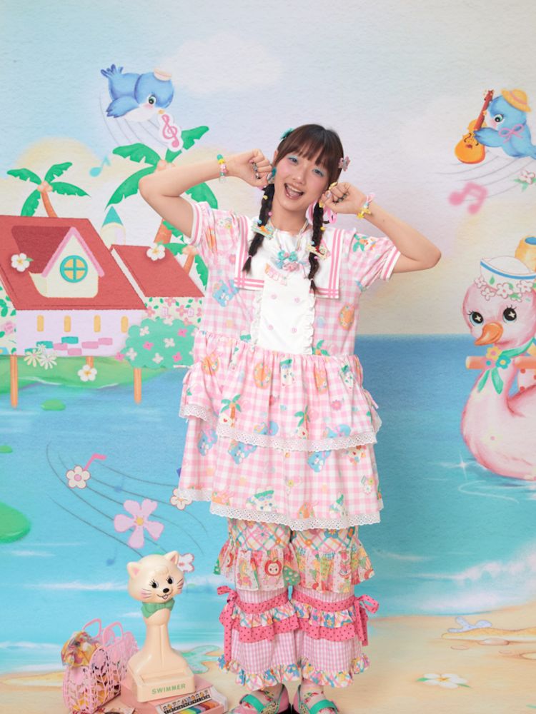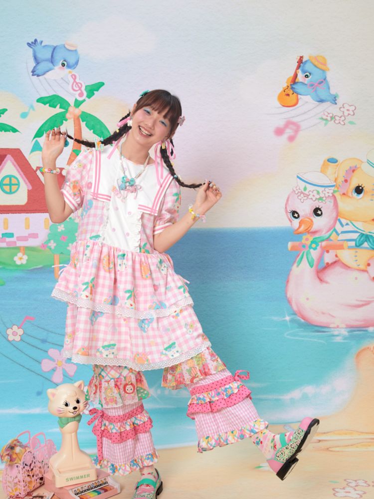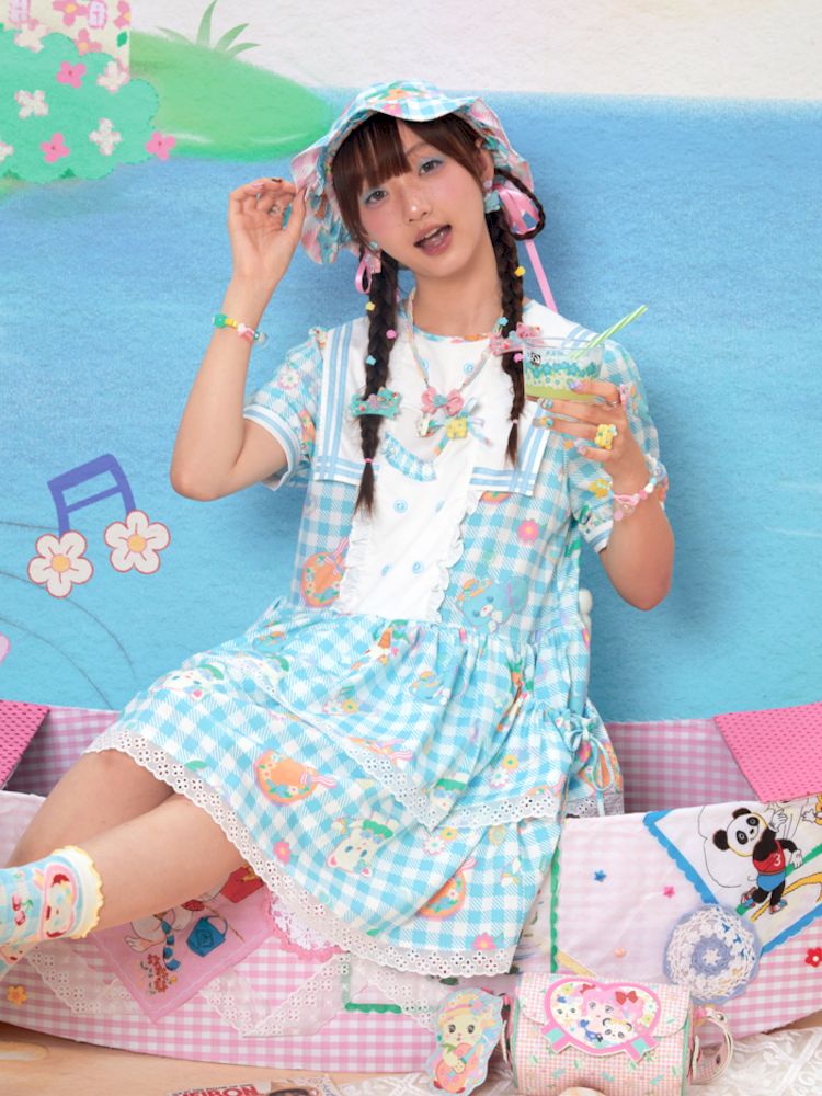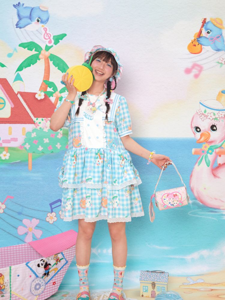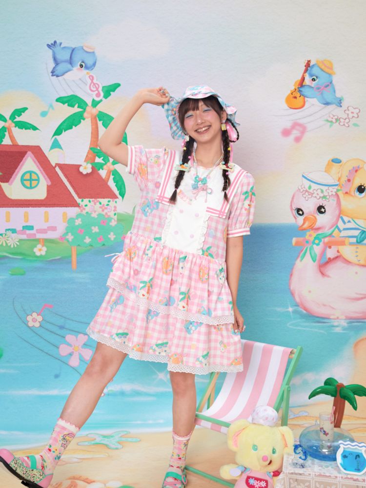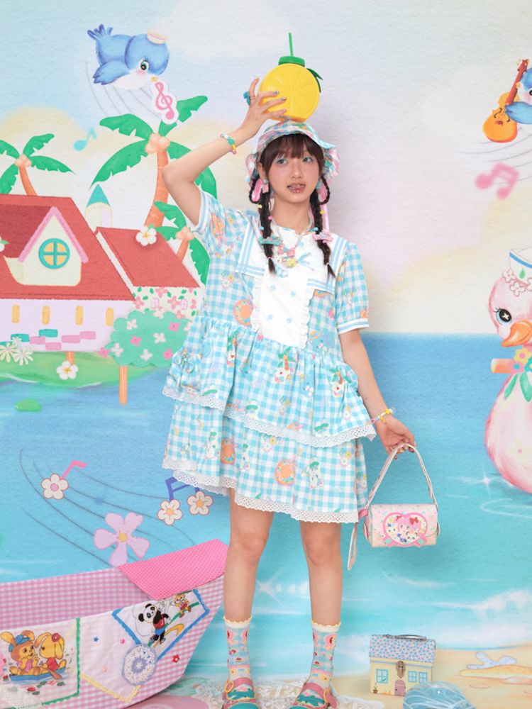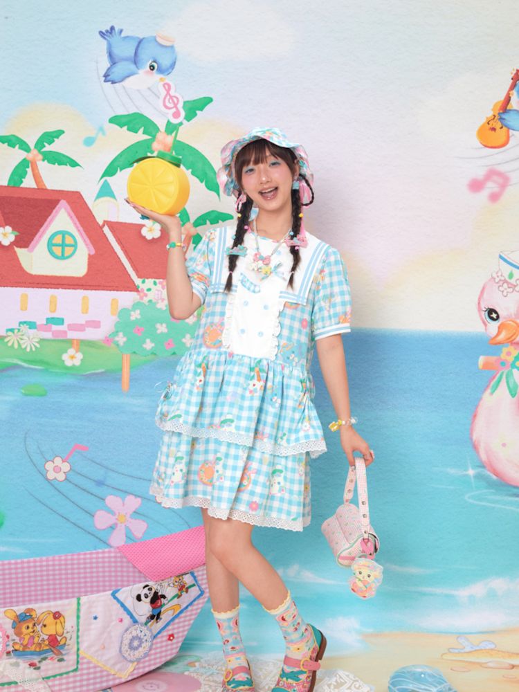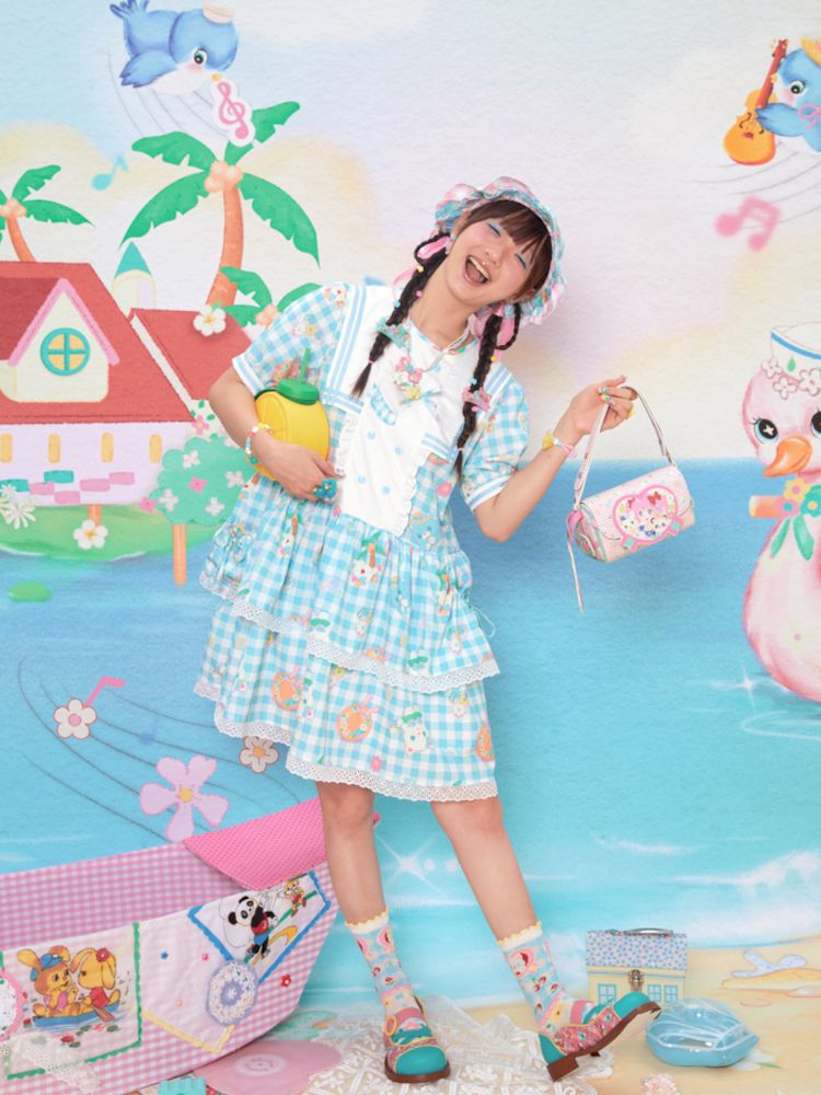 Navy Neck Plaid Cat Print Cake Dress