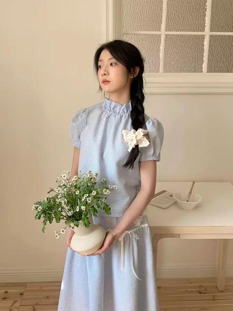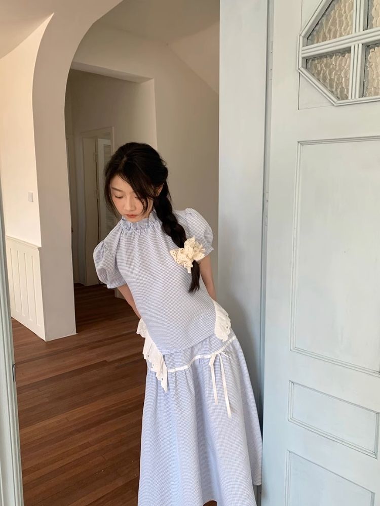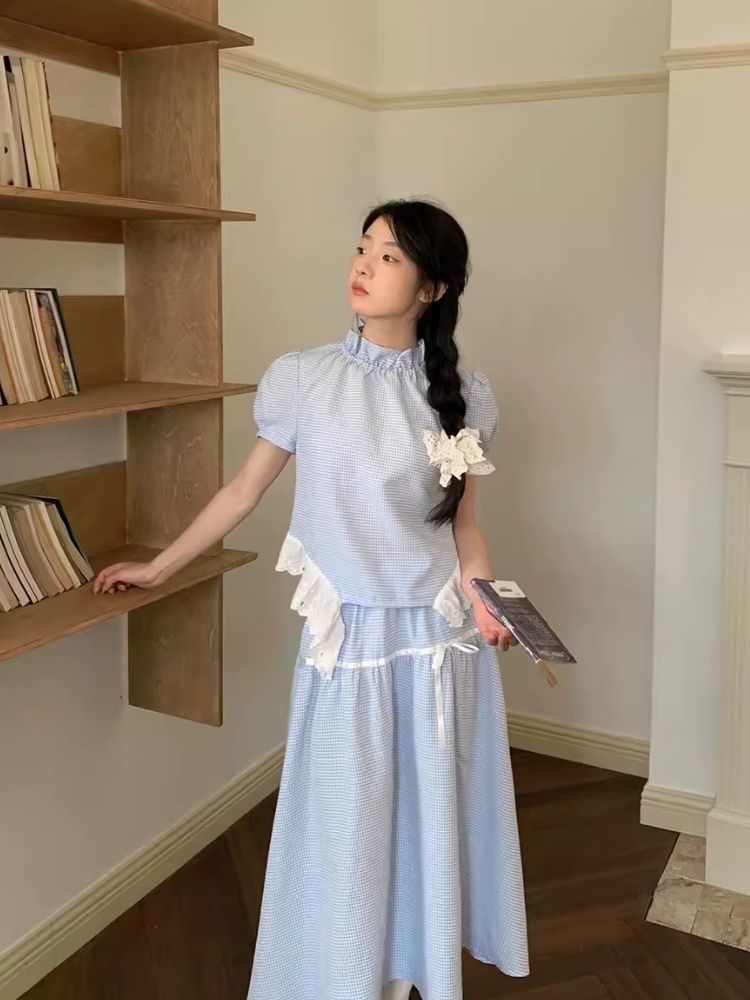 A-line Doll Top Plaid Skinny Half-body Skirt Set