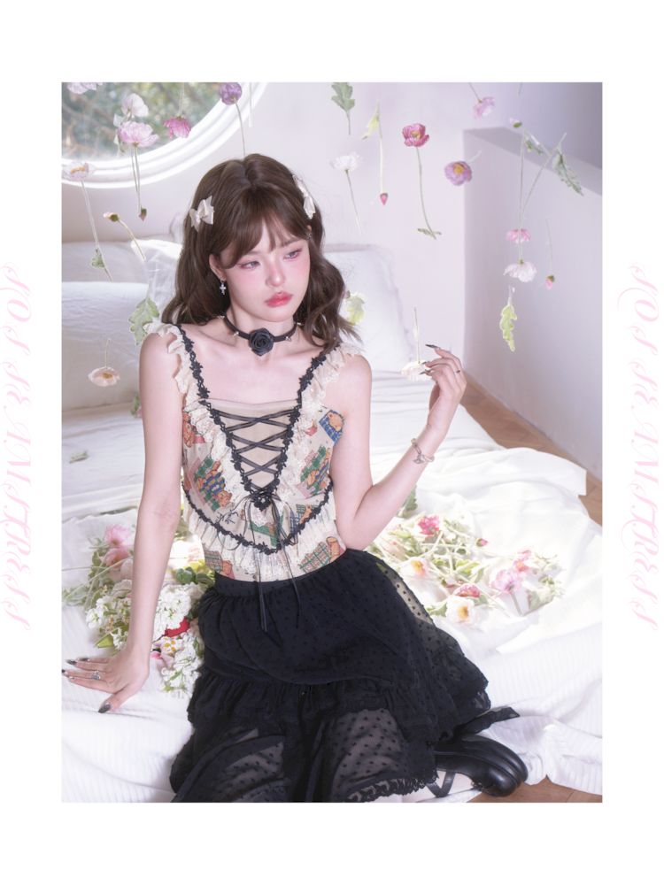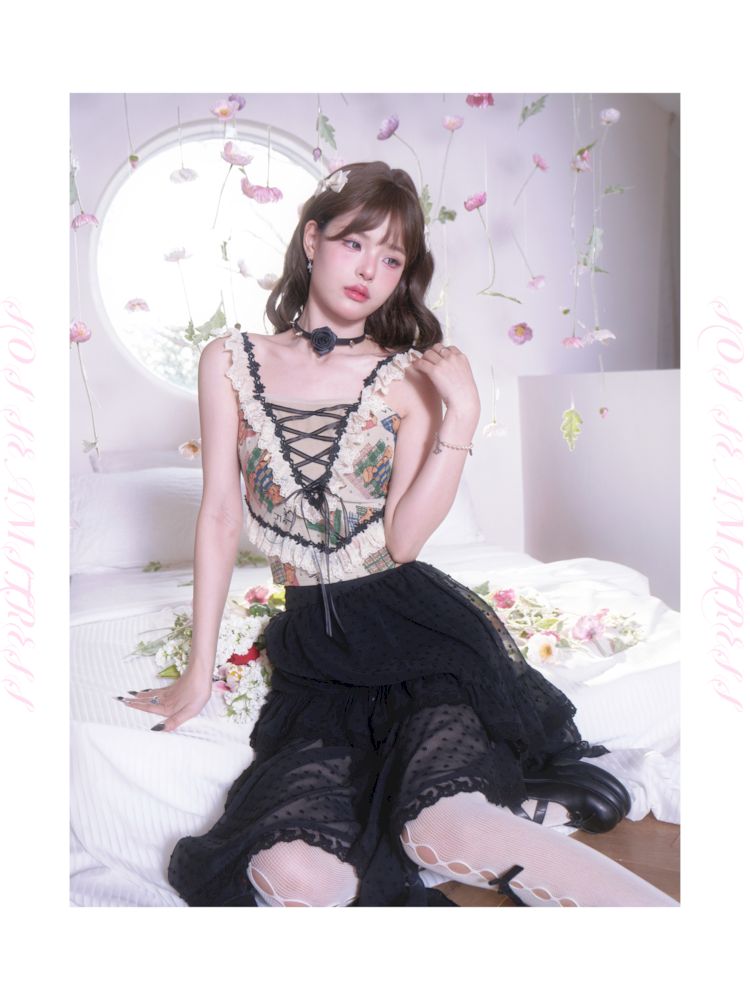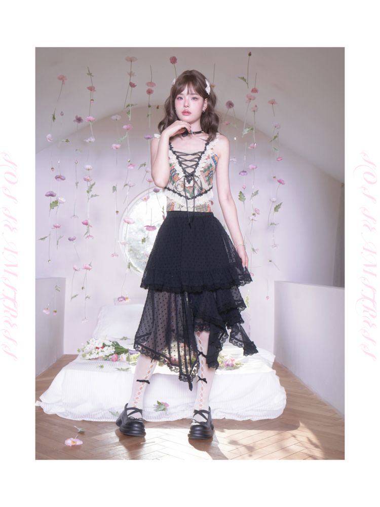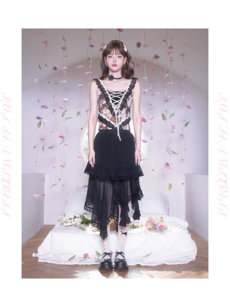 Polka Dot Irregular Hem Lace Ruffle Half Skirt