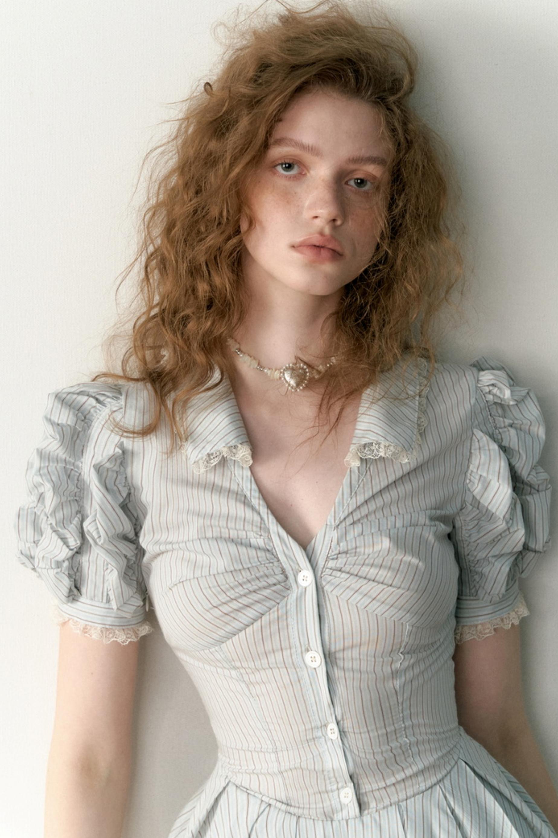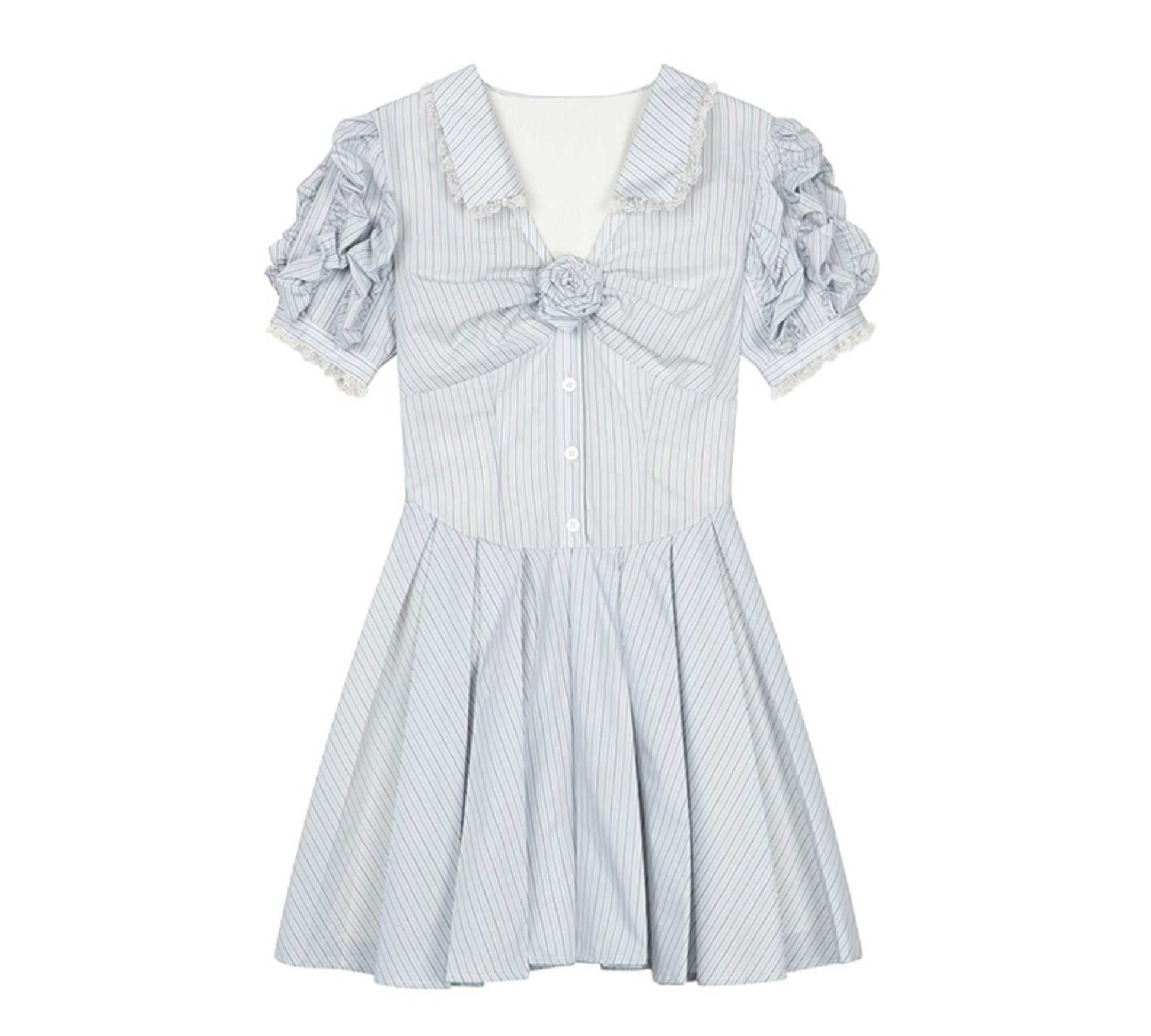 Blue Striped Bubble Sleeve Floral Pleated Dress