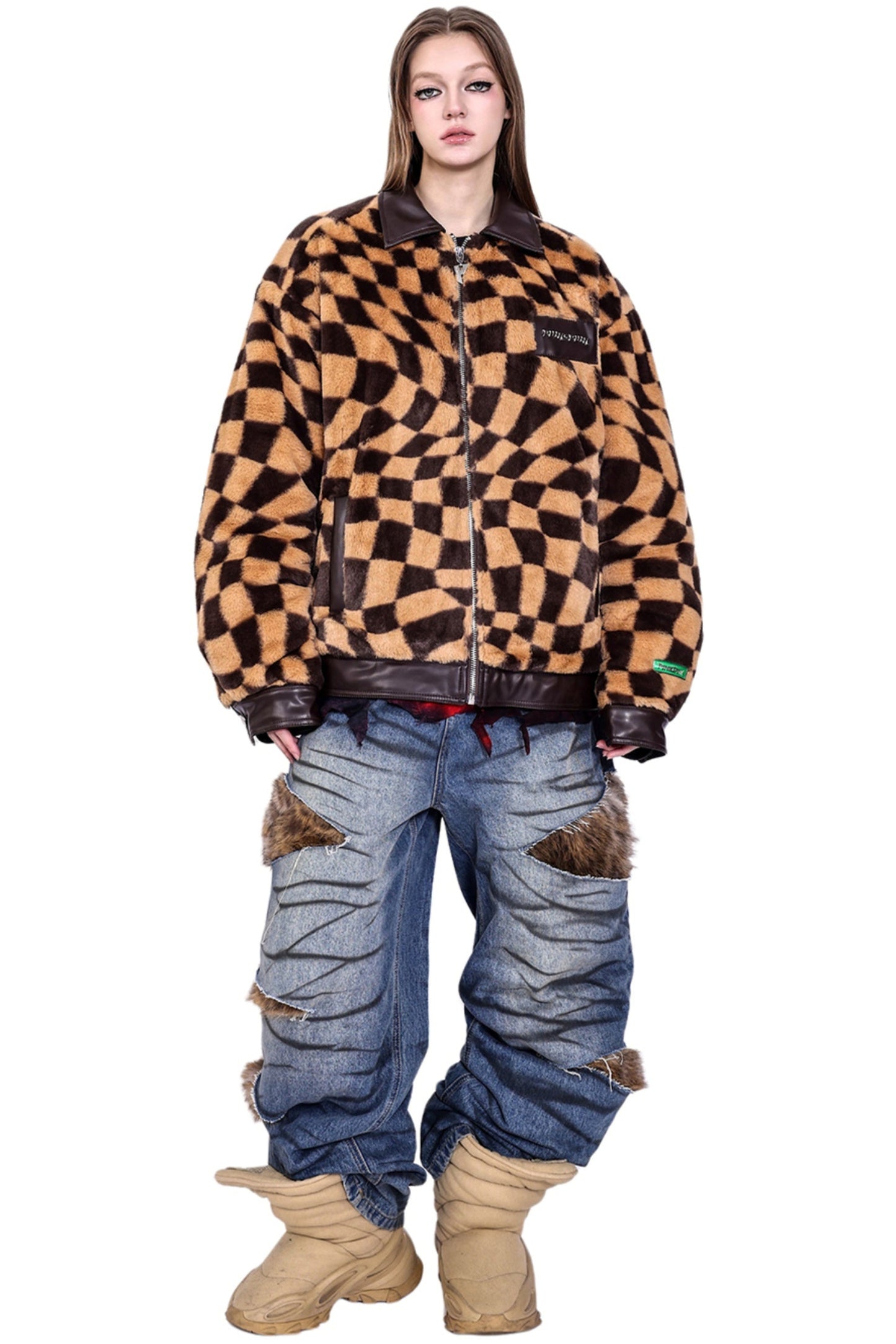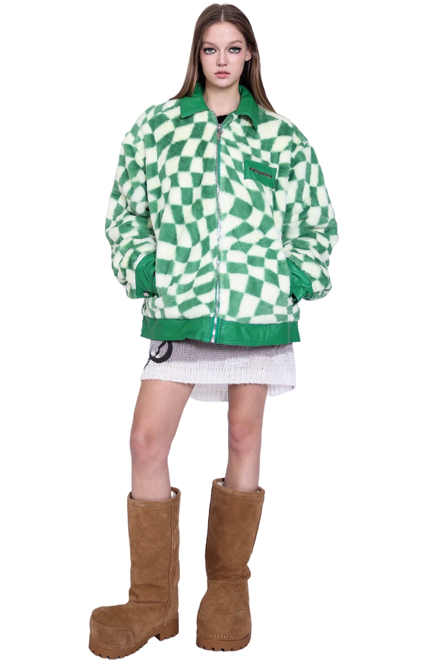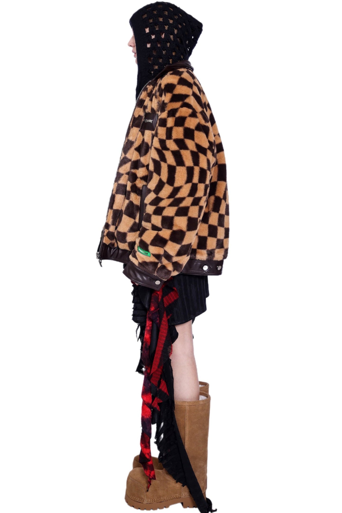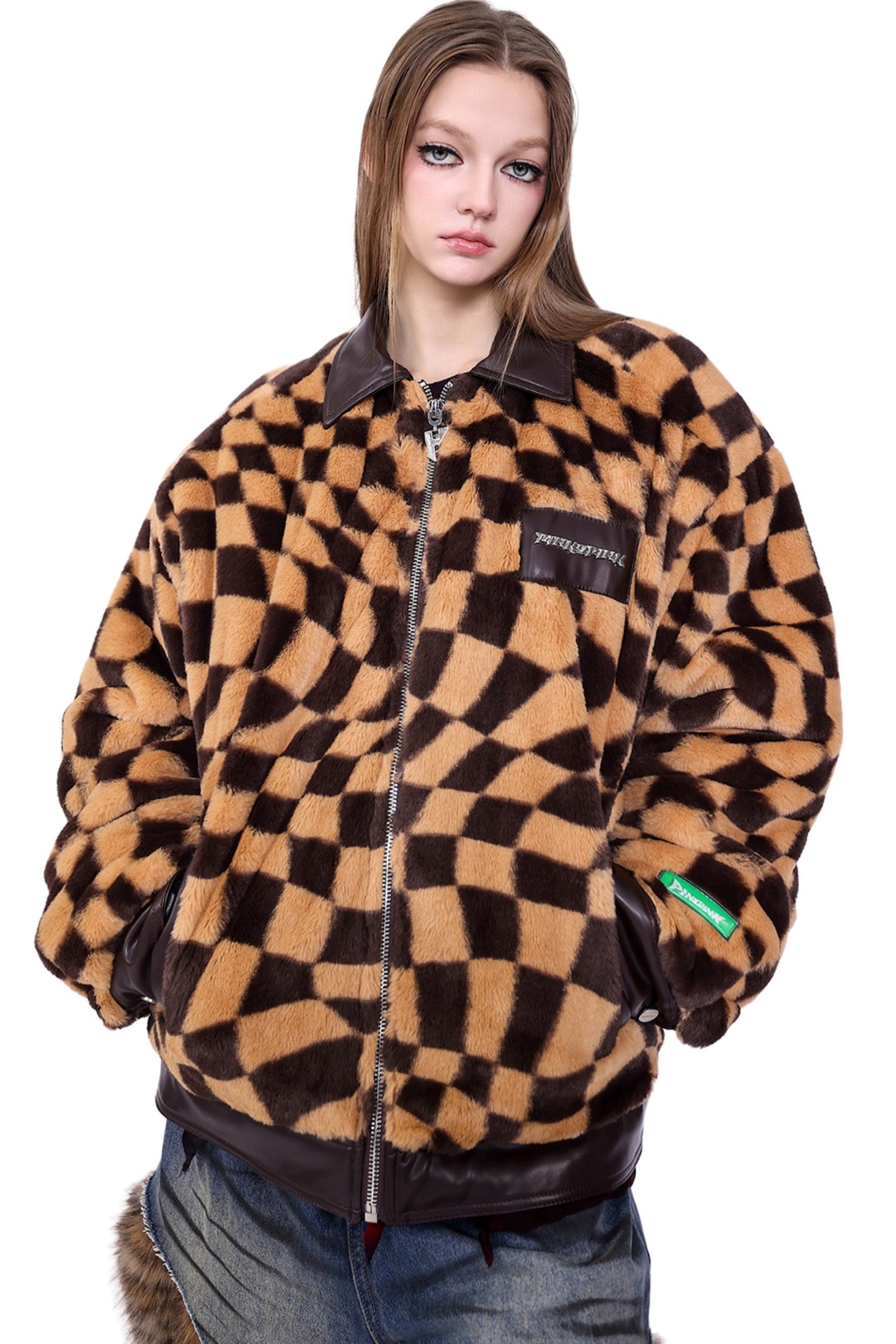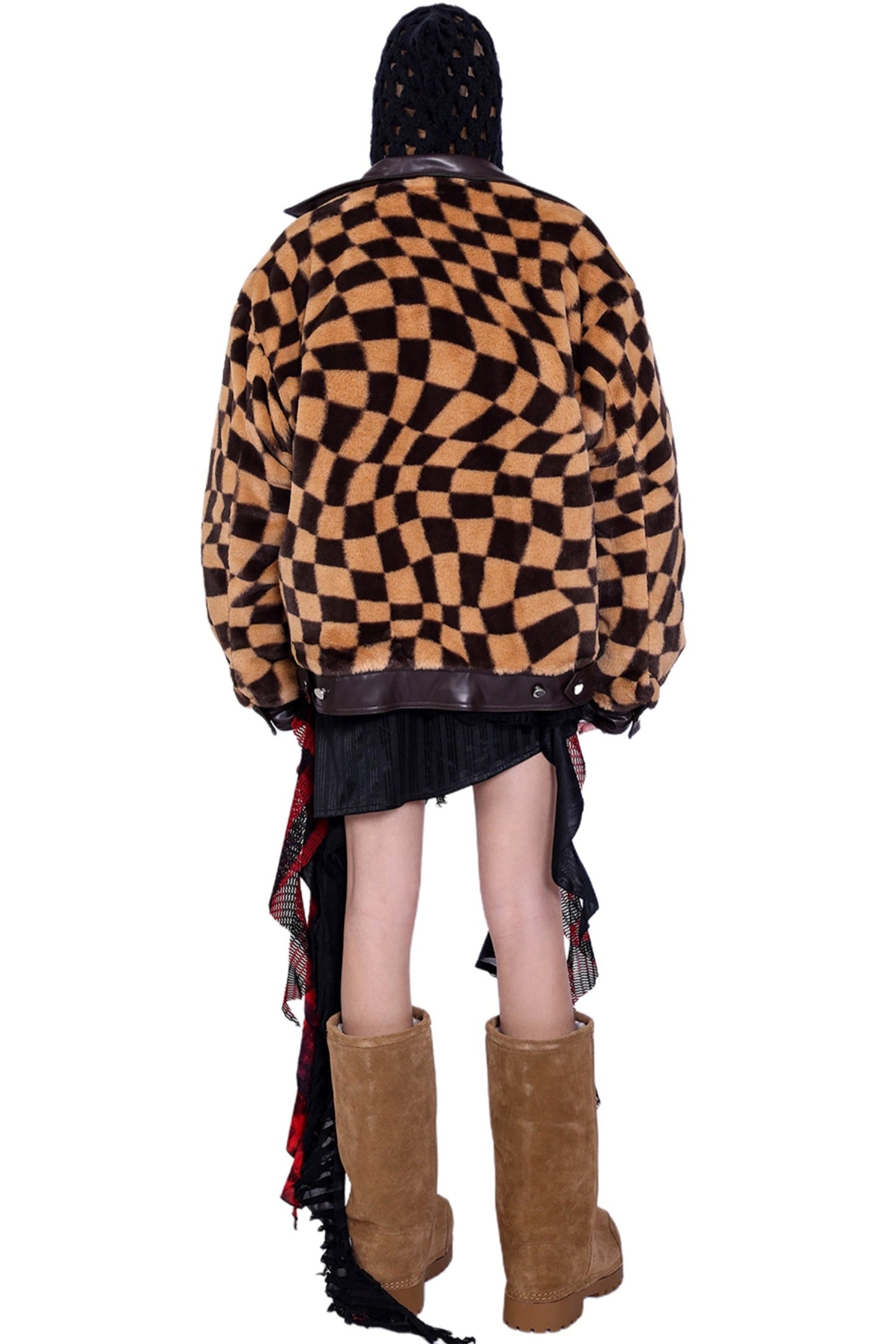Checkered Panel Fur Coat