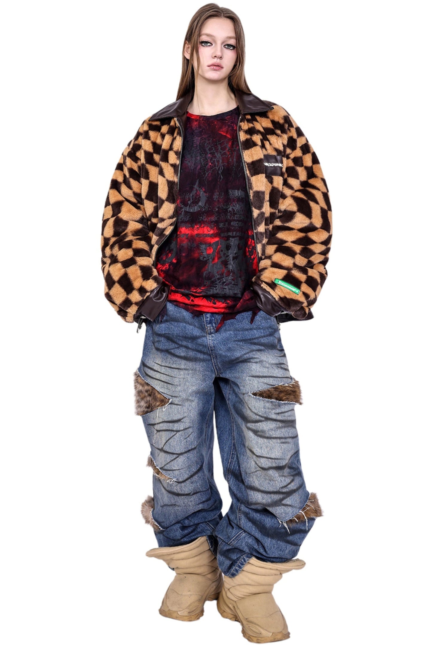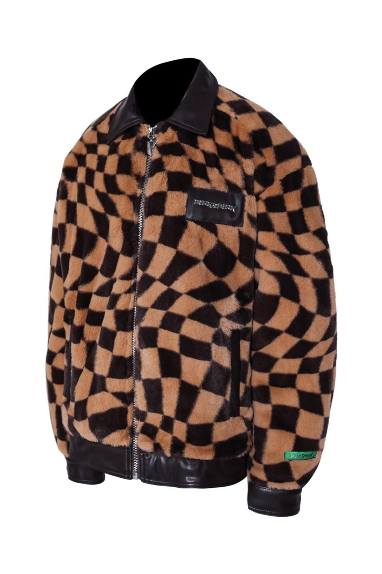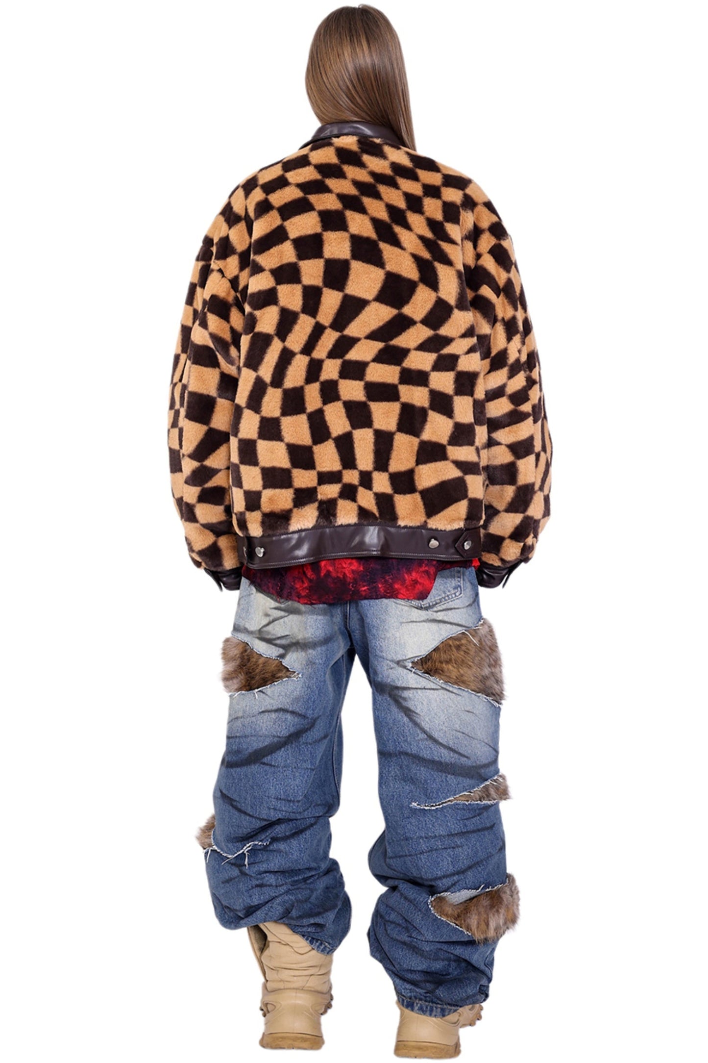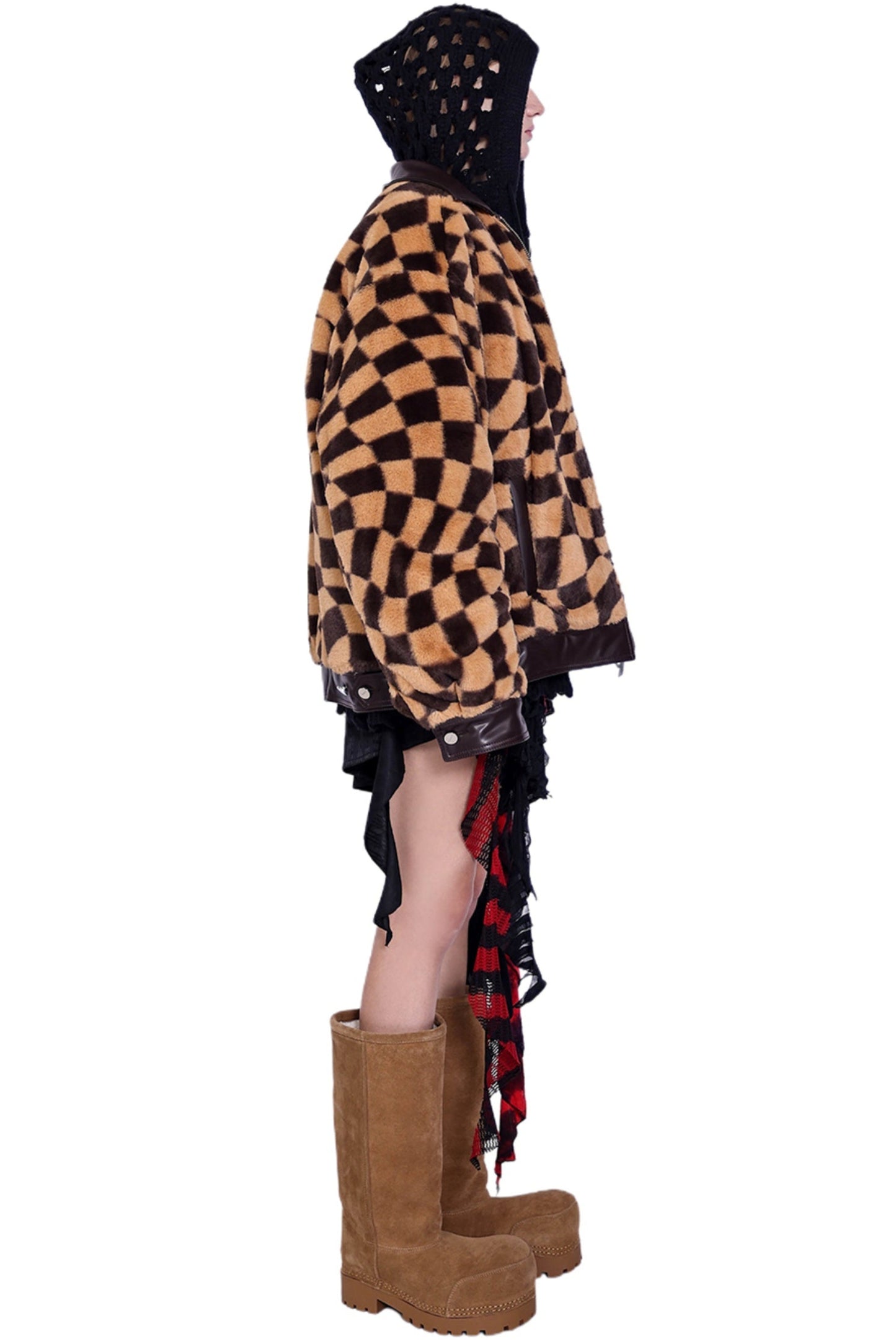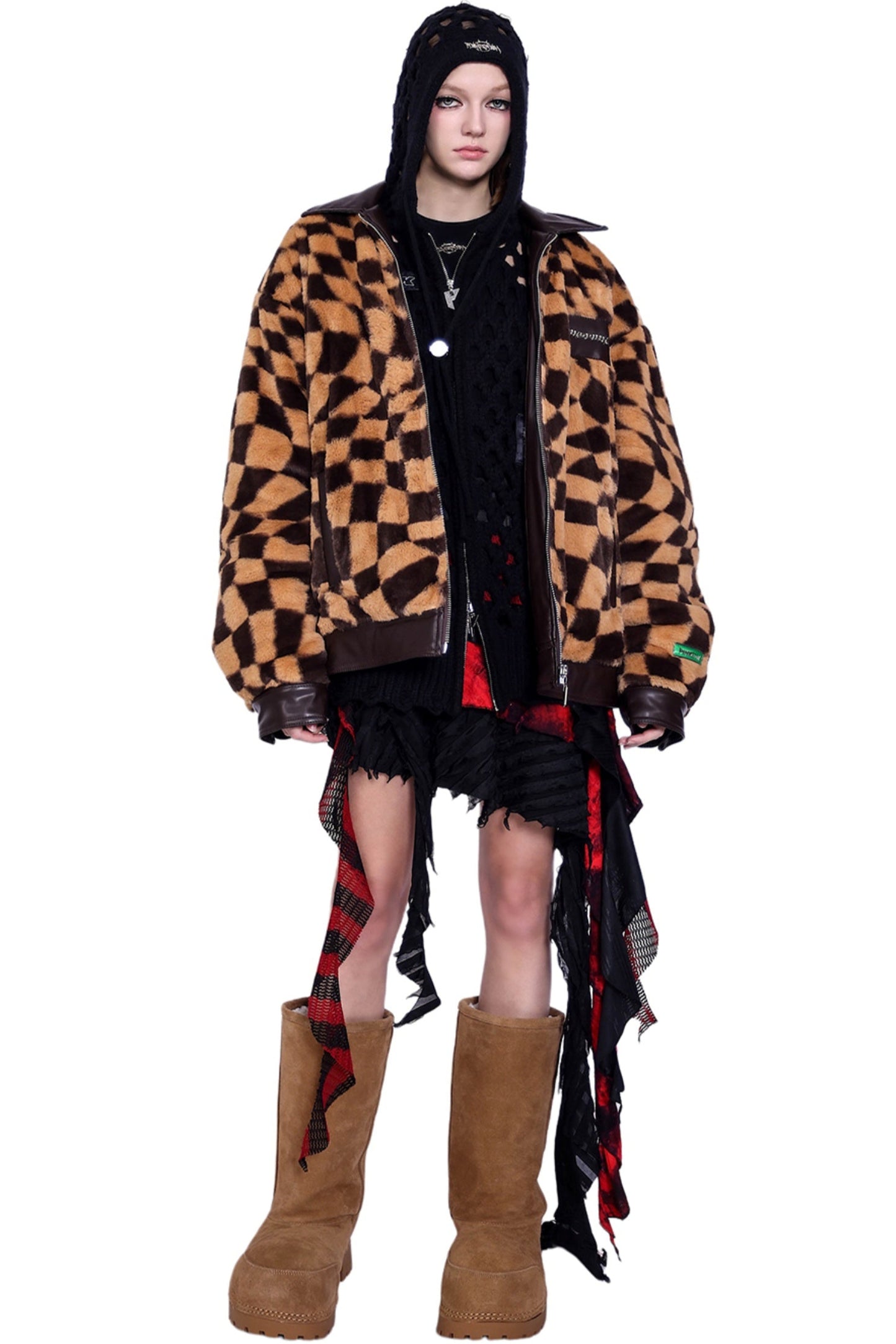 Checkered Panel Fur Coat