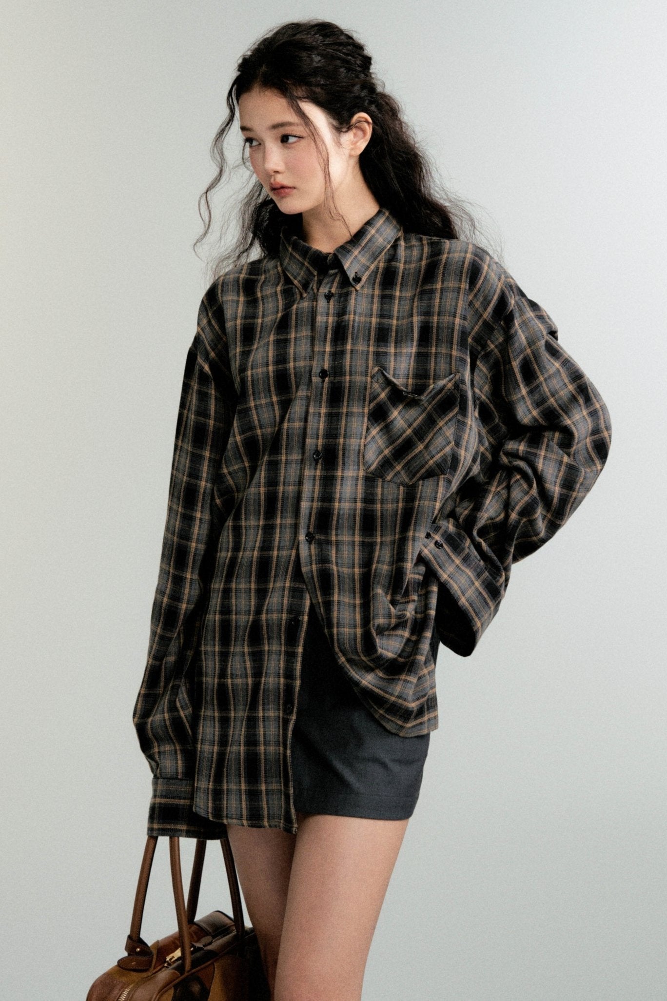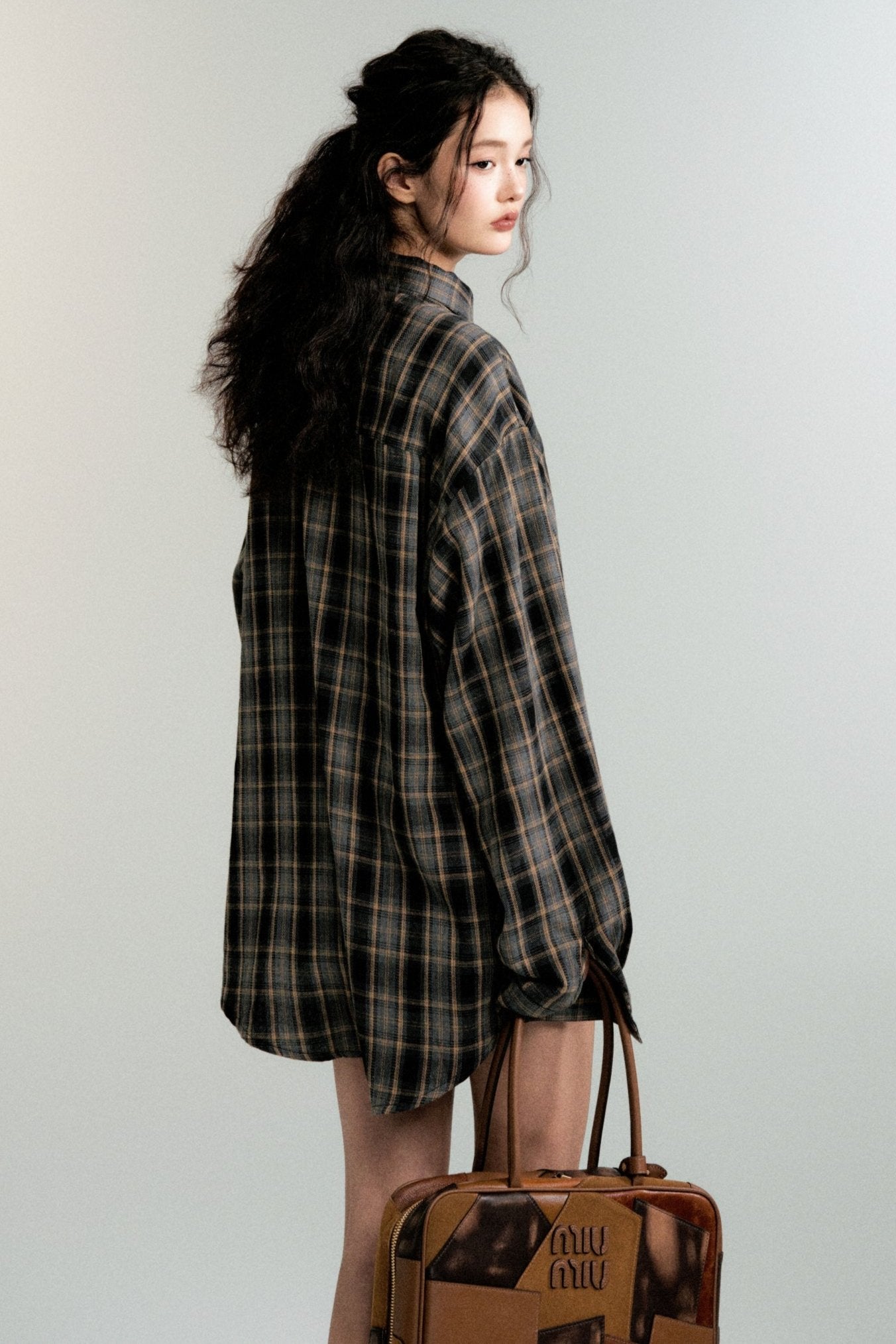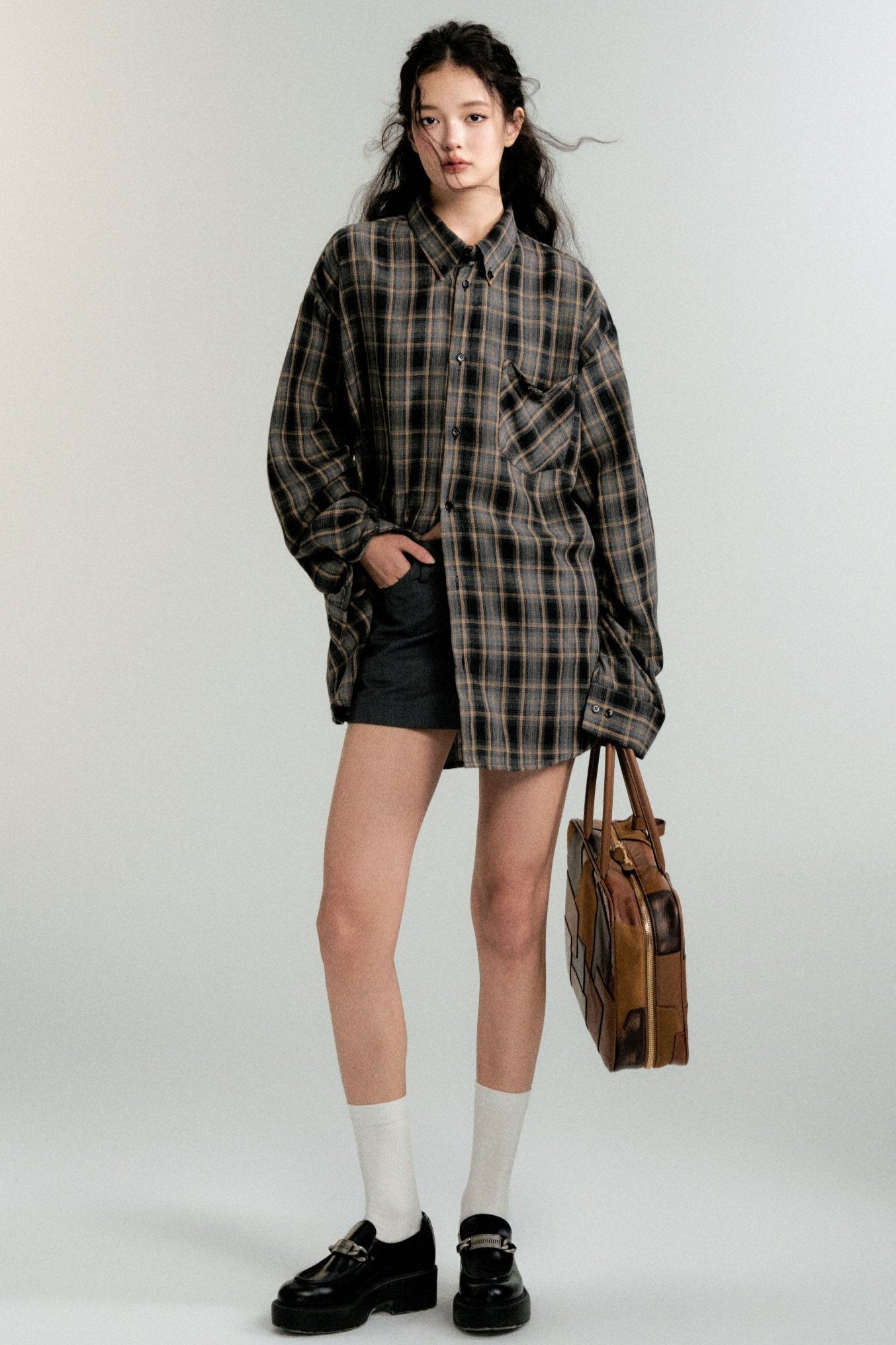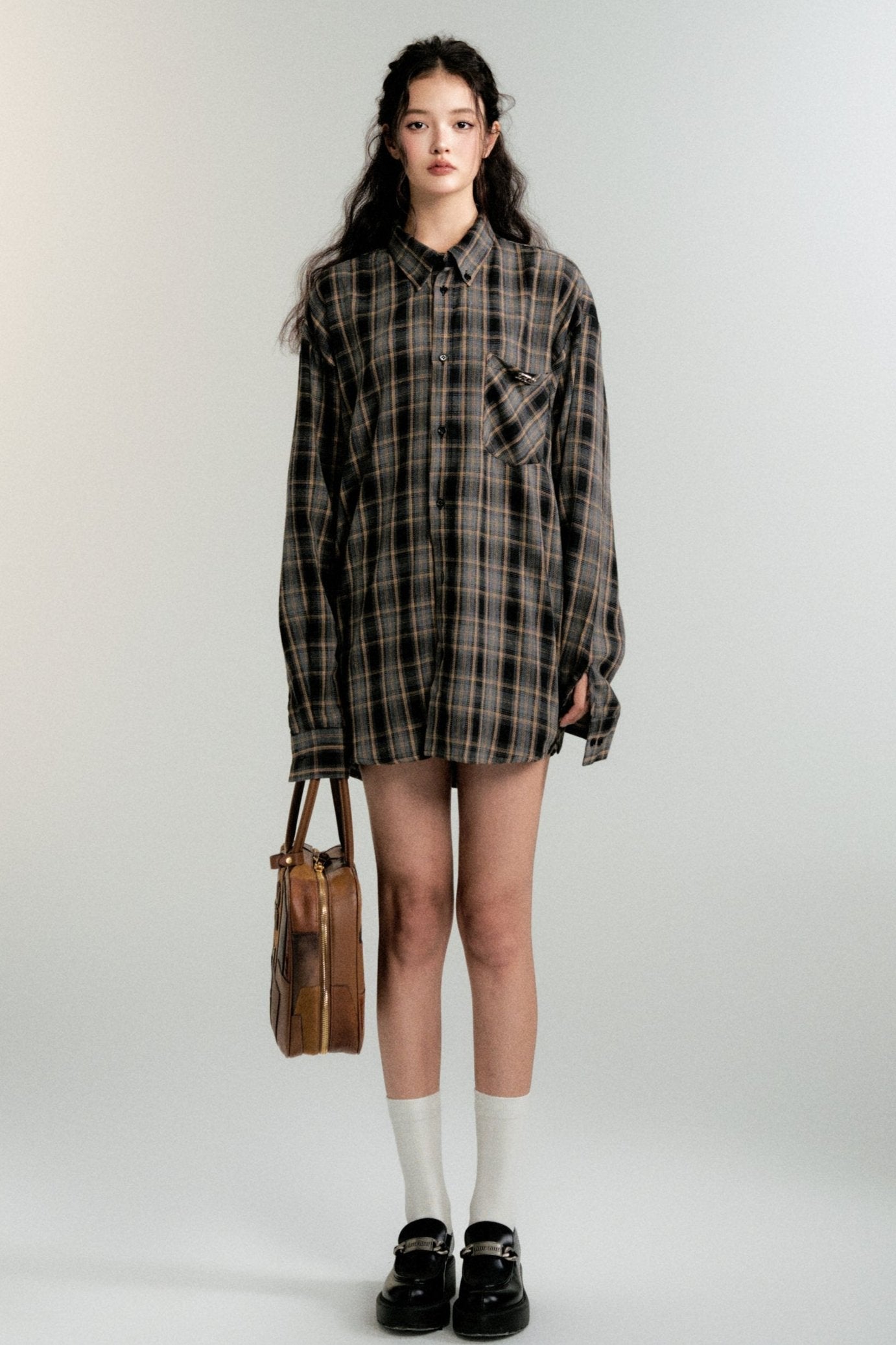 Color-Block Loose Check Long-Sleeved Shirt