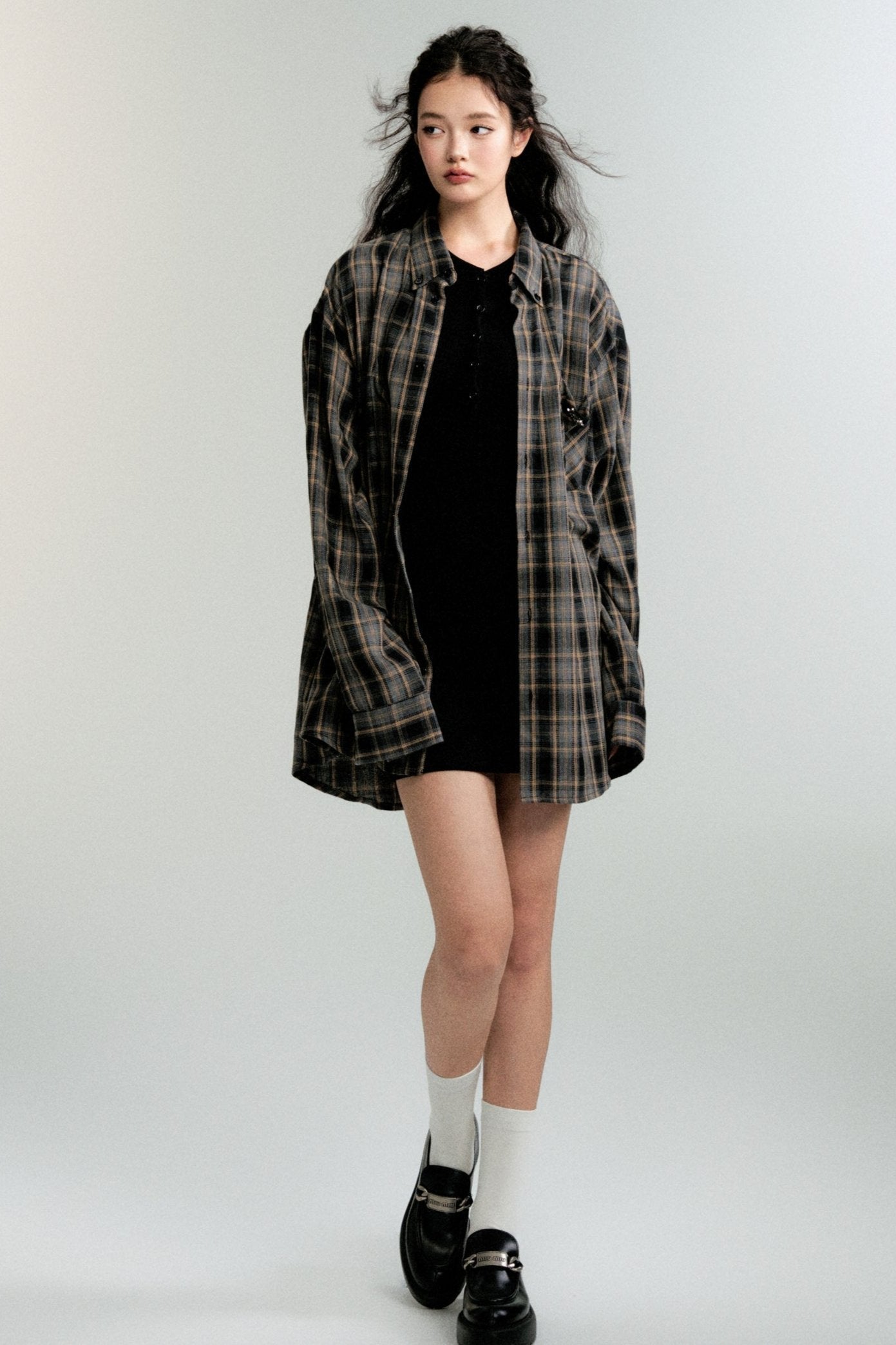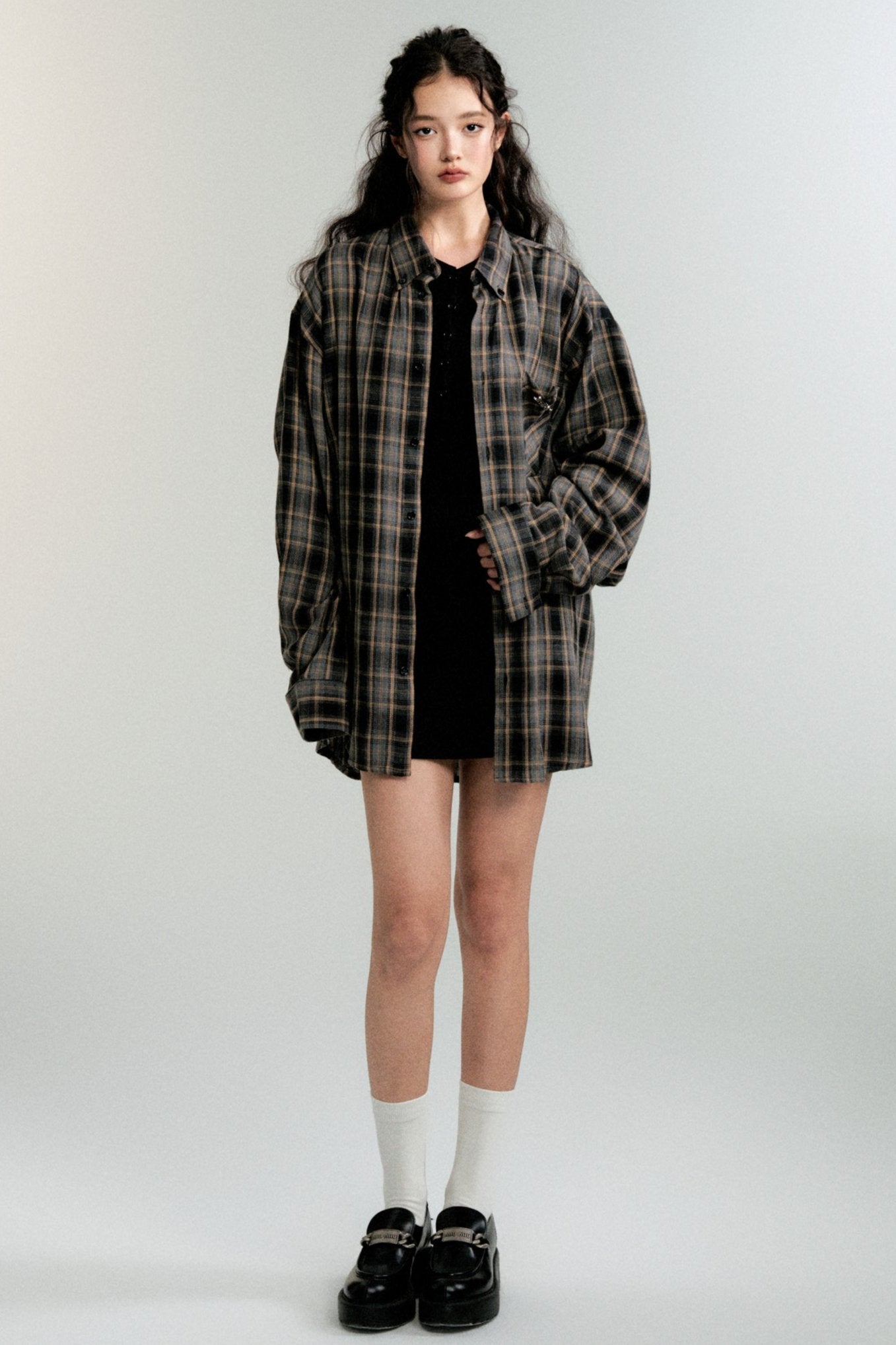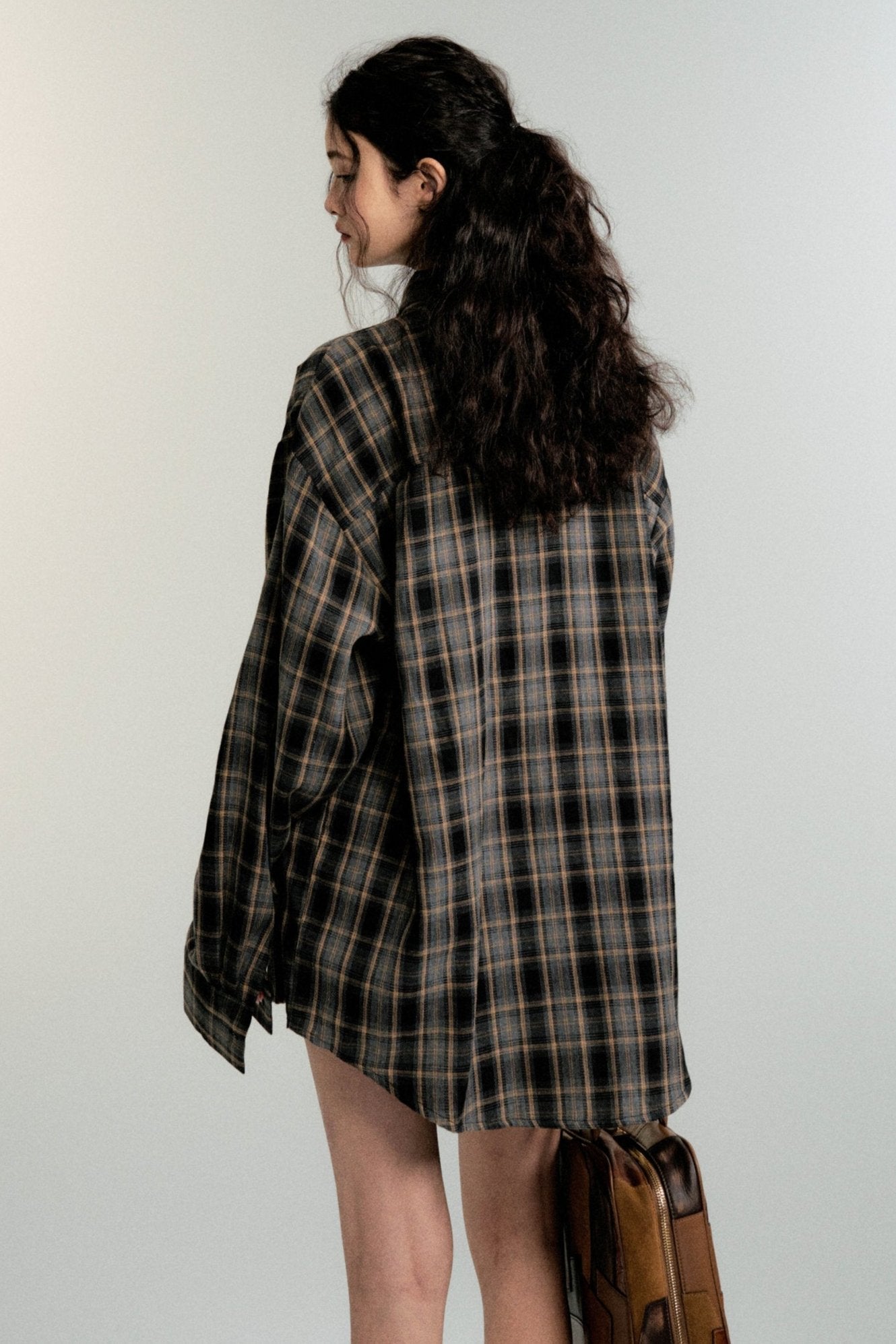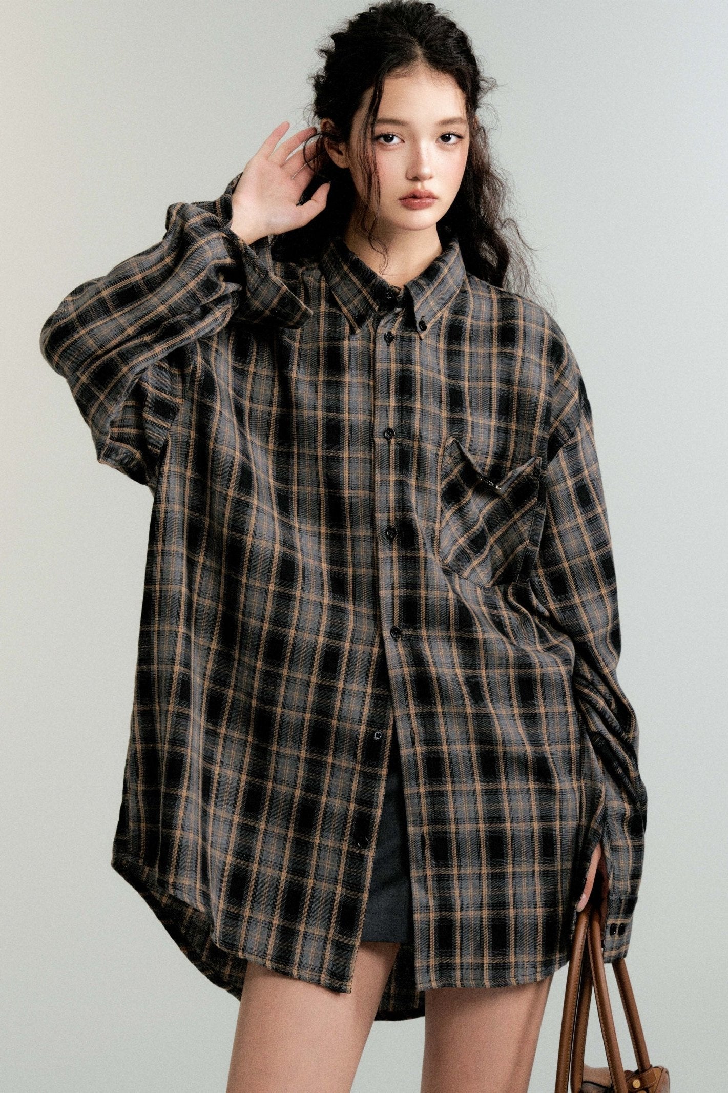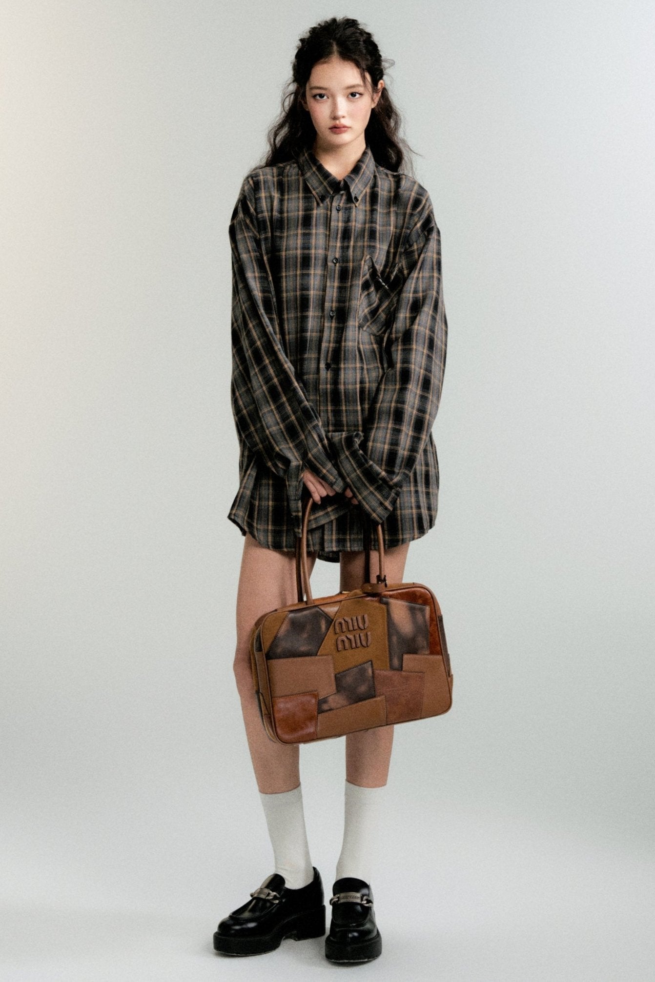 Color-Block Loose Check Long-Sleeved Shirt
