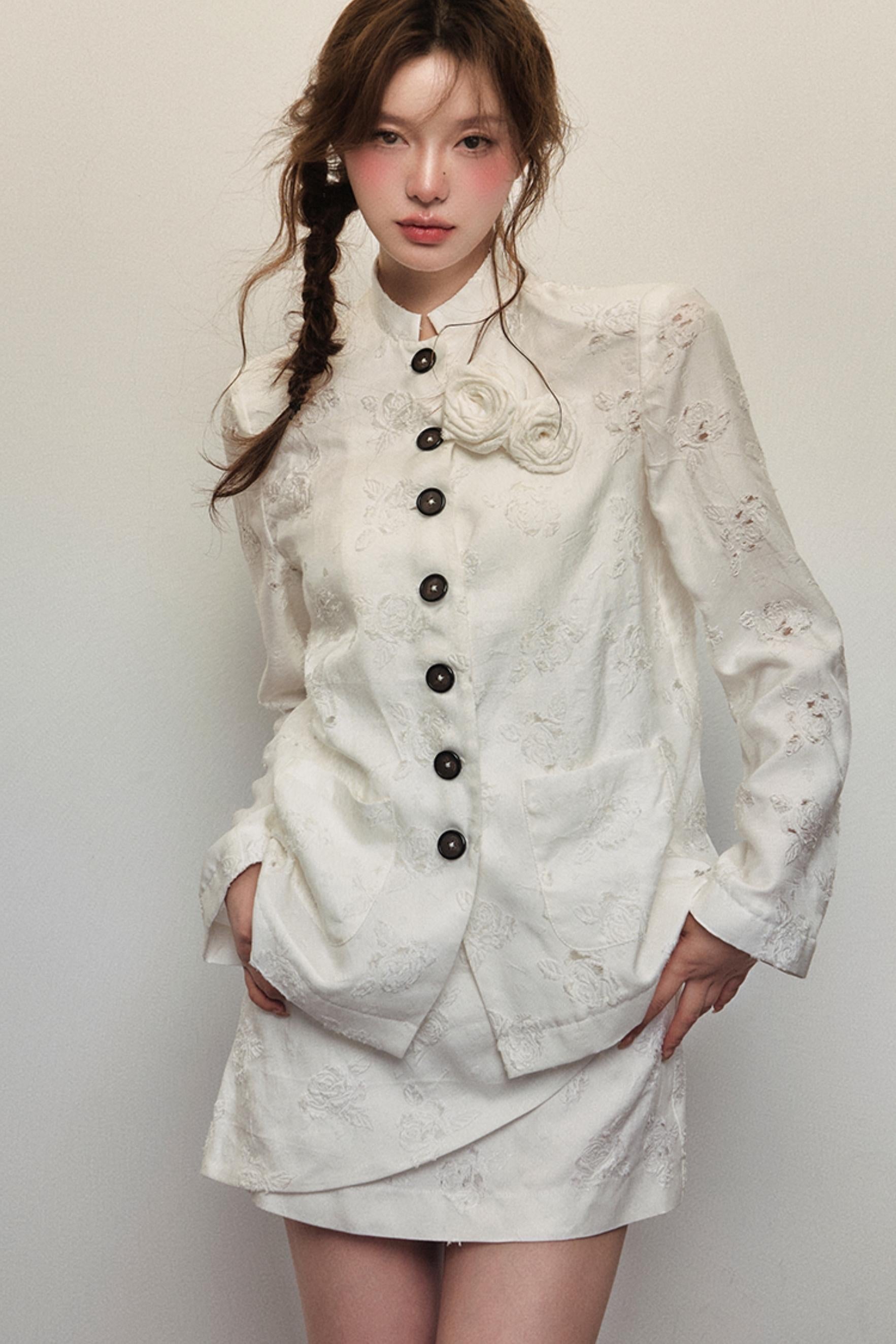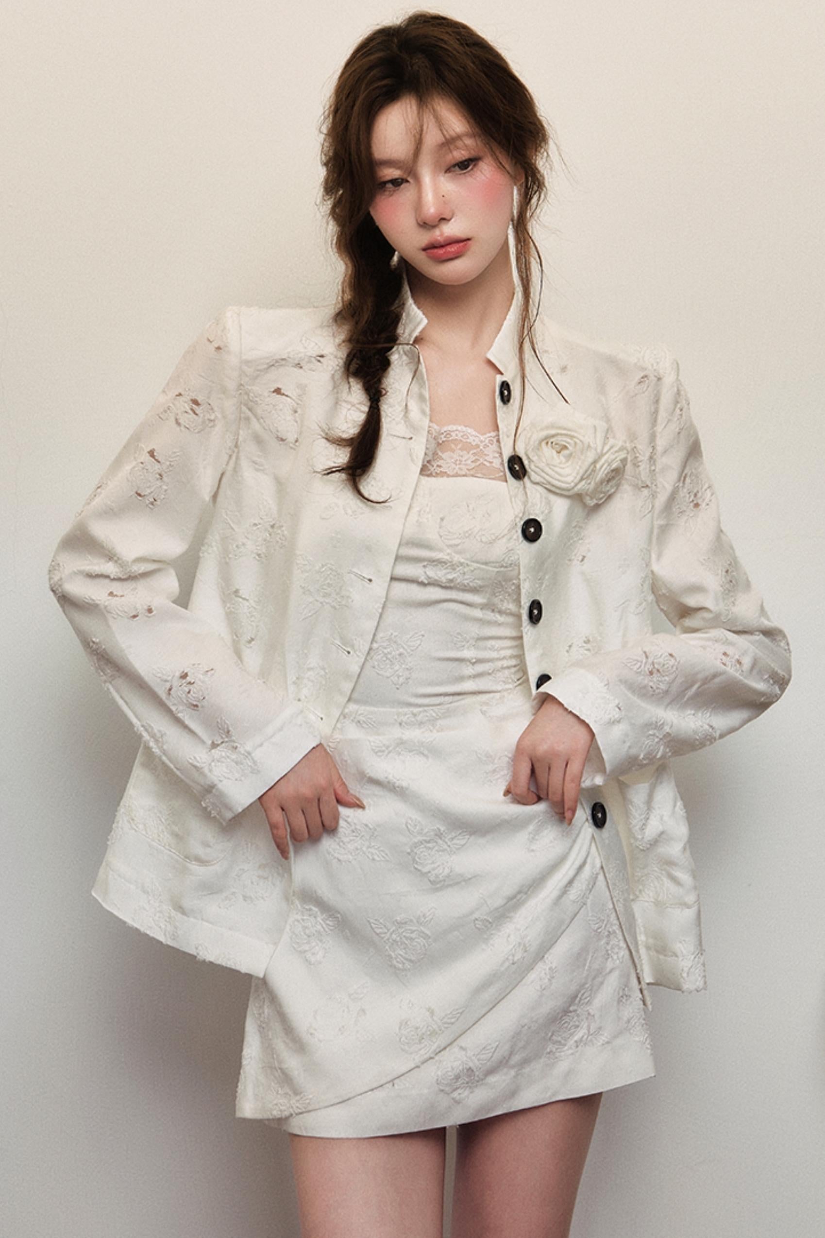 Elegant White Rose Jacquard Dress