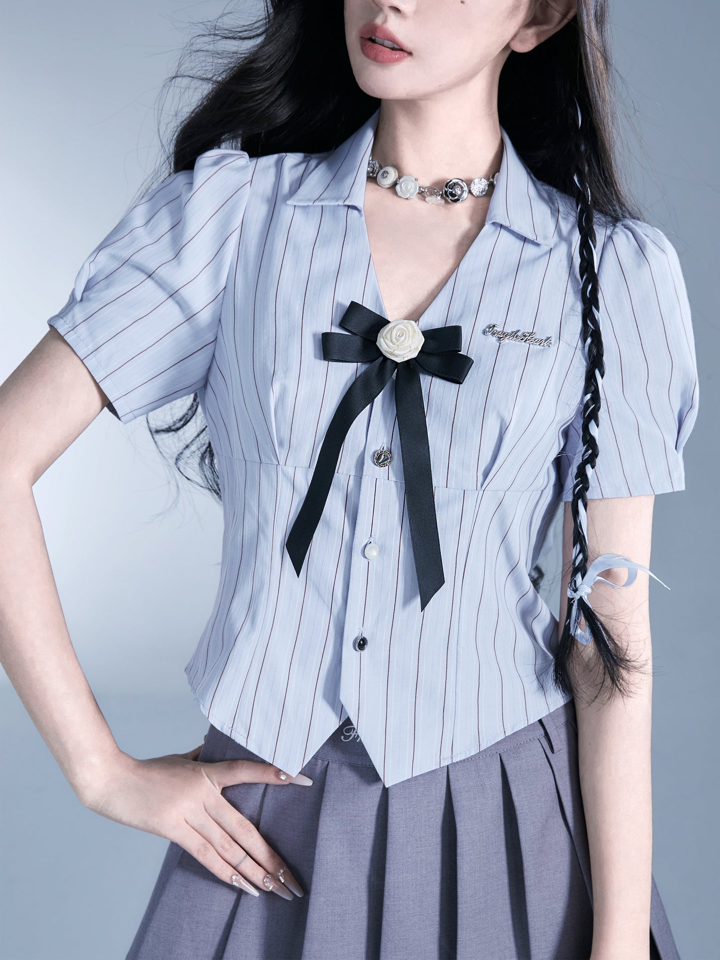 White Rose Motif Puff Sleeve Striped Blouse Pleated Short Skirt