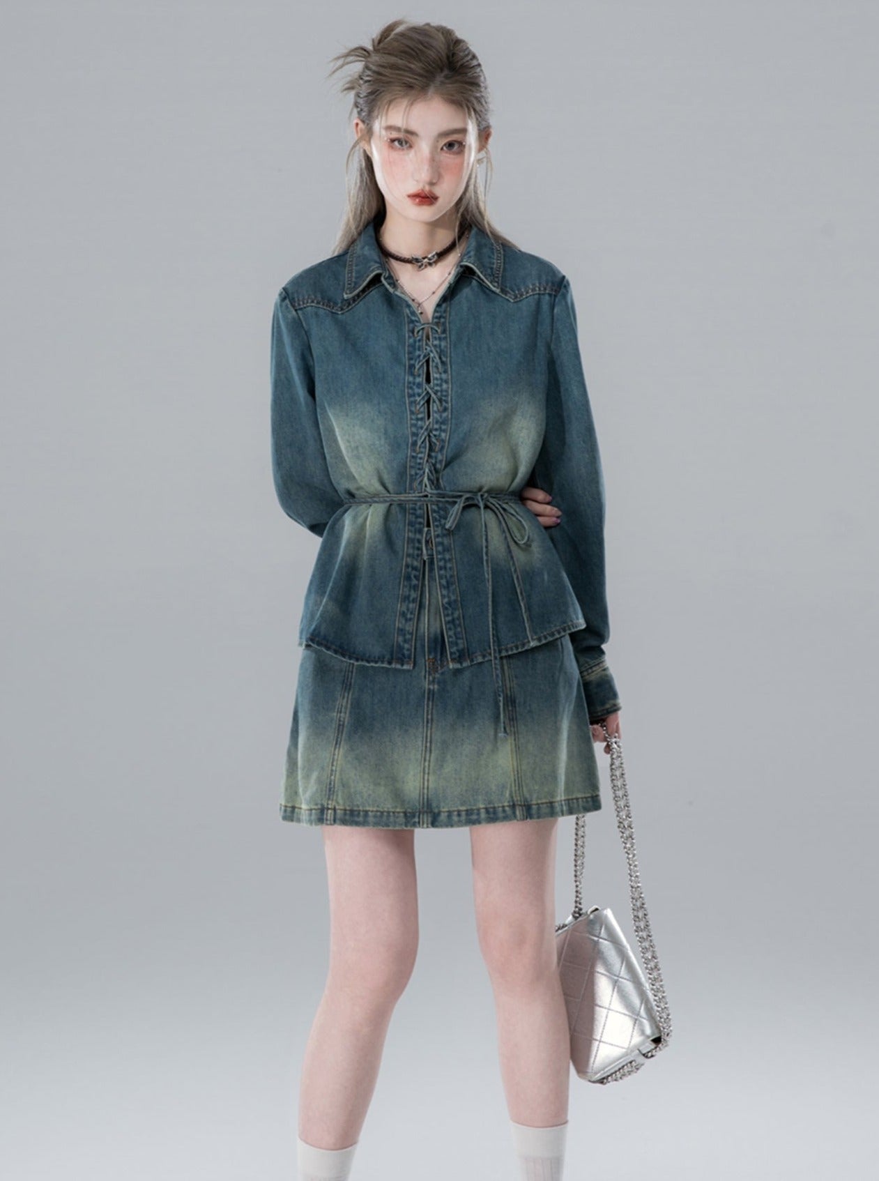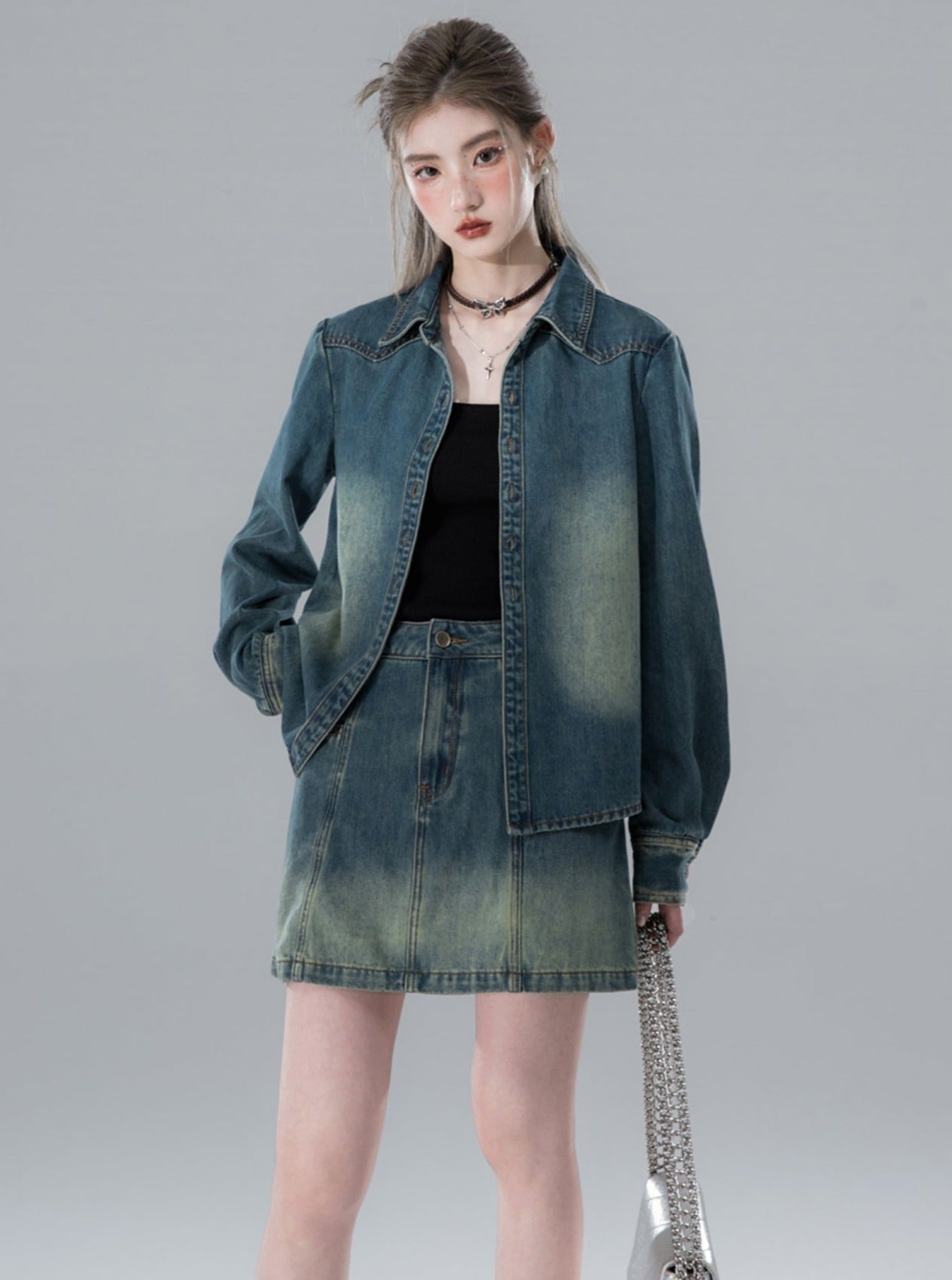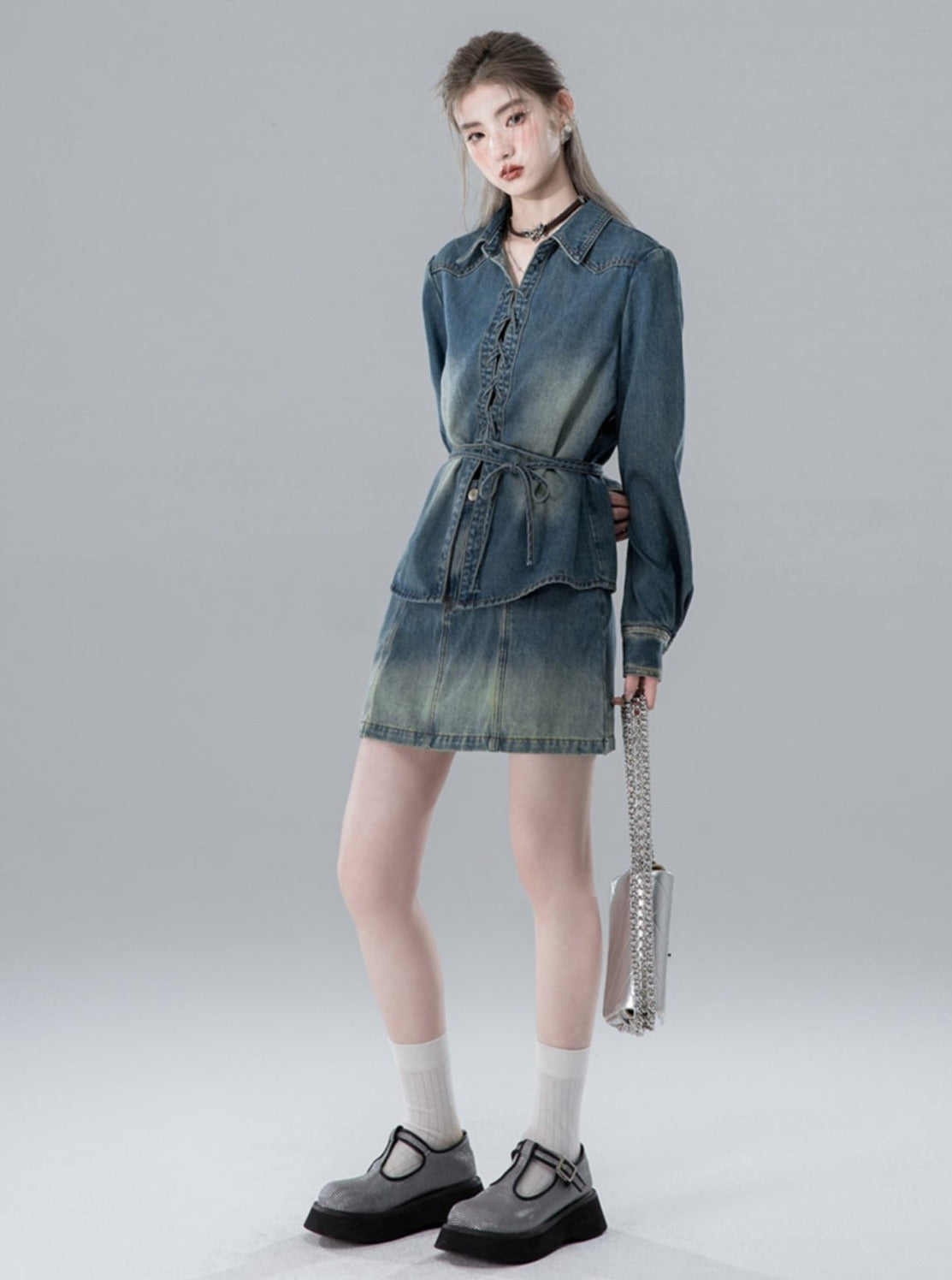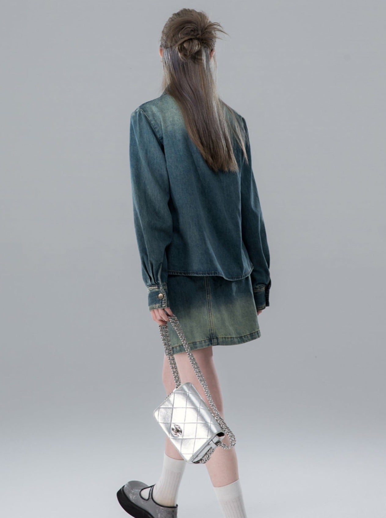 Gradient Blue Contrast-Trim Shirt Denim Set
