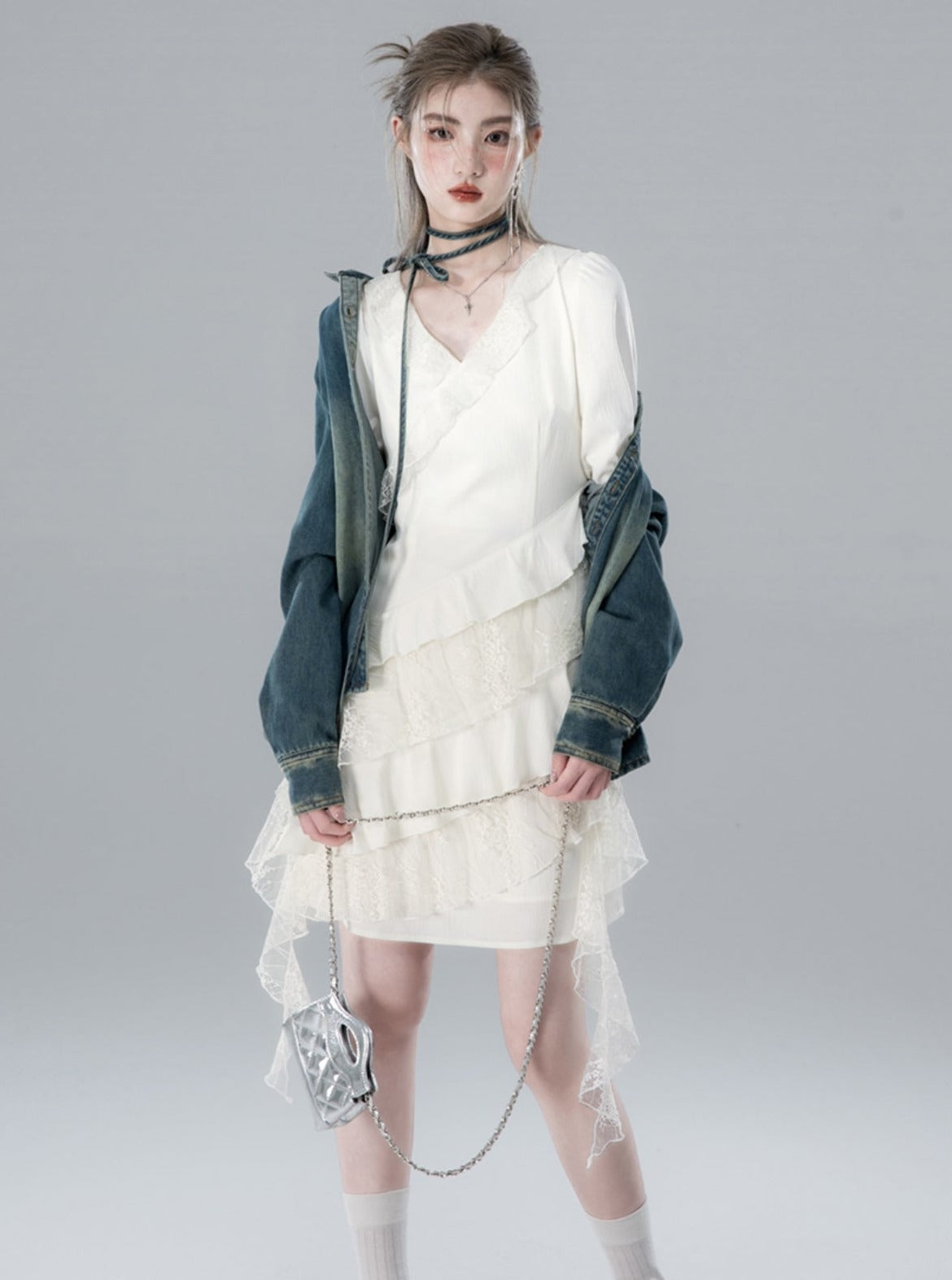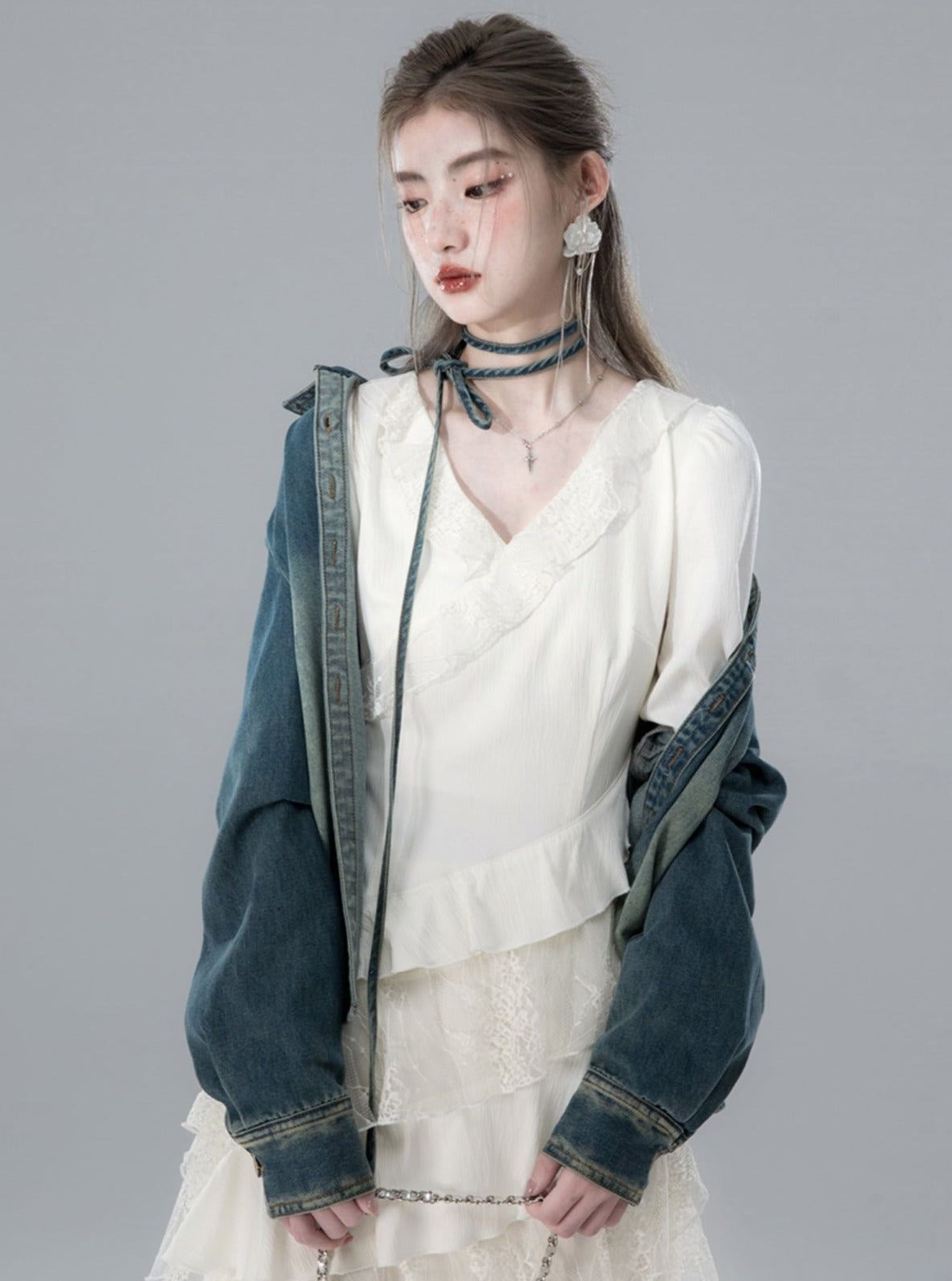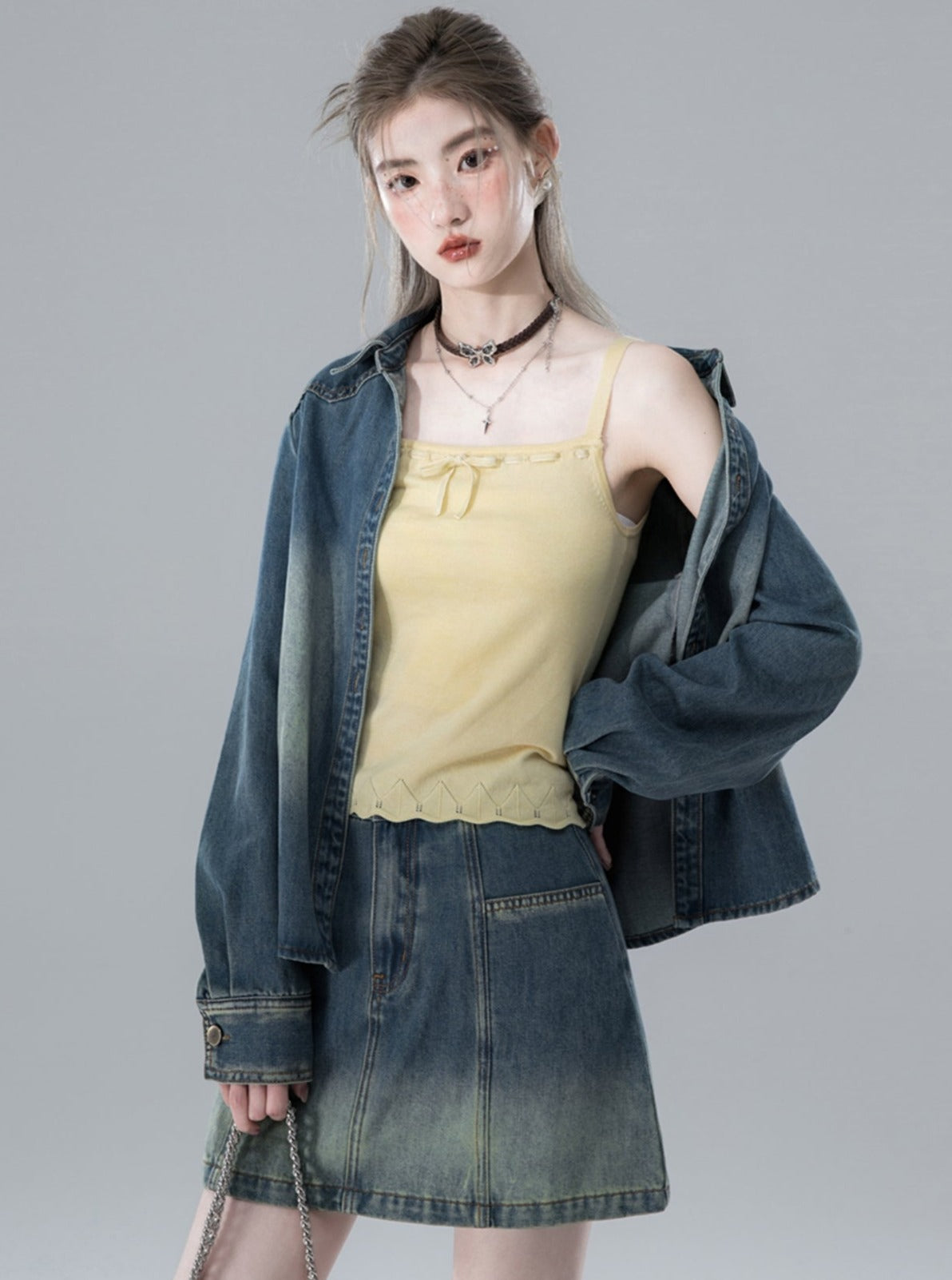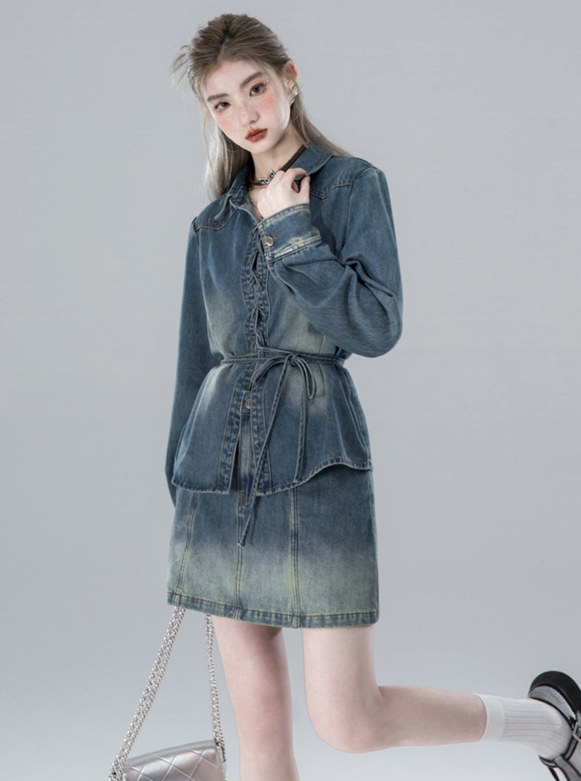 Gradient Blue Contrast-Trim Shirt Denim Set