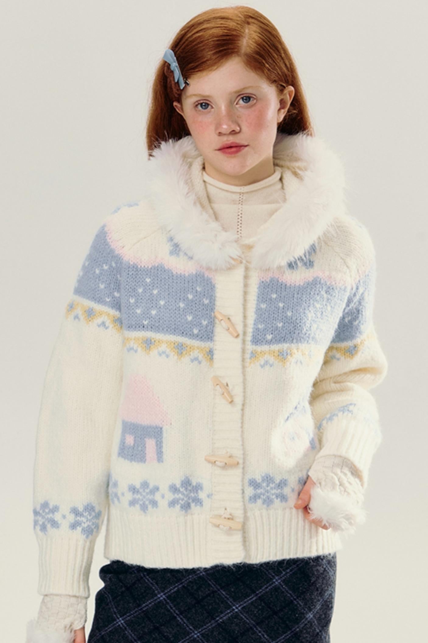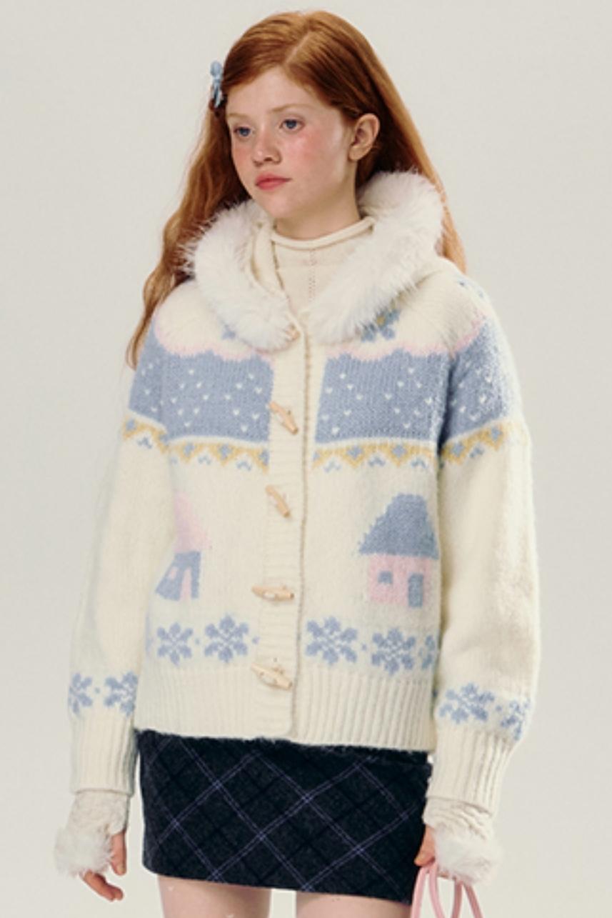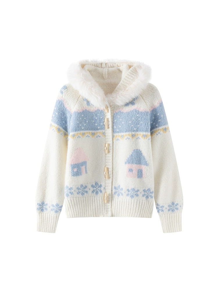 Hooded Jacquard Horn-Button Cardigan