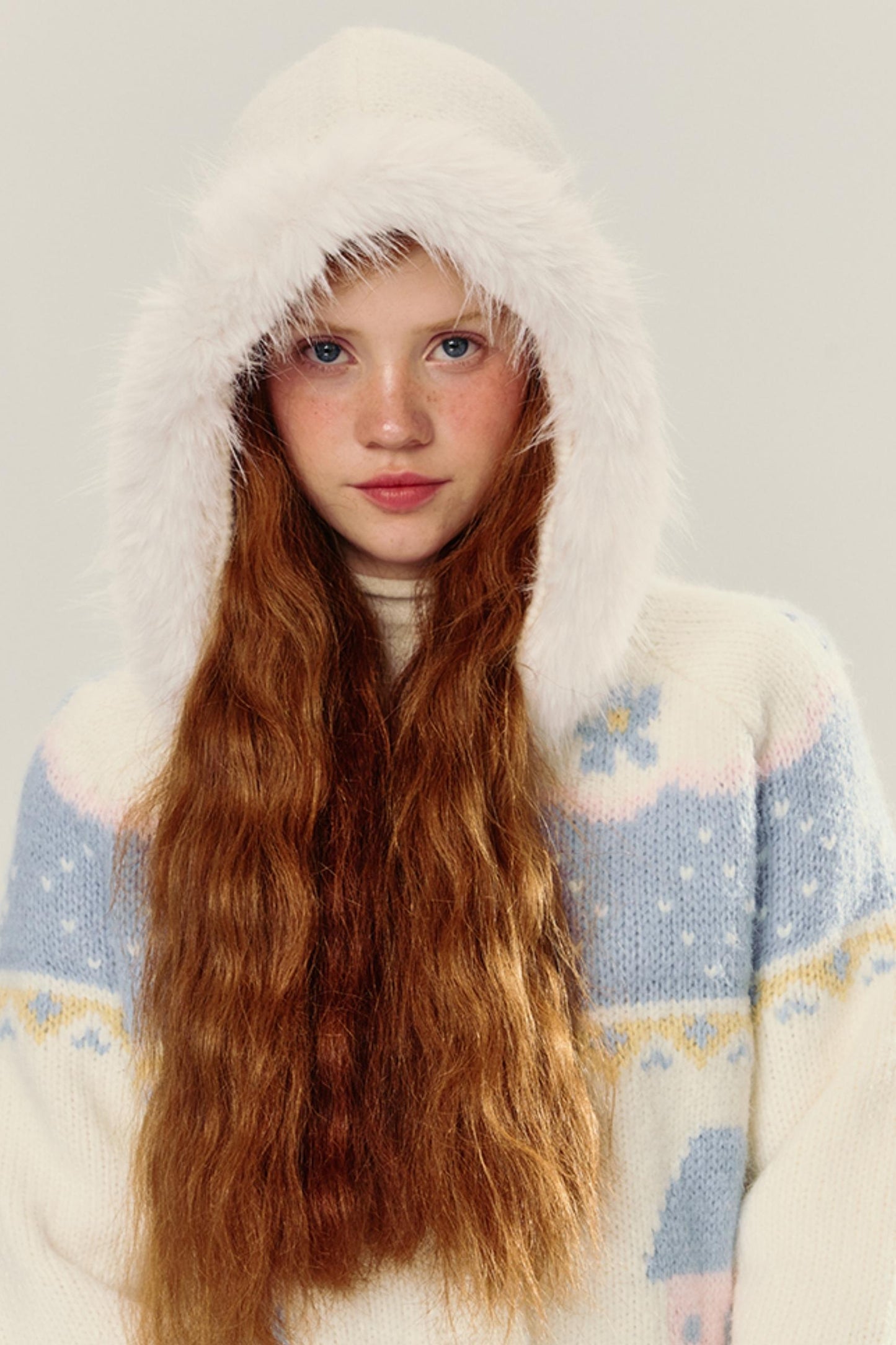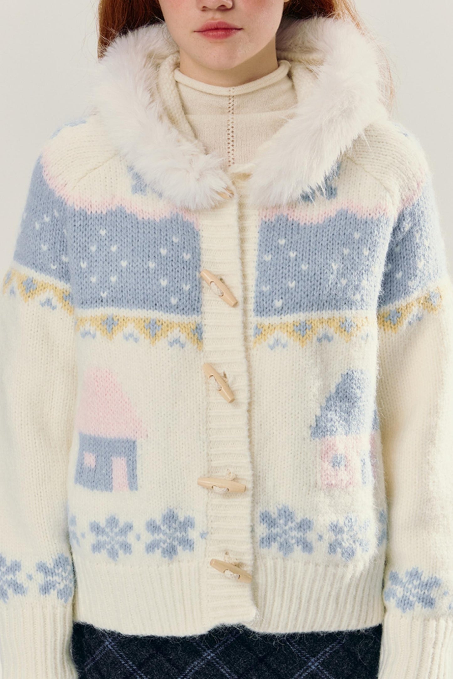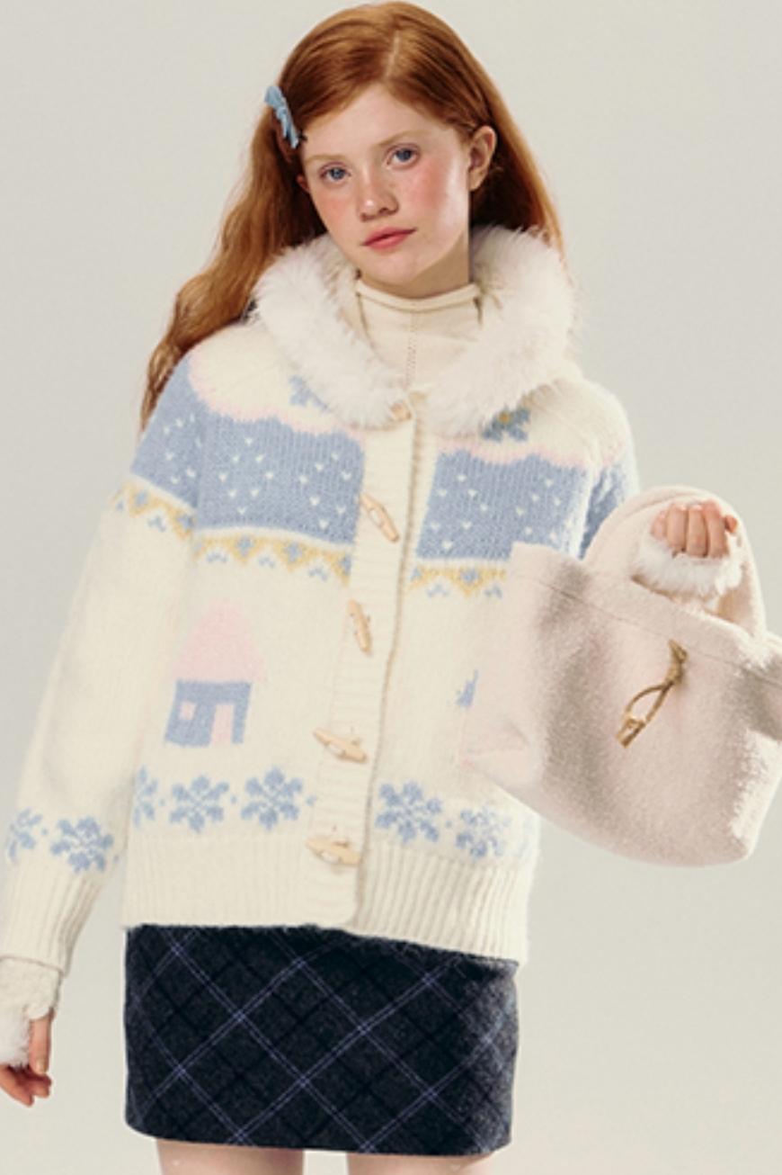 Hooded Jacquard Horn-Button Cardigan