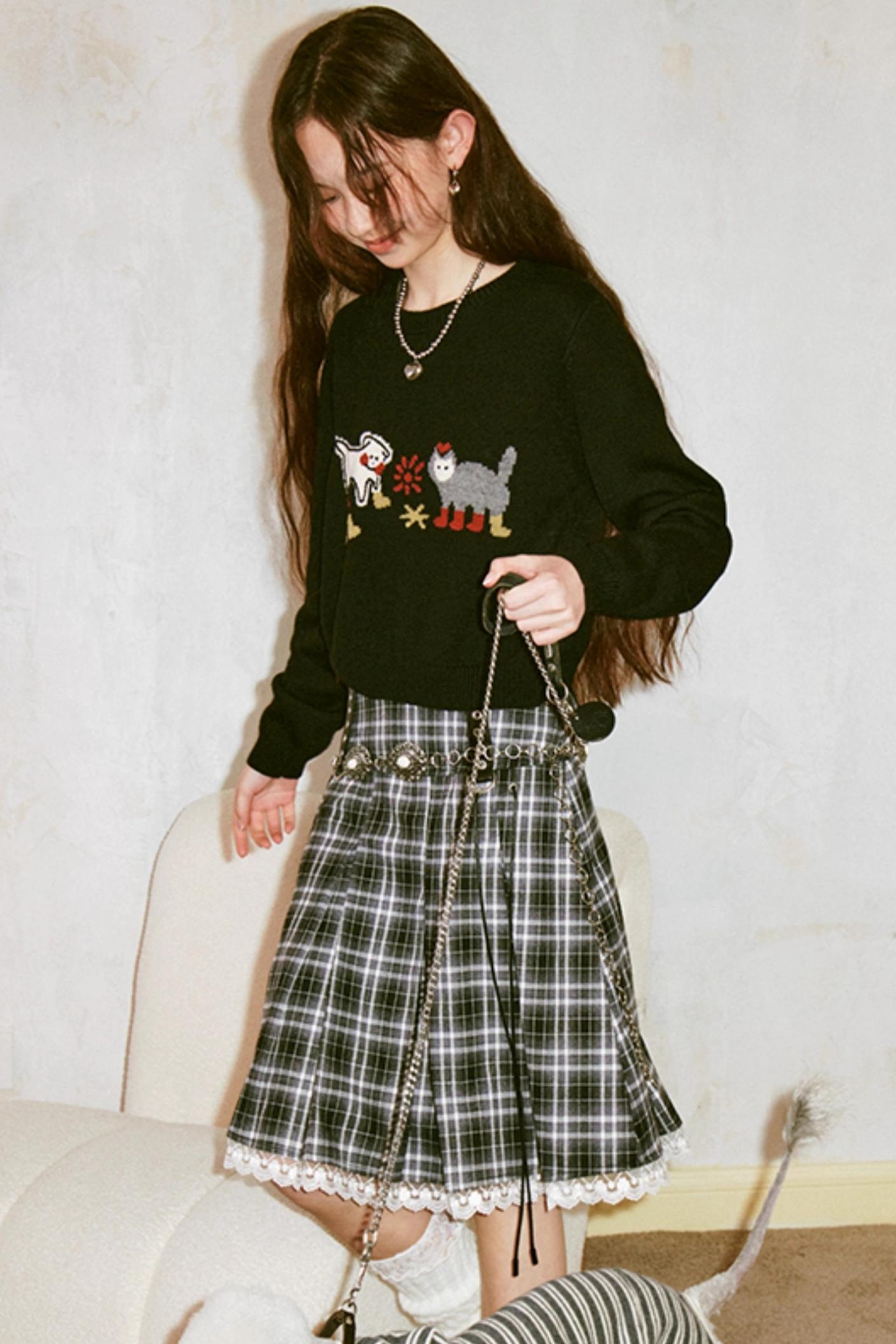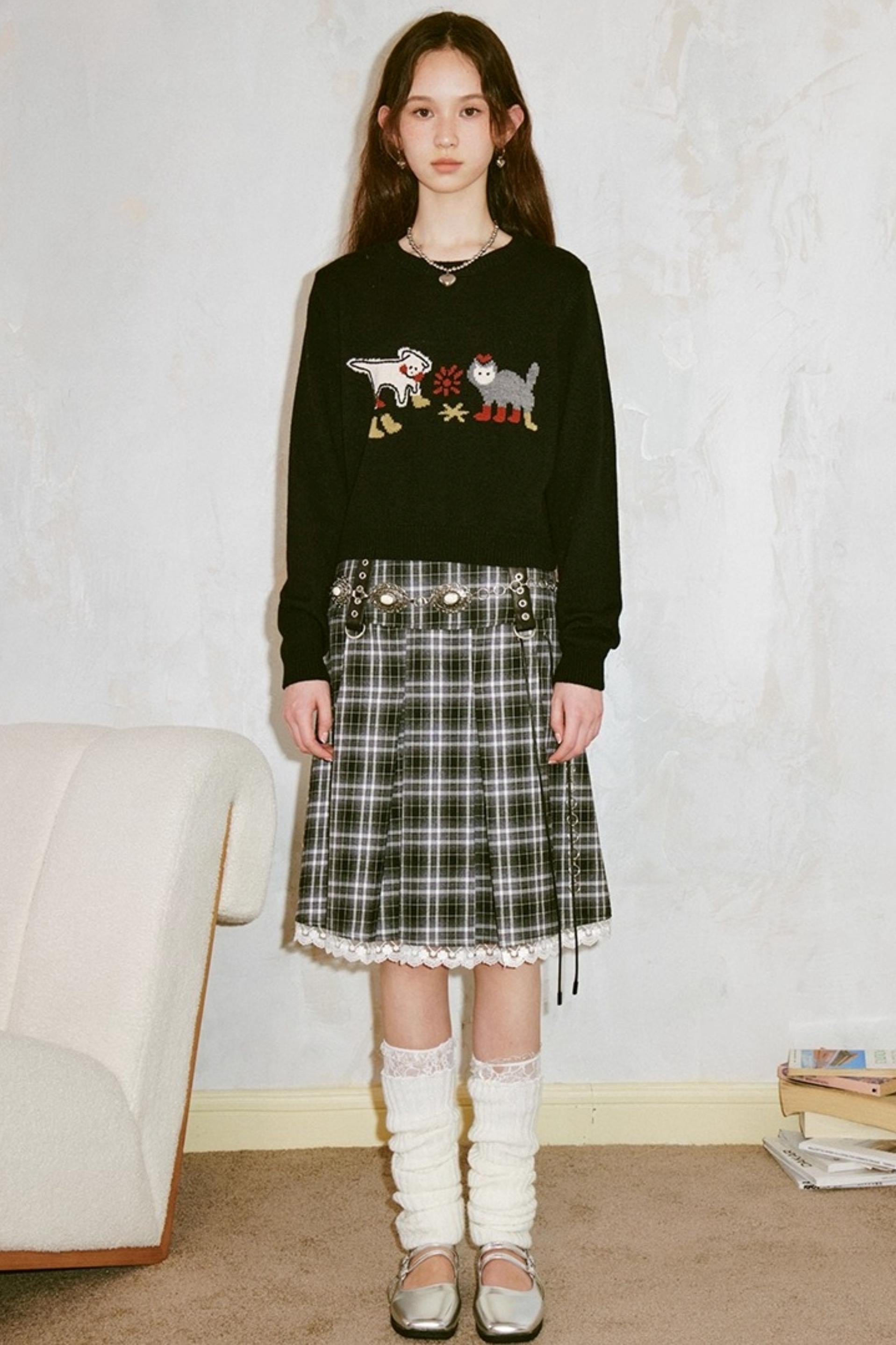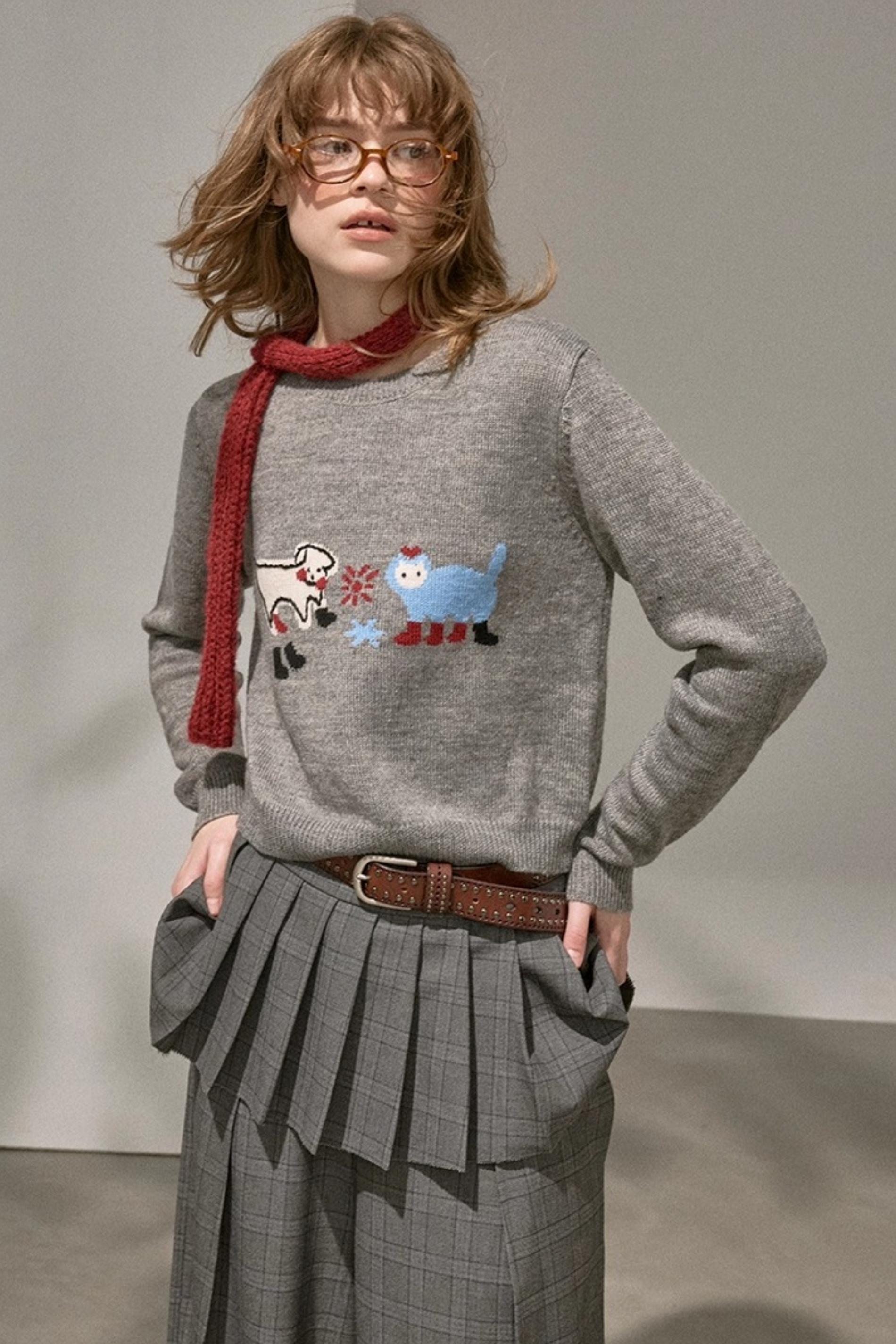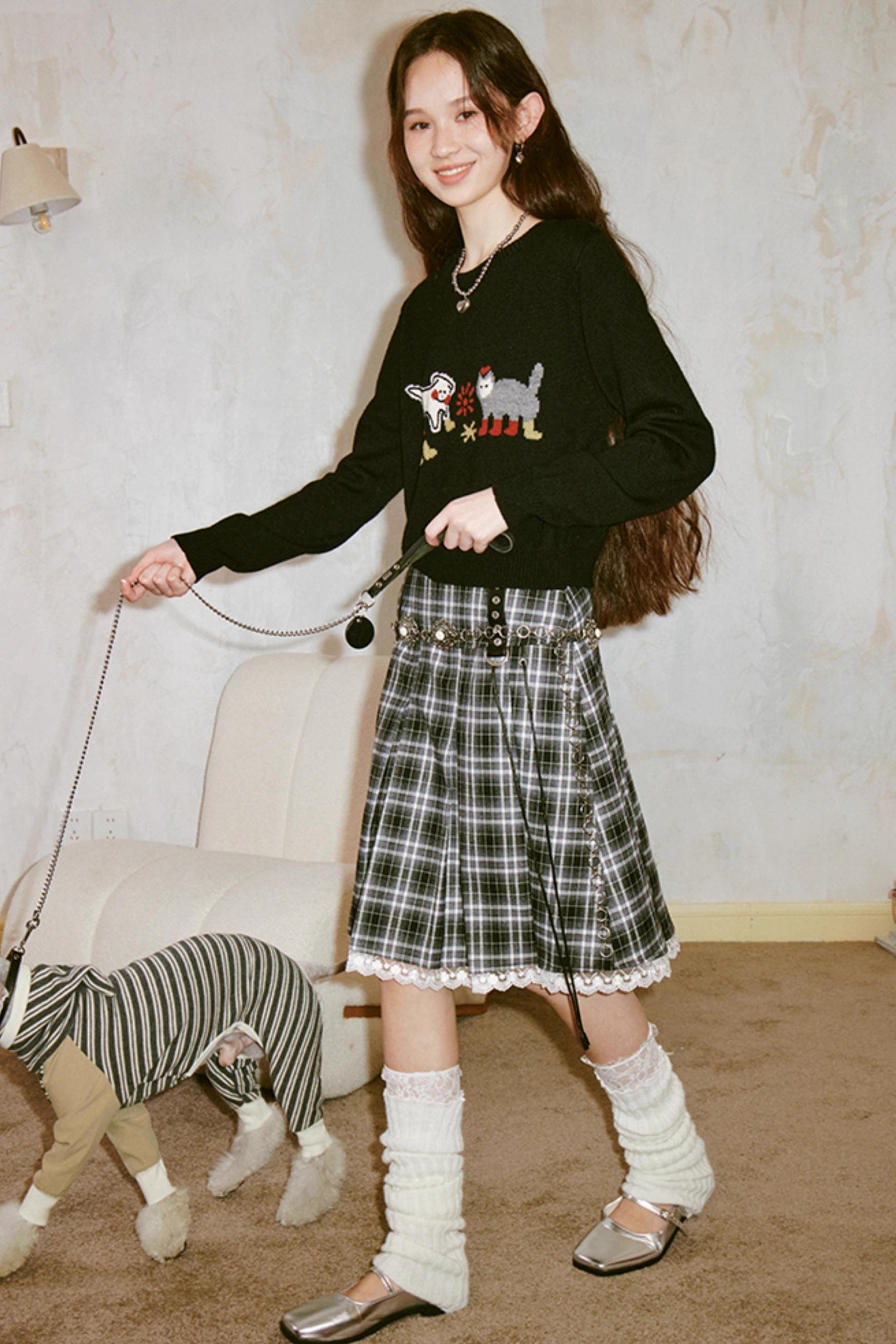 Kitten And Puppy Embroidered Wool Blend Knit Sweater