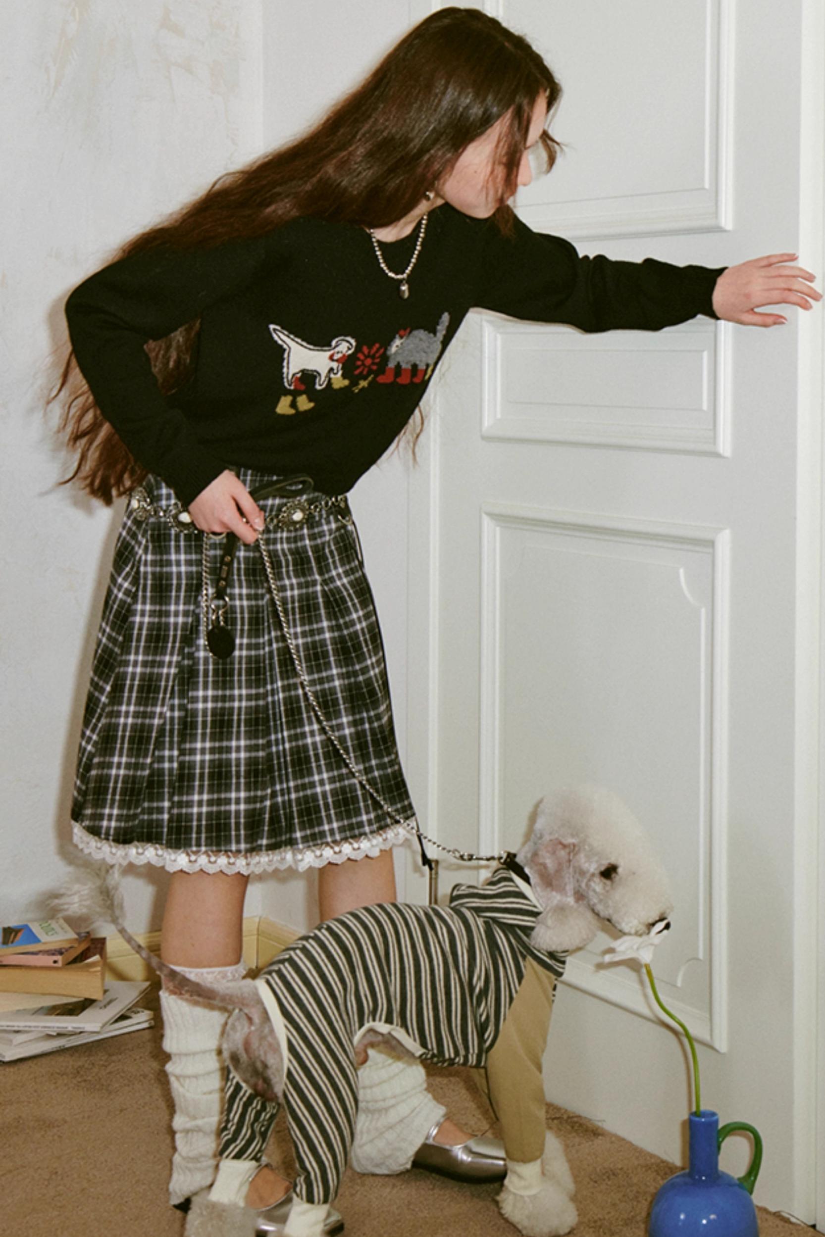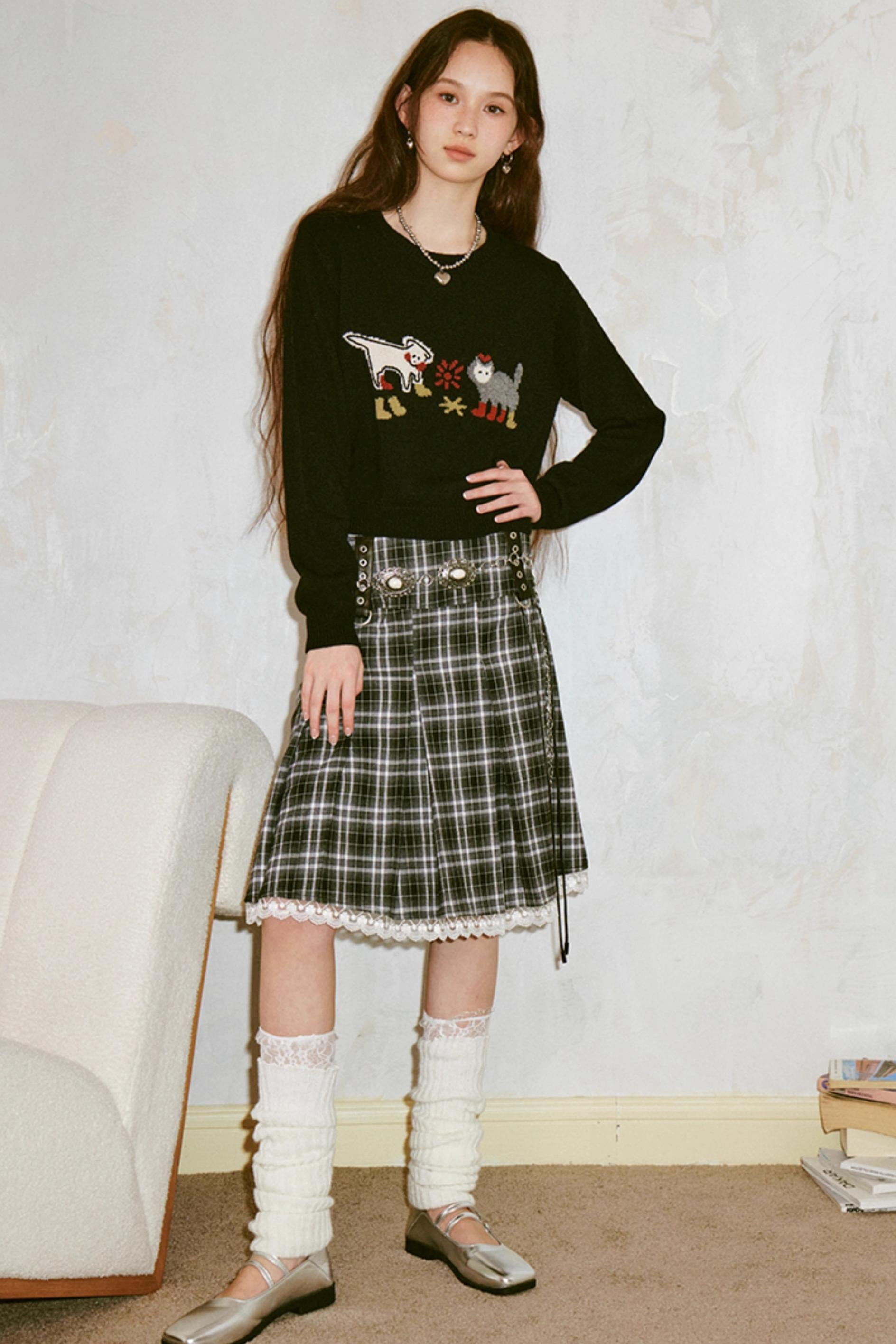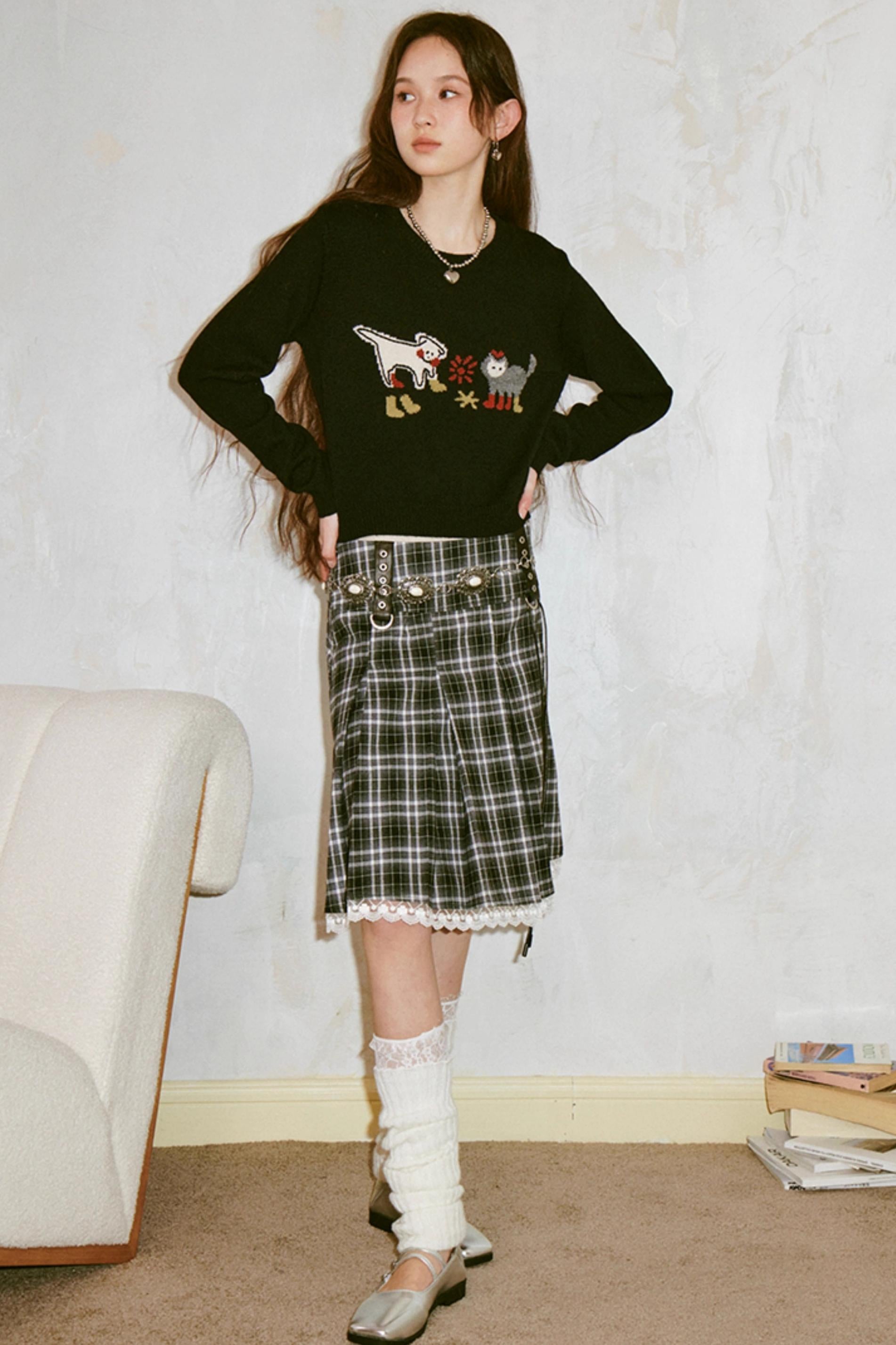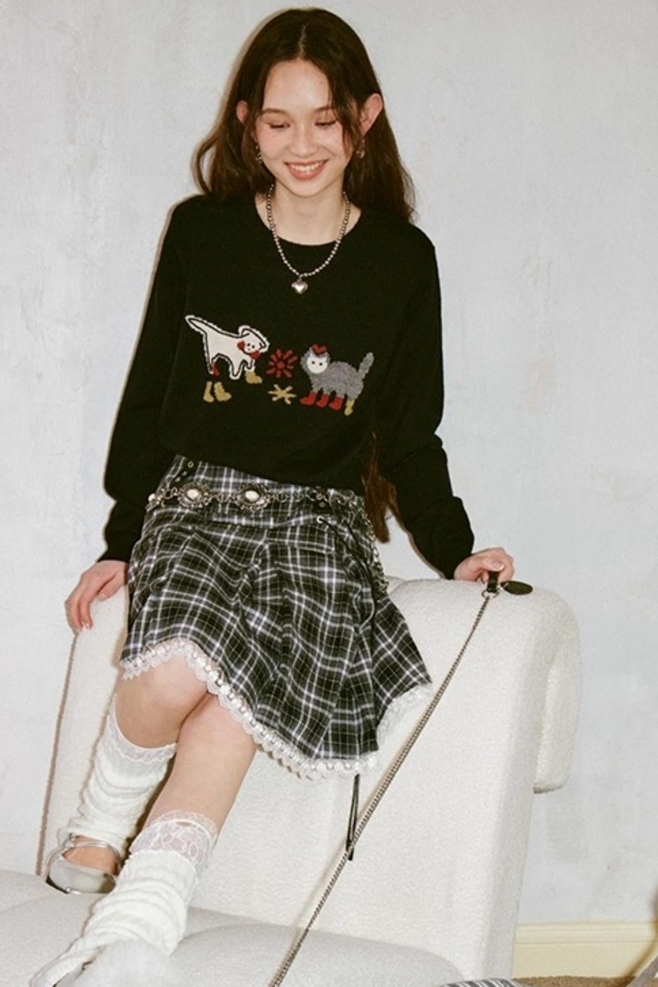 Kitten And Puppy Embroidered Wool Blend Knit Sweater