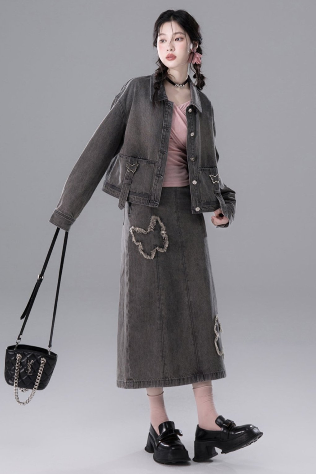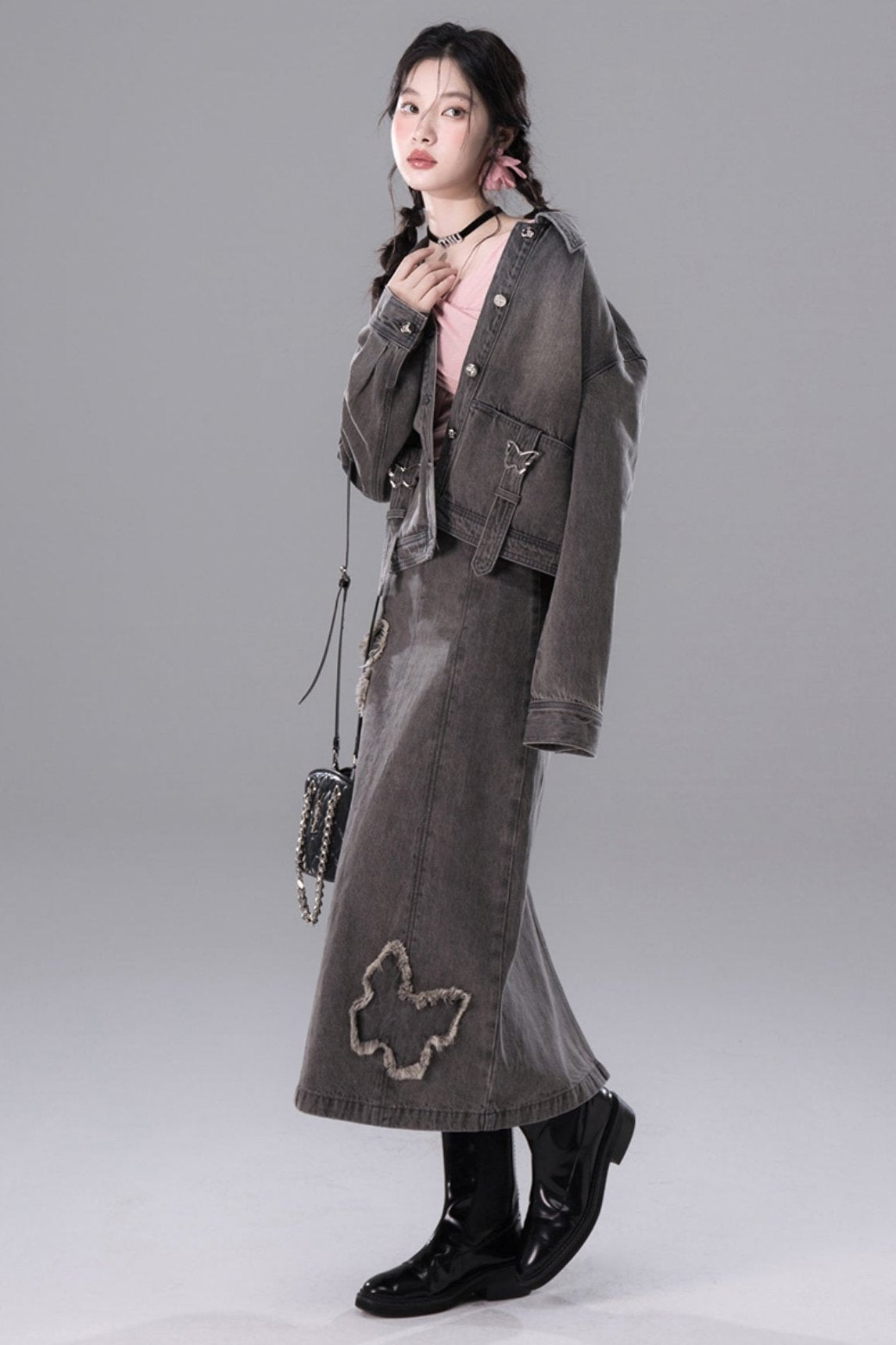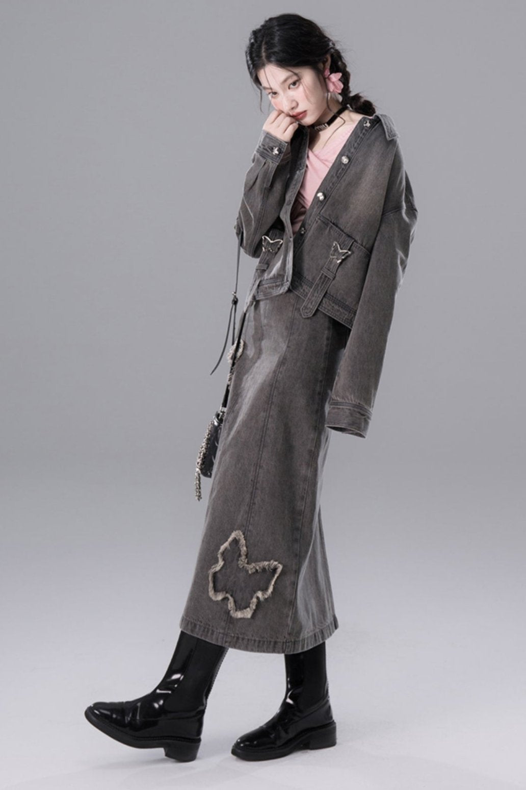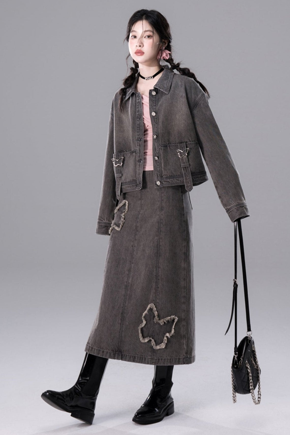 Light Gray Butterfly Denim Jacket Skirt Set-Up