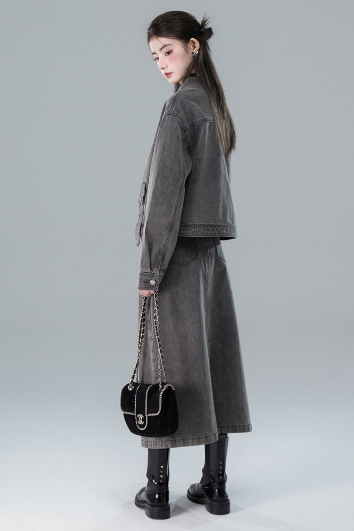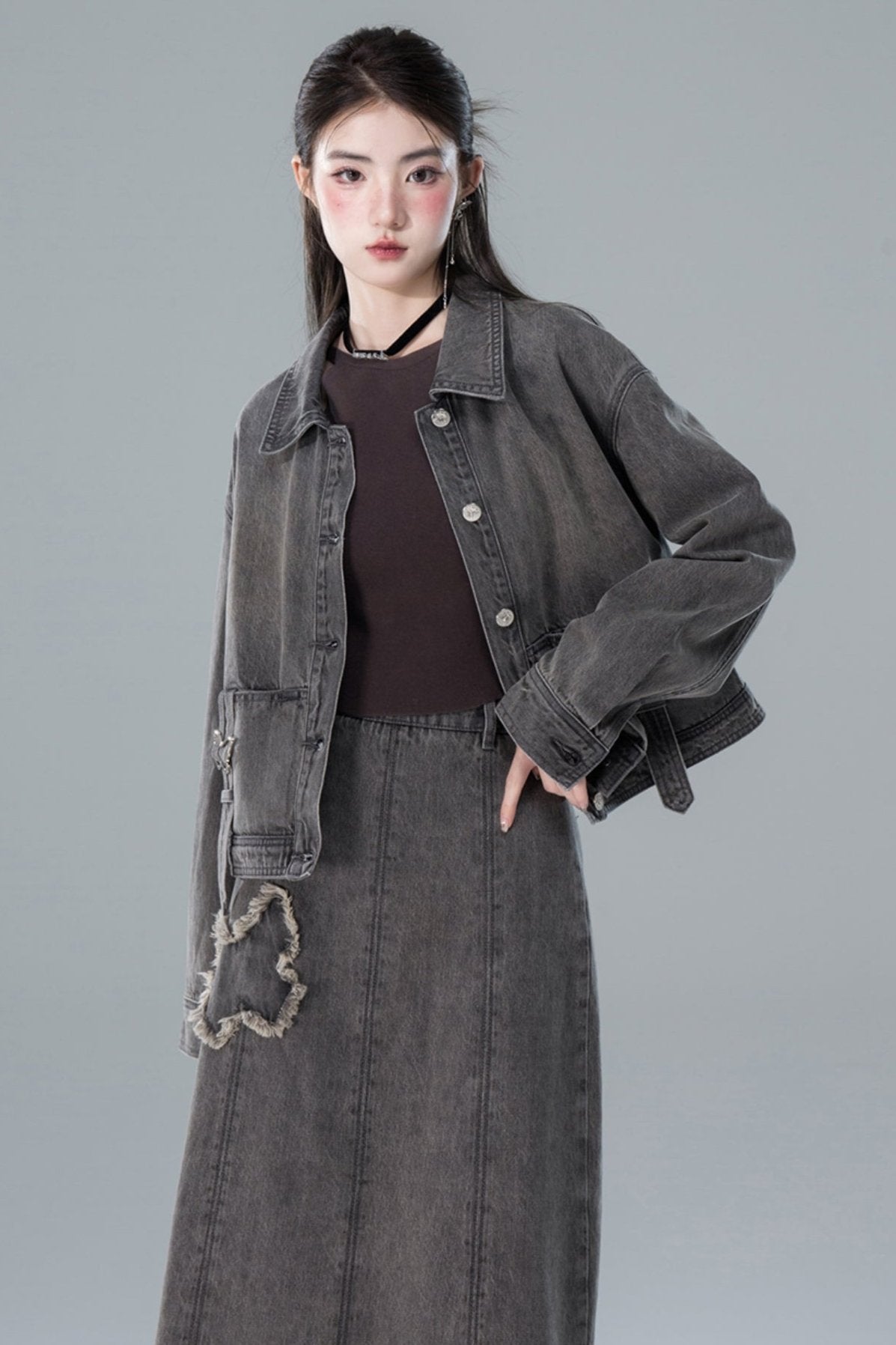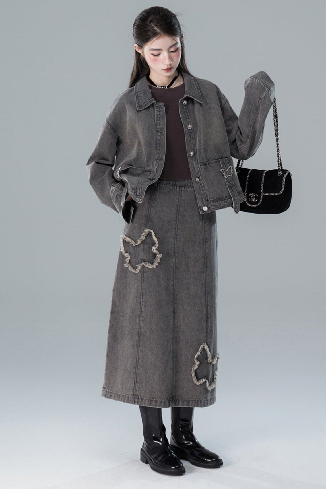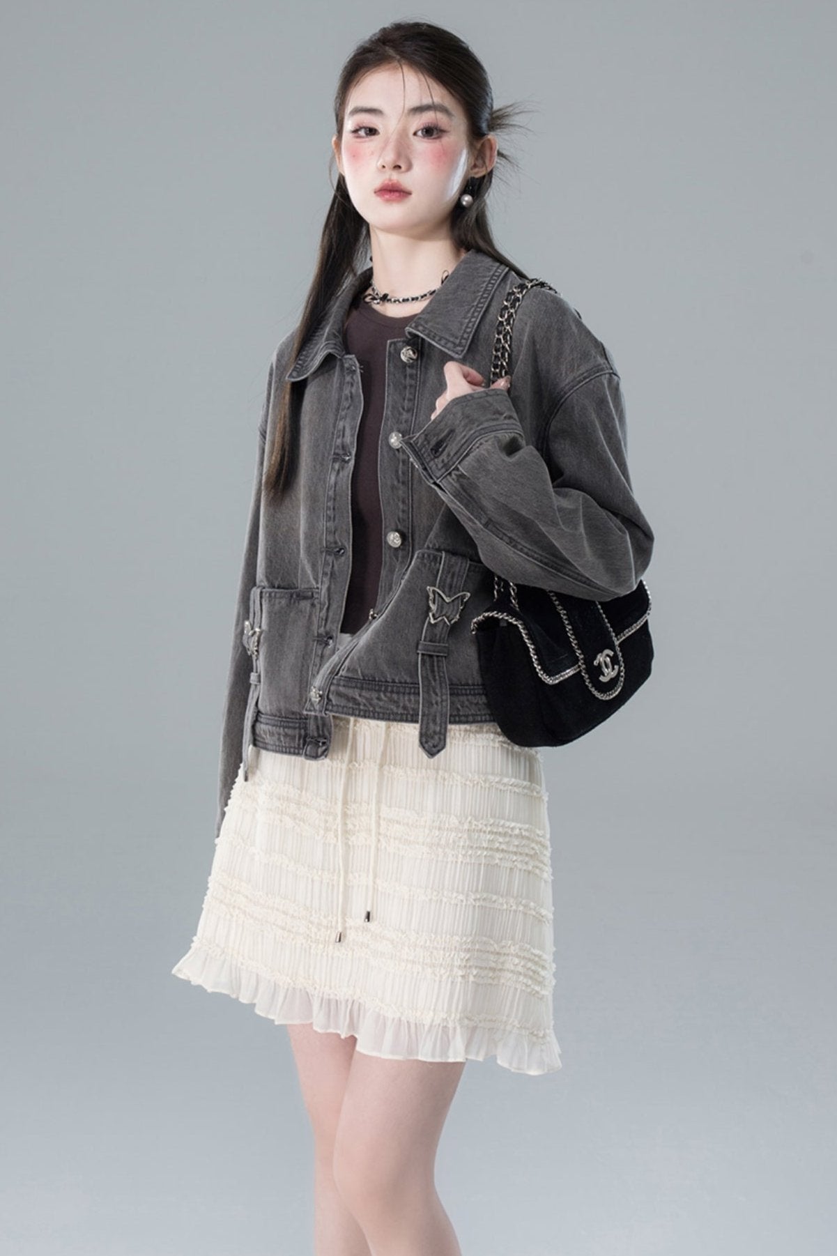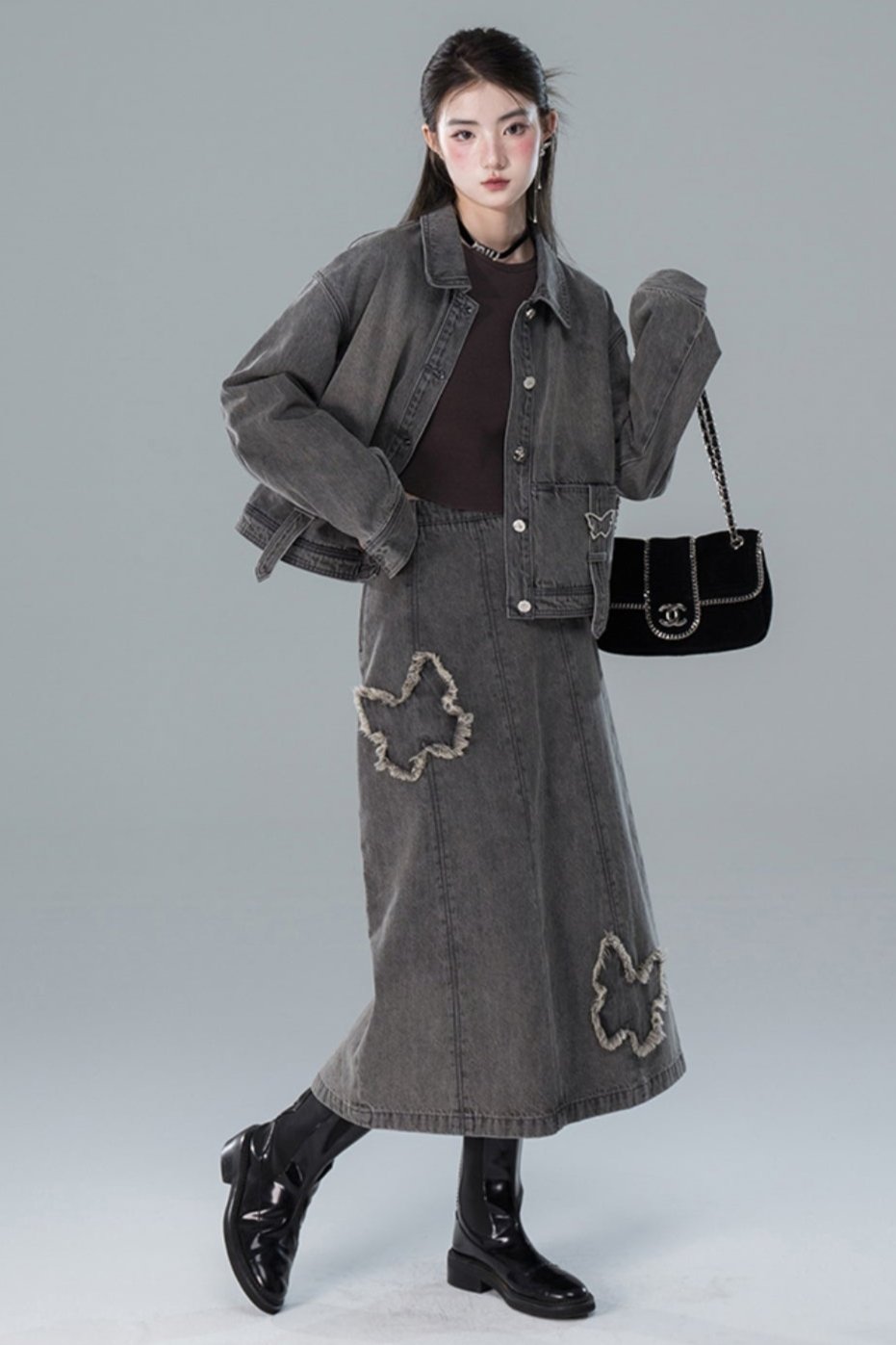 Light Gray Butterfly Denim Jacket Skirt Set-Up