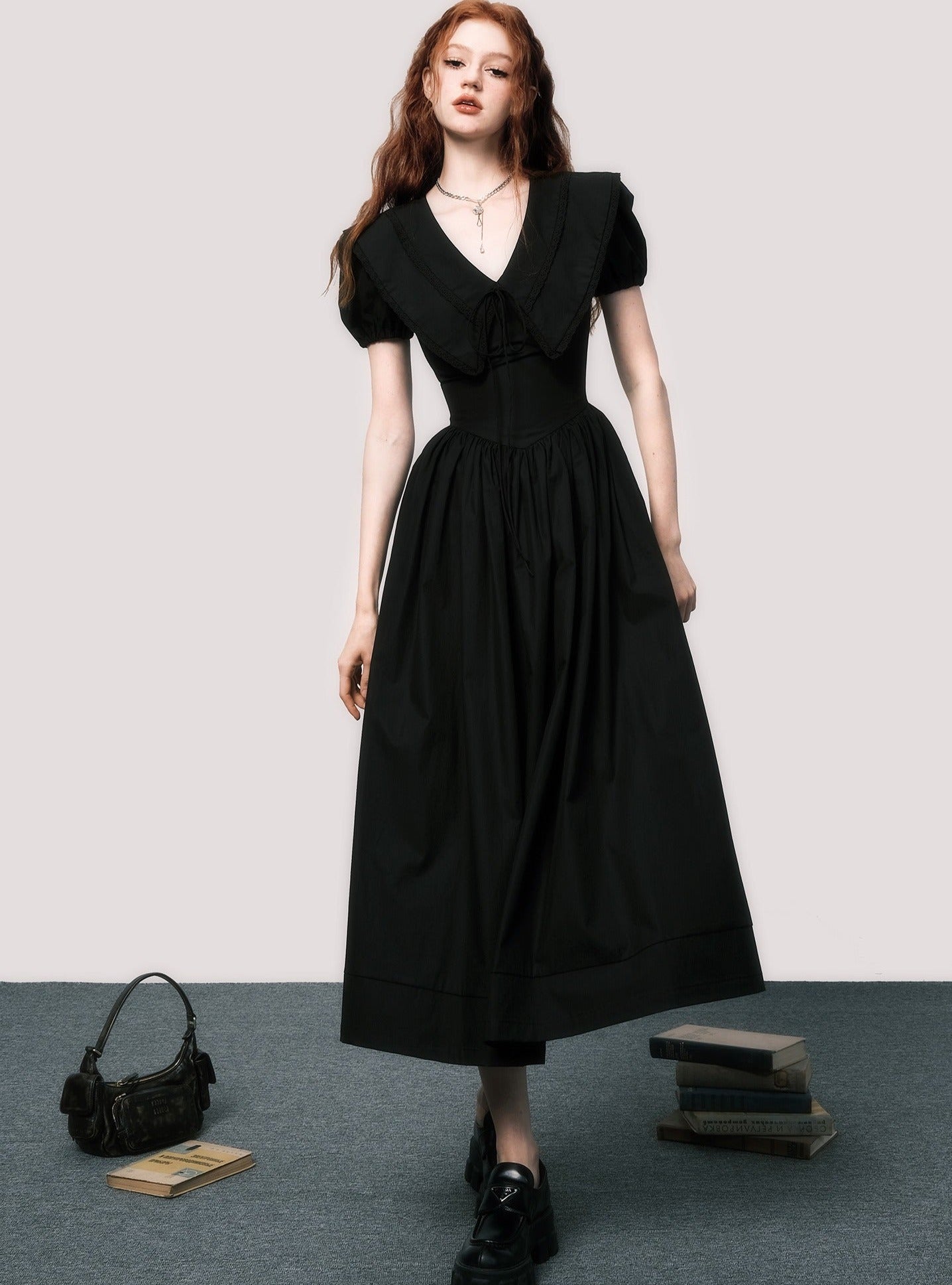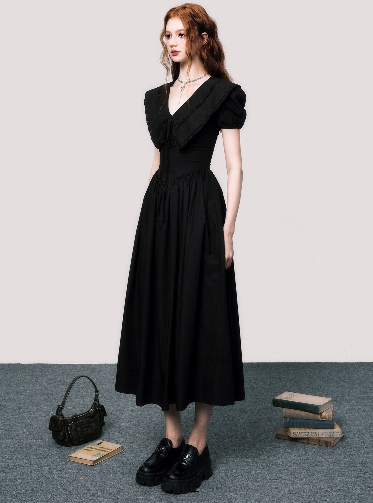 V-neck puff sleeves black dress