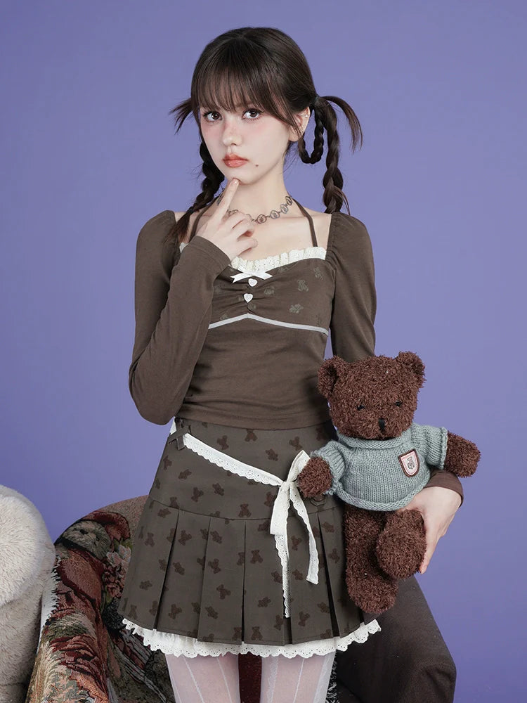 Original Brown Bear Print Pleated Skirt