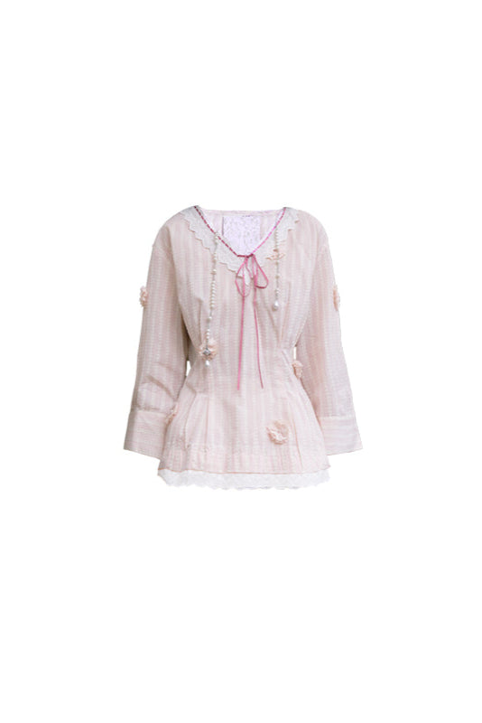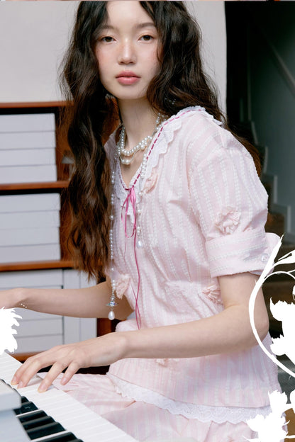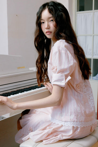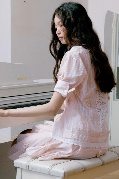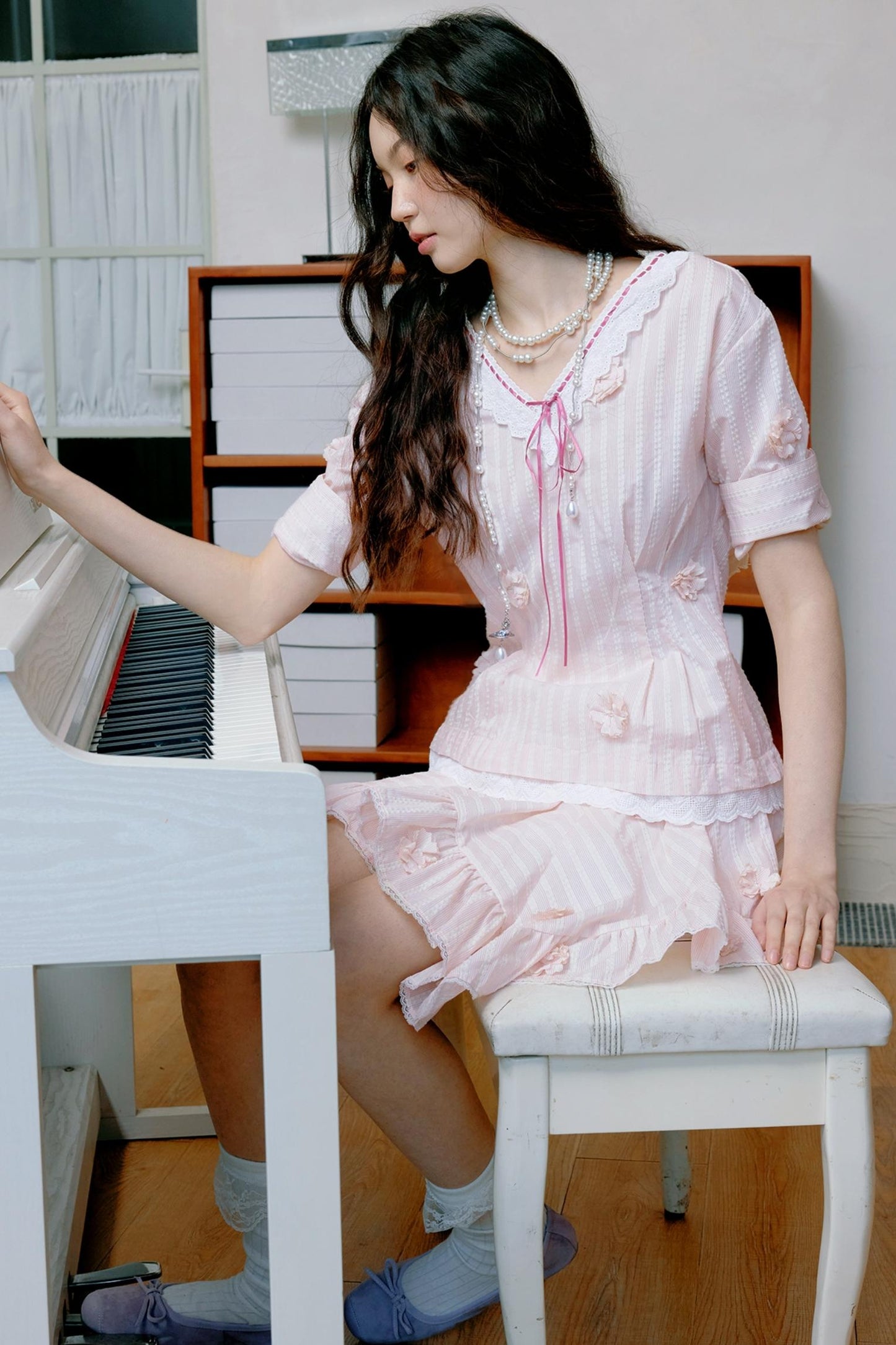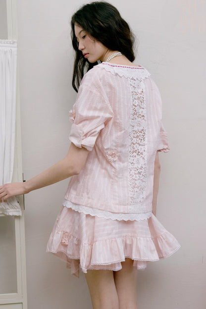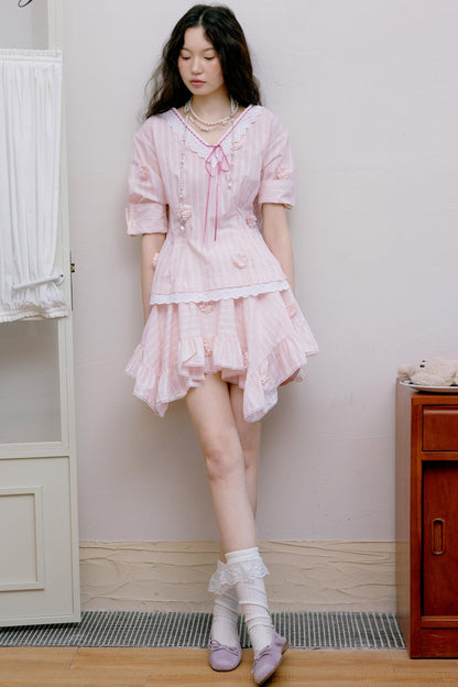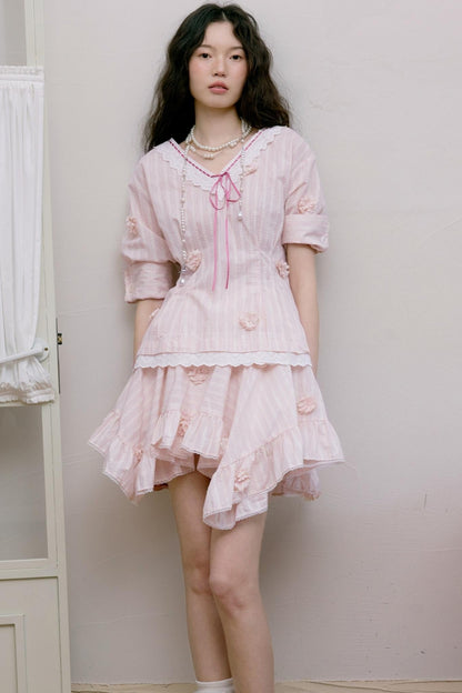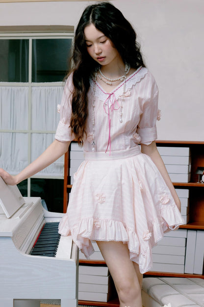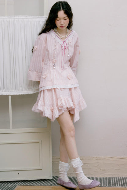 Pale Pink Striped Shirt & Irregular Skirt Set-Up