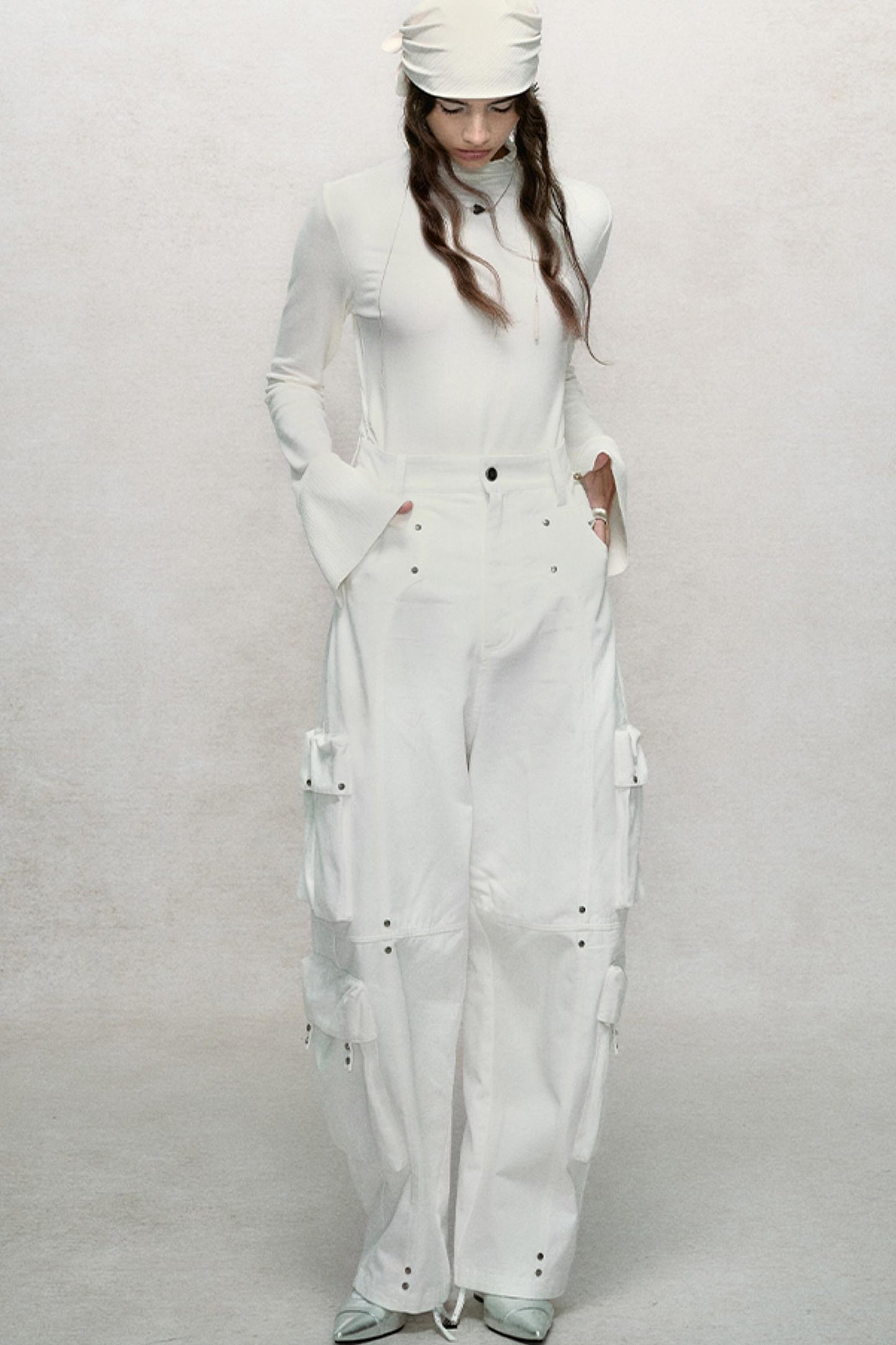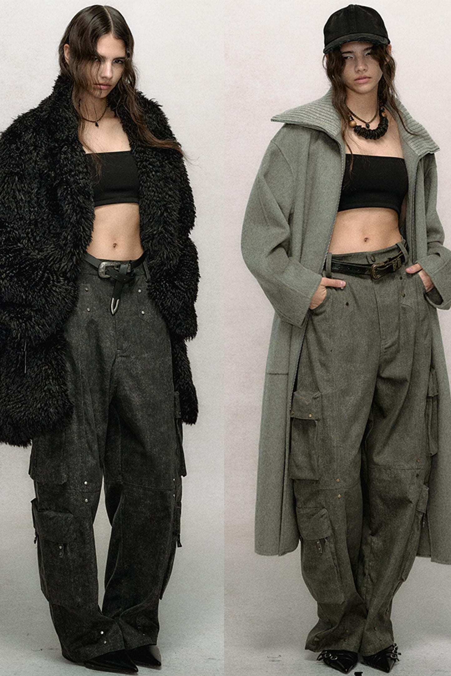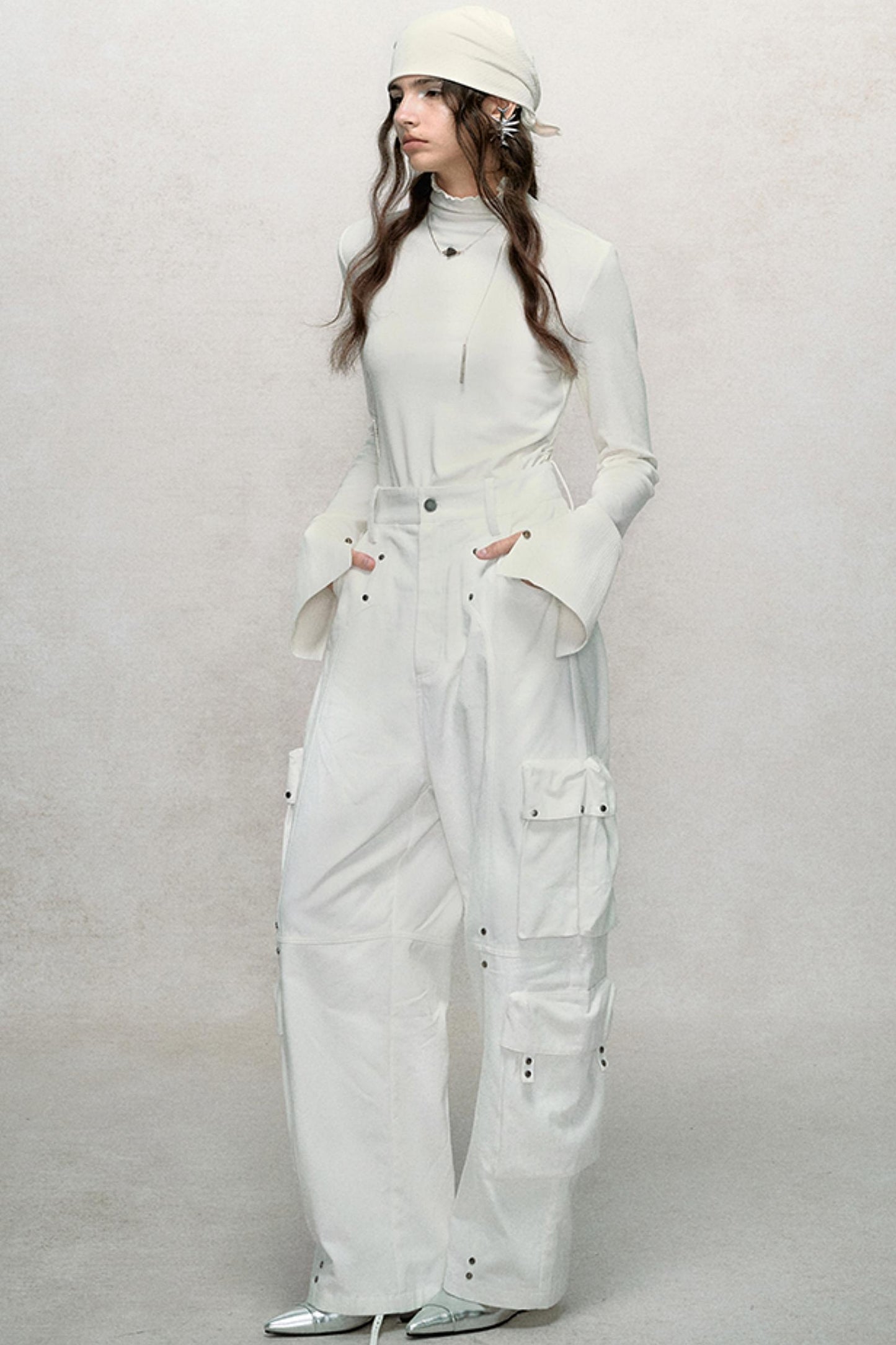 | サイズ | ウエスト (cm/in) | ヒップ (cm/in) | 着丈 (cm/in) | 裾幅 (cm/in) | 太もも周り (cm/in) |