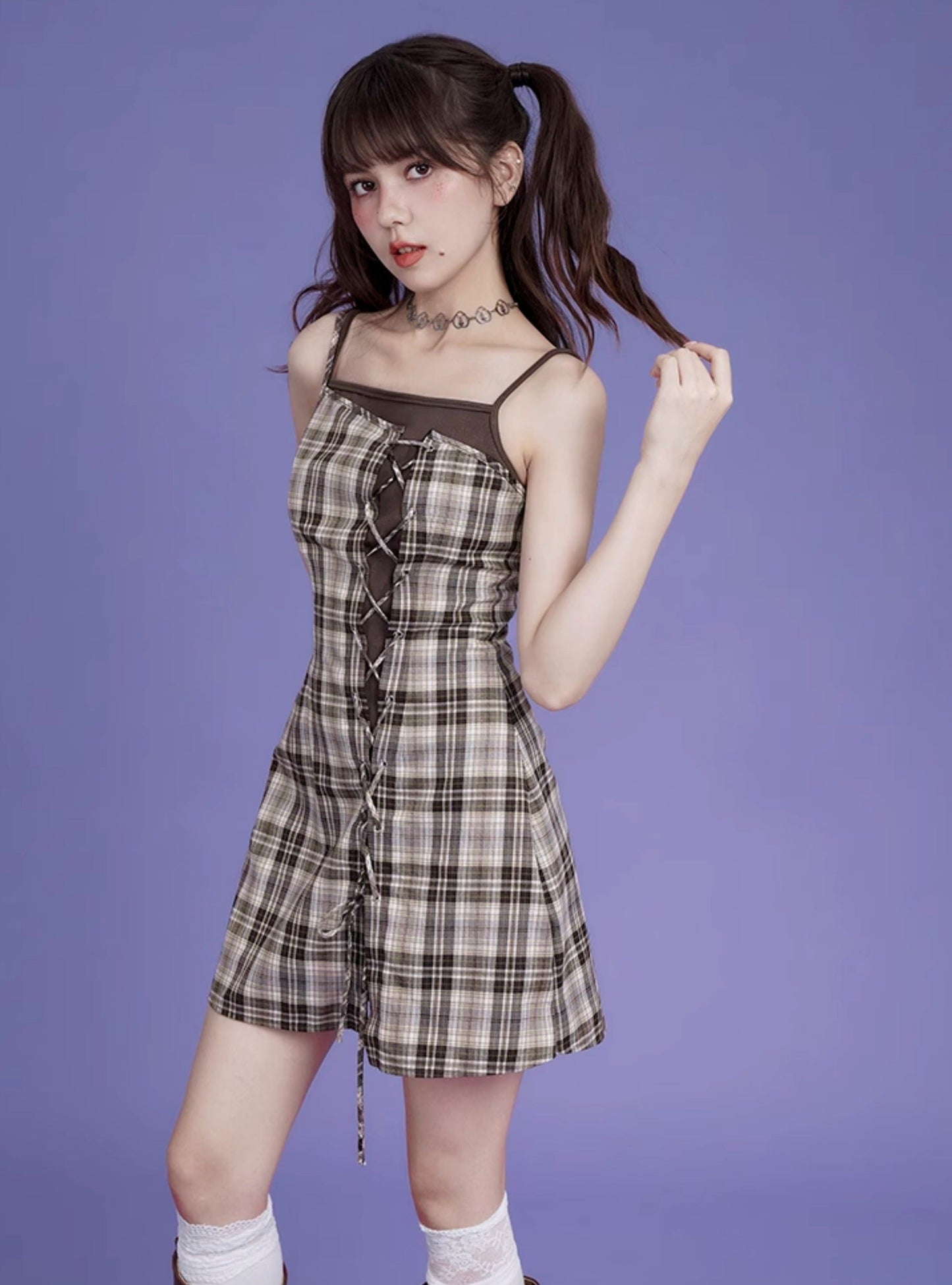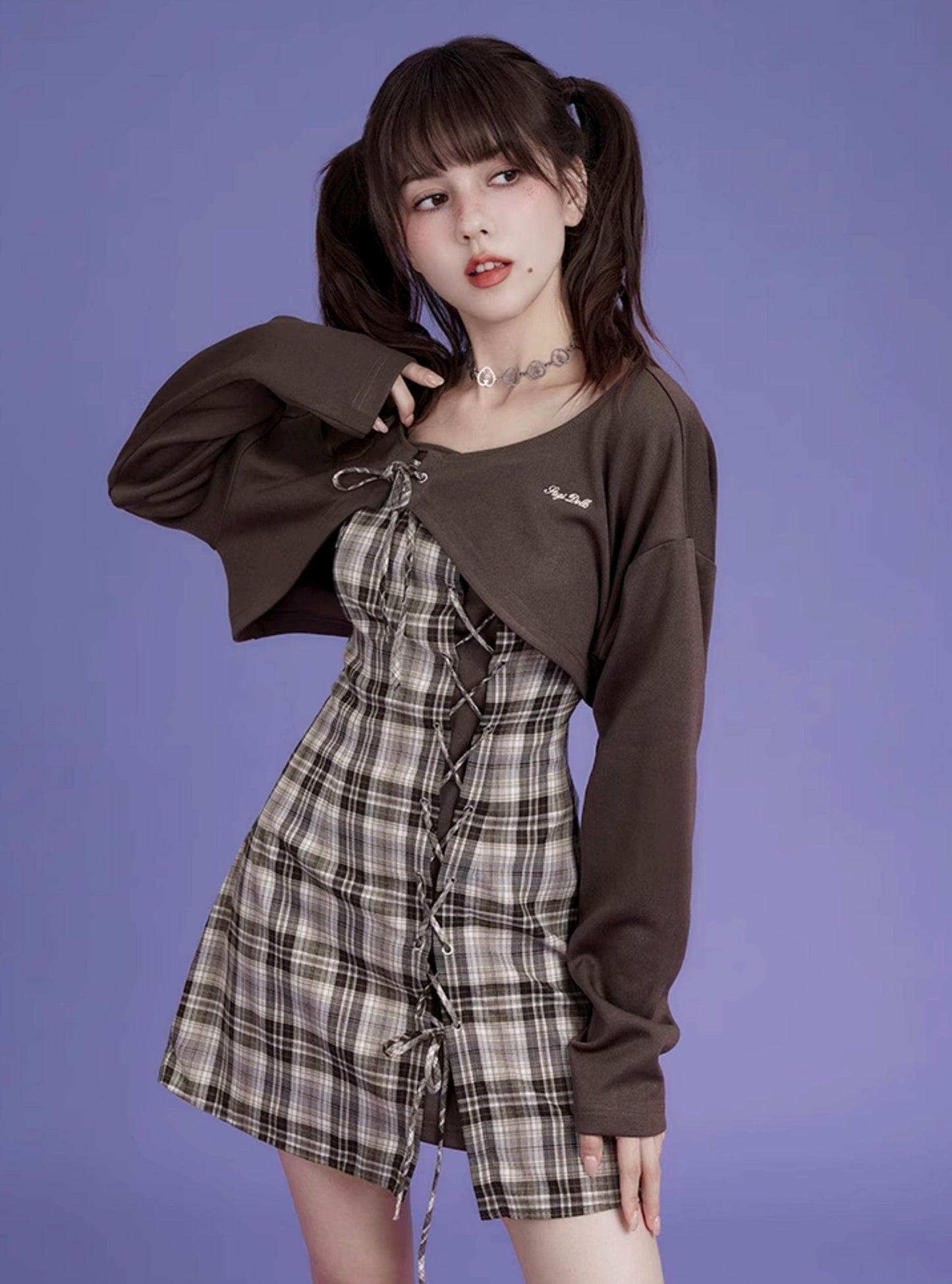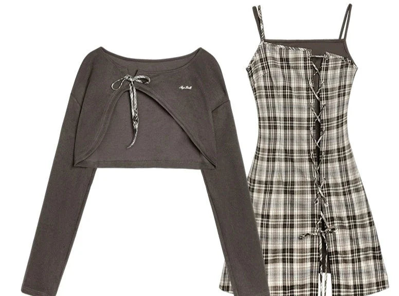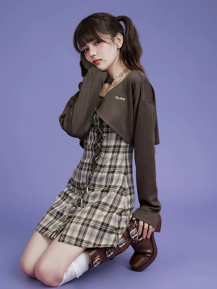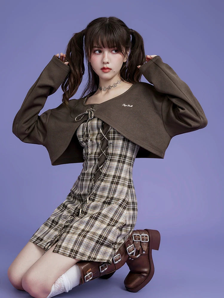 Brown checkered cardigan two-piece Set