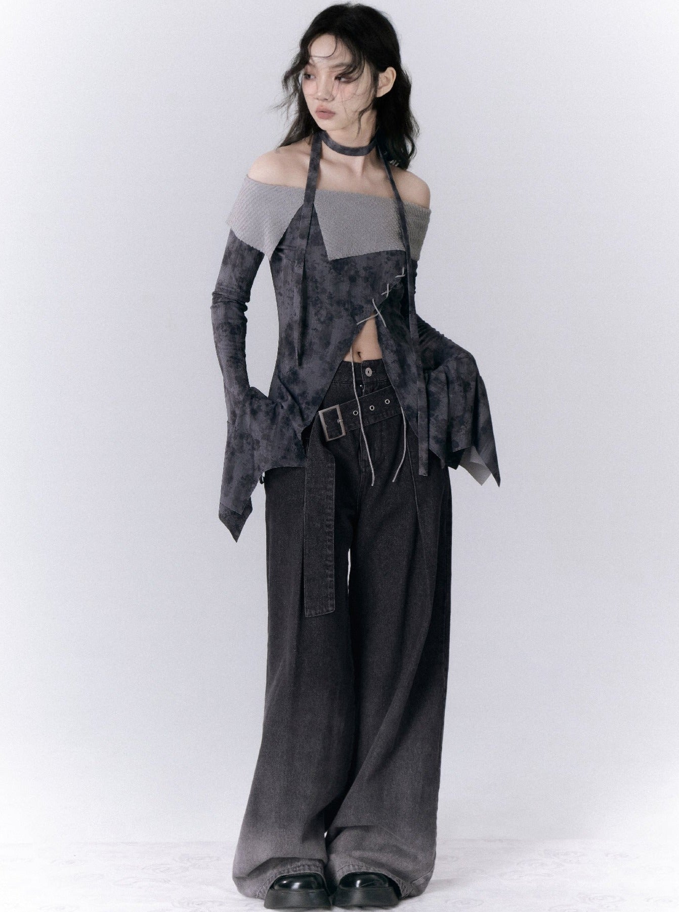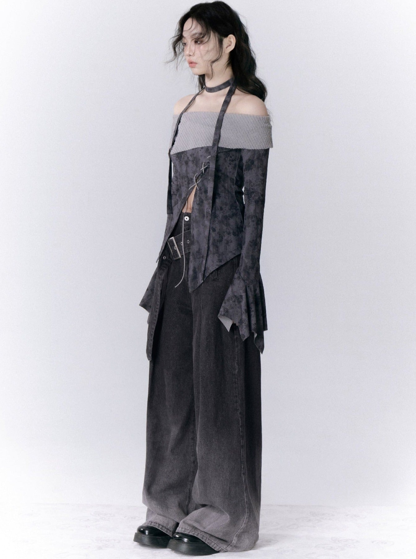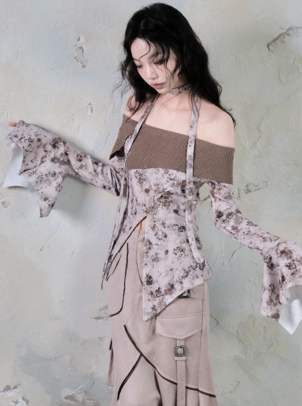 Straight Shoulder Cross Print Top